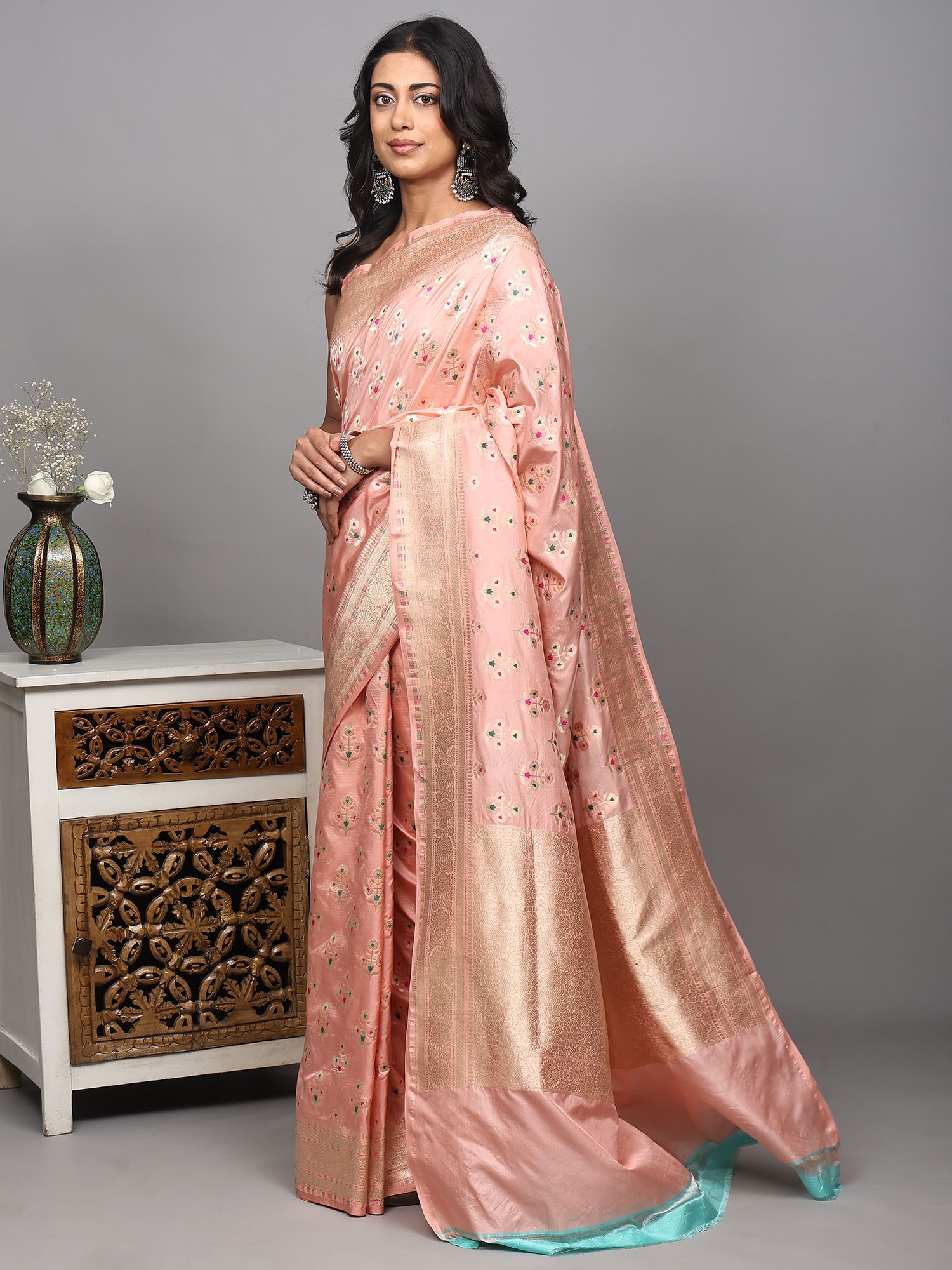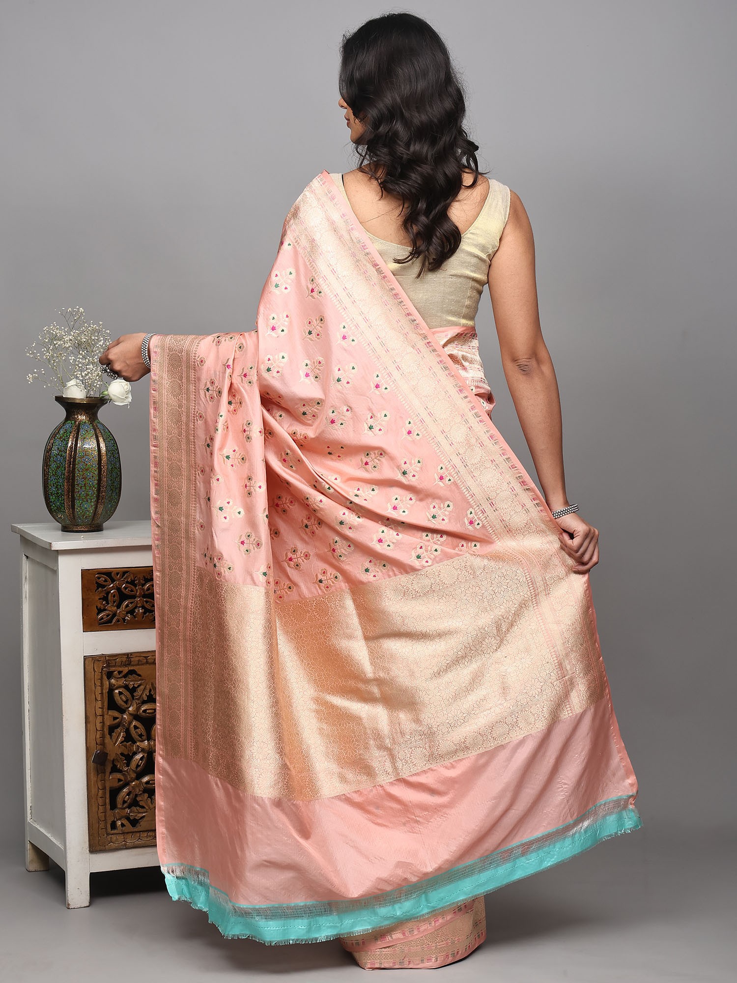 The true magic of this saree lies in its elaborate brocaded Meenakari floral motifs. These vibrant, multi-colored designs are meticulously woven into the fabric, creating a stunning contrast against the soft silk. The Meenakari technique, renowned for its intricate enamel work and rich color palette, is expertly translated into silk weaving, bringing life and depth to each floral bloom. The delicate dance of pink, green, and gold threads forms a tapestry of nature's beauty, adorning the saree with an unparalleled level of detail. ––––––––––––––––––
