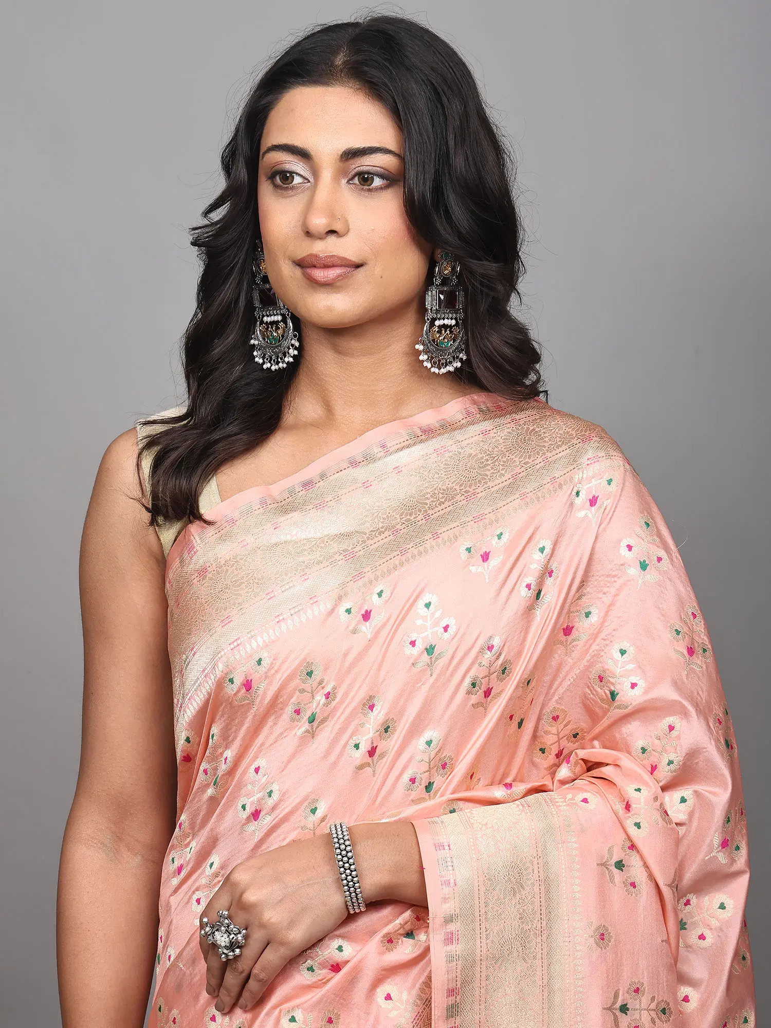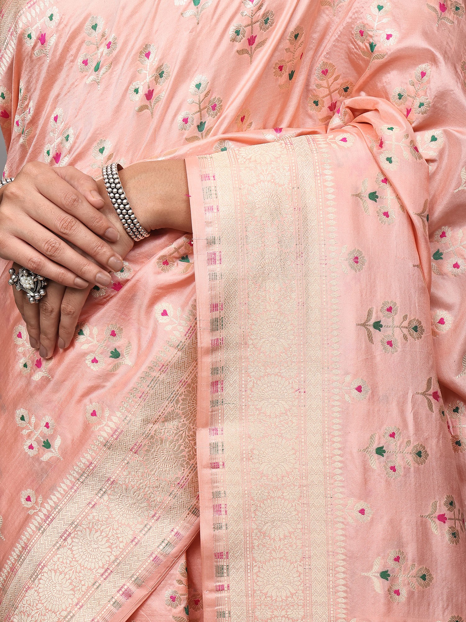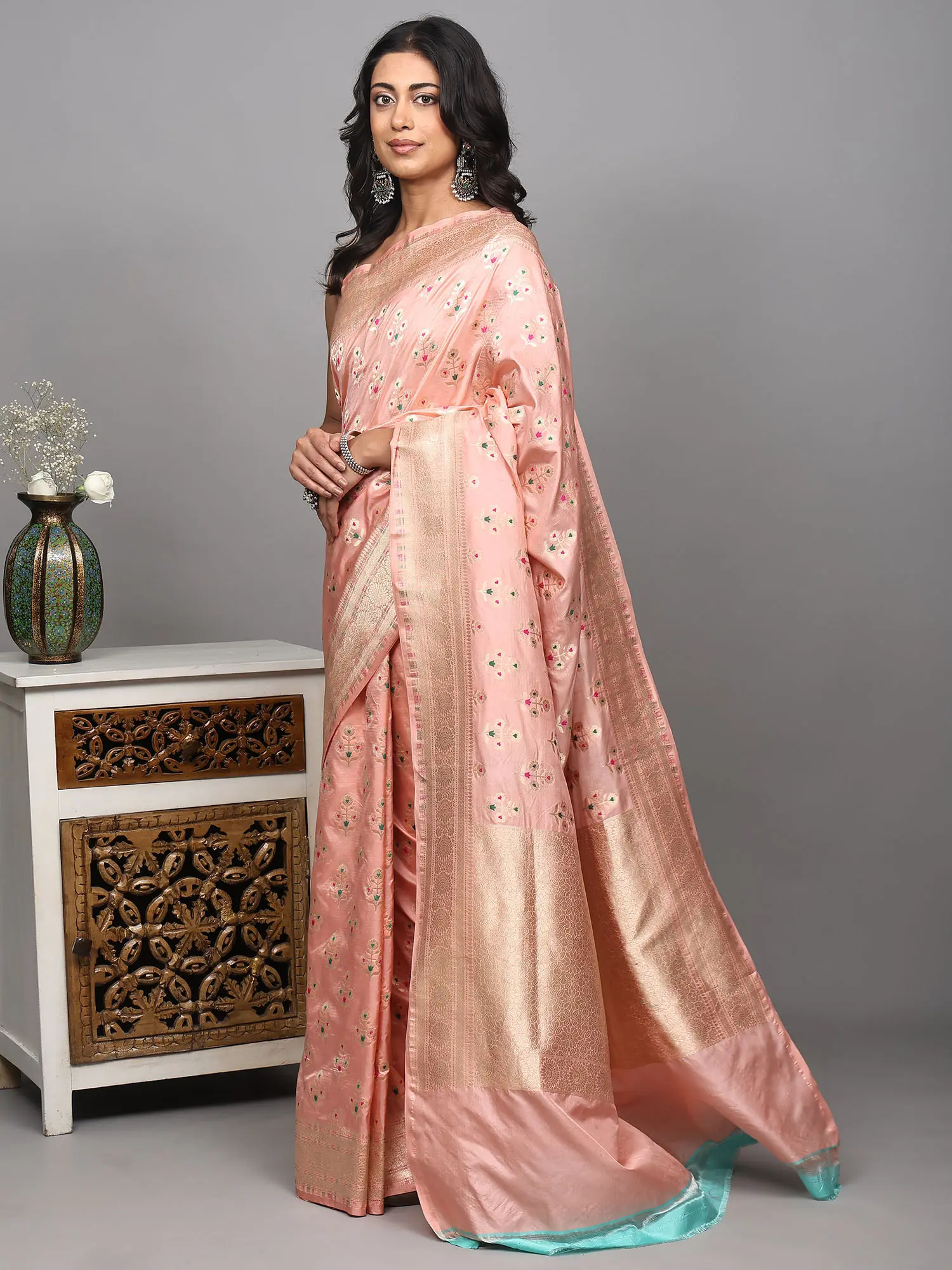 Discover a symphony of color and craftsmanship with this exquisite pure silk Banarasi saree. The delicate peach-rose hue forms a canvas for a breathtaking display of traditional artistry. Each thread is woven with meticulous care, promising a garment that is both luxurious to the touch and visually captivating. This saree is a testament to the enduring beauty of Indian textiles, designed to make you feel like royalty. ––––––––––––––––––