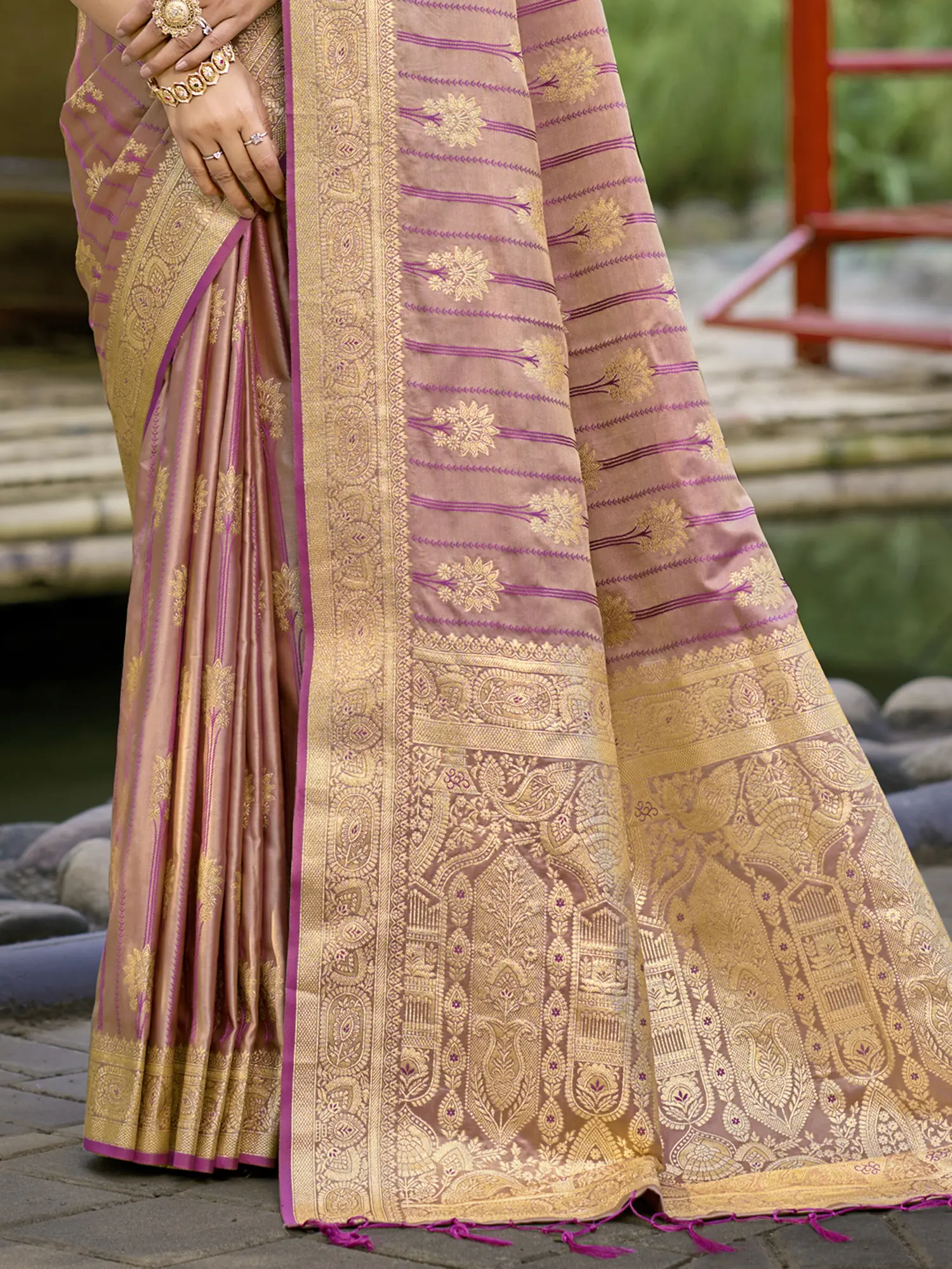 Adorned with an ornate, broad pallu border showcasing elaborate woven patterns and floral motifs.