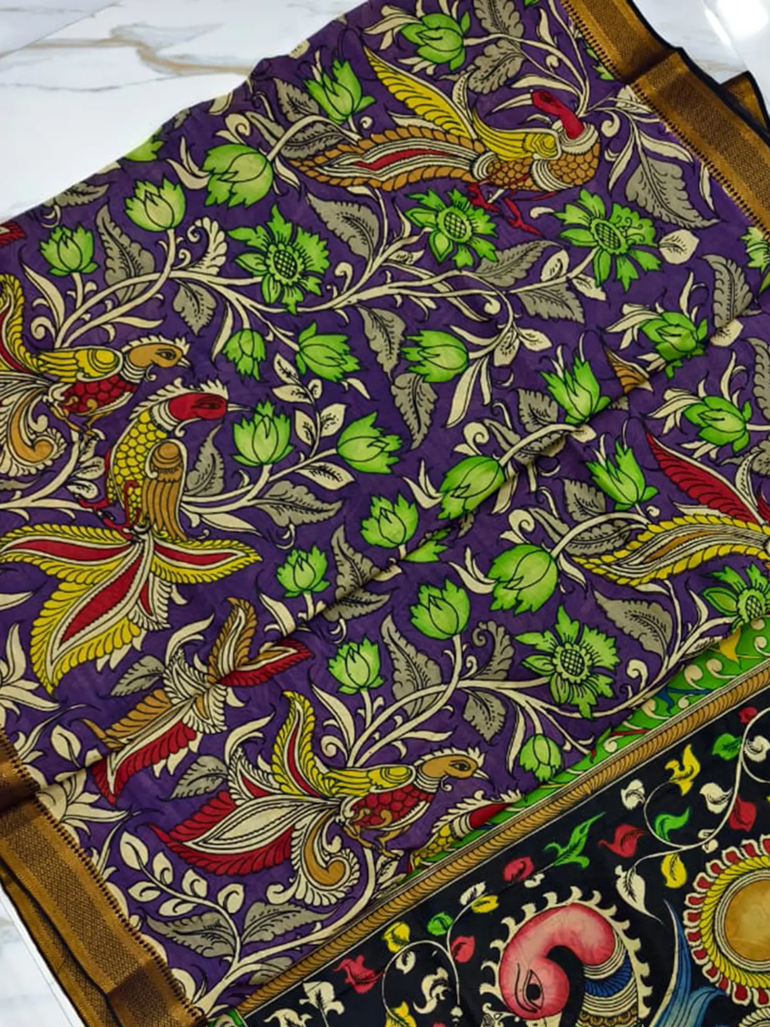 The design transitions elegantly to a striking black border, framing the purple expanse with a bold contrast. Here, the Kalamkari art takes on a different character, showcasing a prominent, beautifully depicted peacock in full regalia. This central motif is further enhanced by a delicate border of intricate patterns and floral accents, creating a visual anchor that draws the eye. The accompanying pallu, a rich blend of gold and artistic motifs, completes the ensemble, exuding an aura of opulence and grandeur. The combination of the deep purple, the contrasting black, and the shimmering gold creates a harmonious and luxurious aesthetic, making this saree a true statement piece.