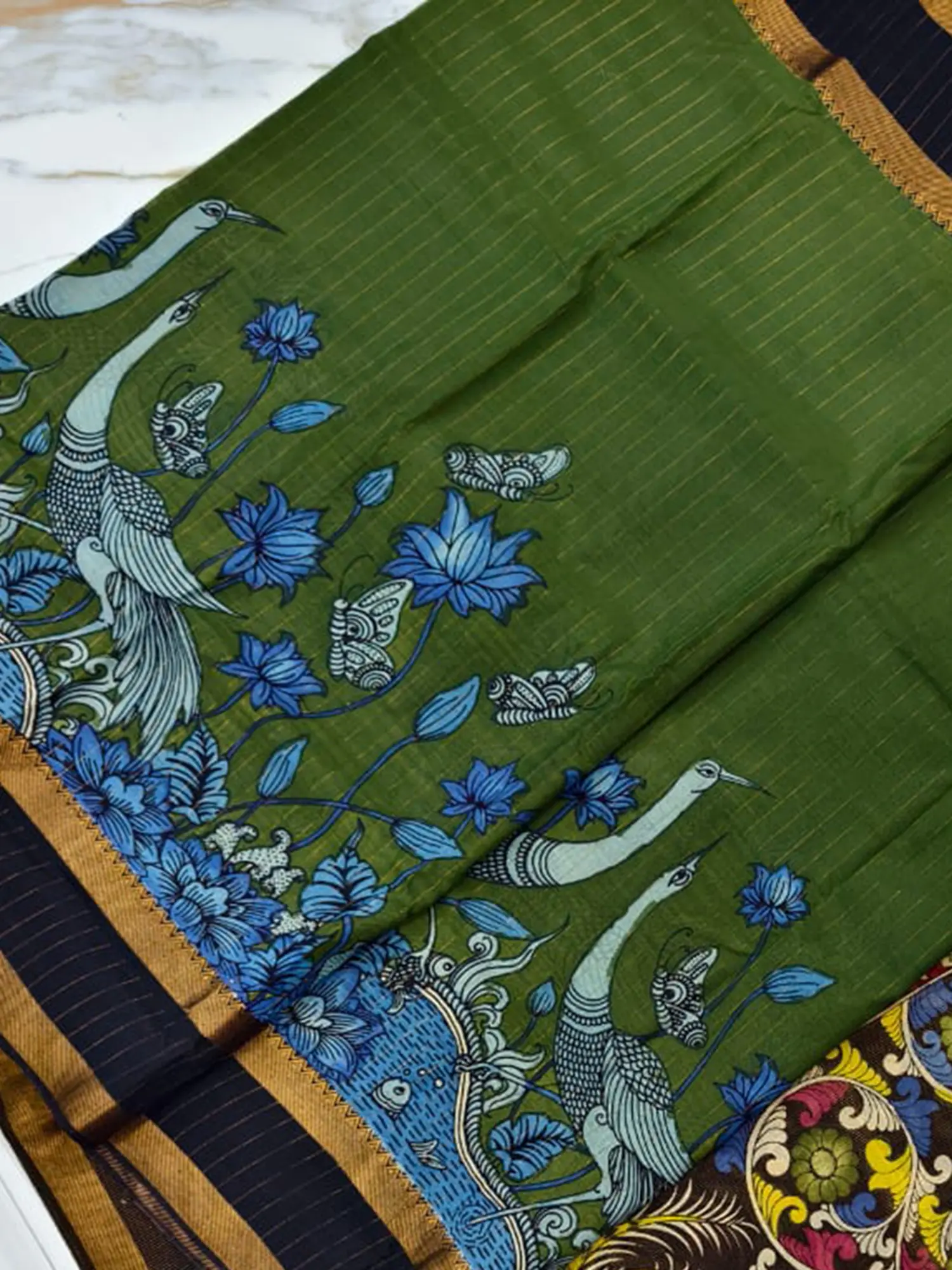 Step into a world of vibrant tradition and exquisite craftsmanship with this stunning Kalamkari semi silk saree. A true testament to the timeless art of Indian textile design, this saree features a breathtaking hand-painted motif of peacocks intertwined with delicate floral elements. The rich, earthy green base of the saree is adorned with gracefully rendered peacocks, their elegant forms brought to life with intricate detailing and a harmonious blend of blues and whites. Scattered amongst them are exquisite blue lotus flowers and delicate butterflies, creating a scene of natural beauty and serene grace.