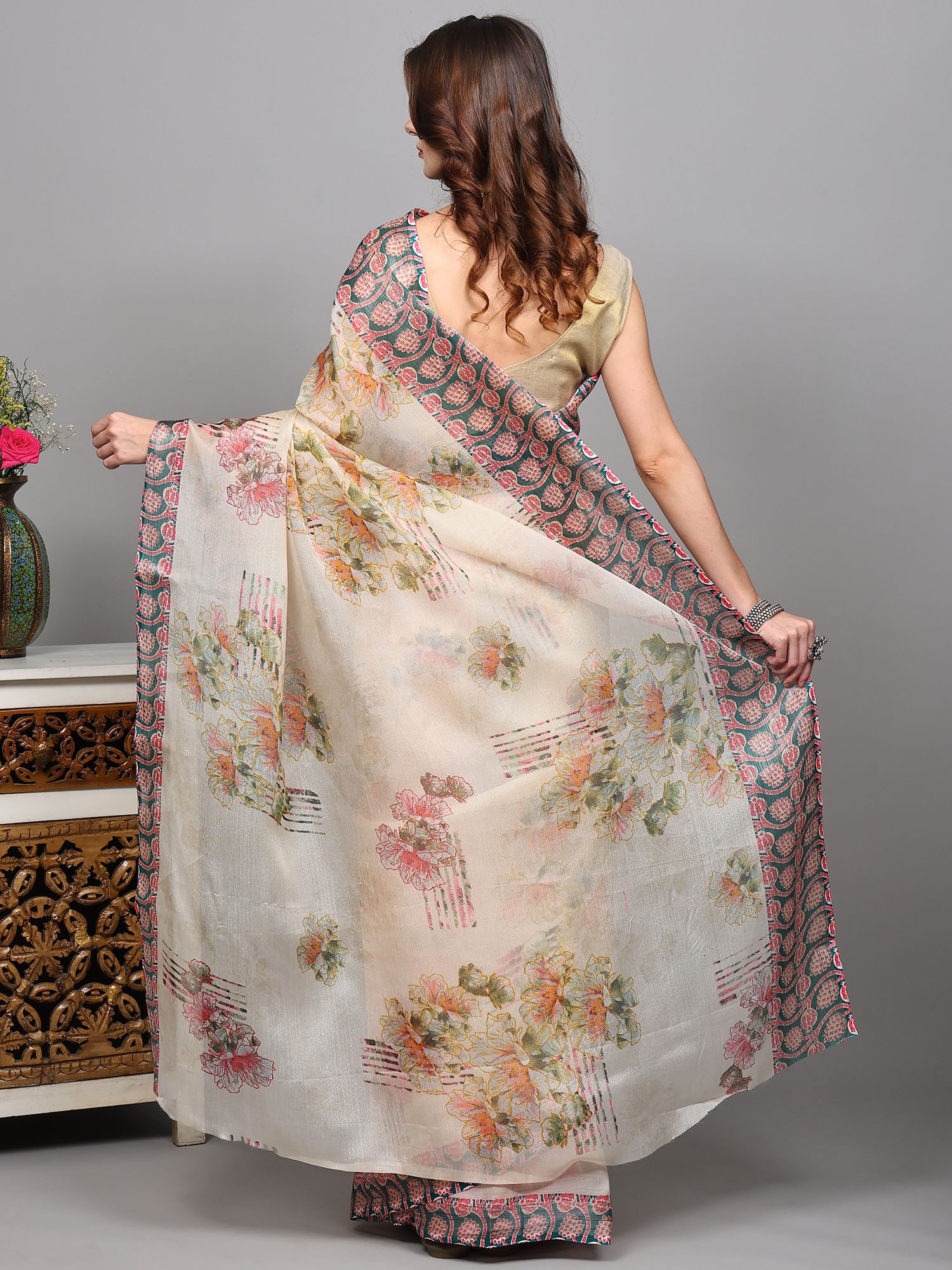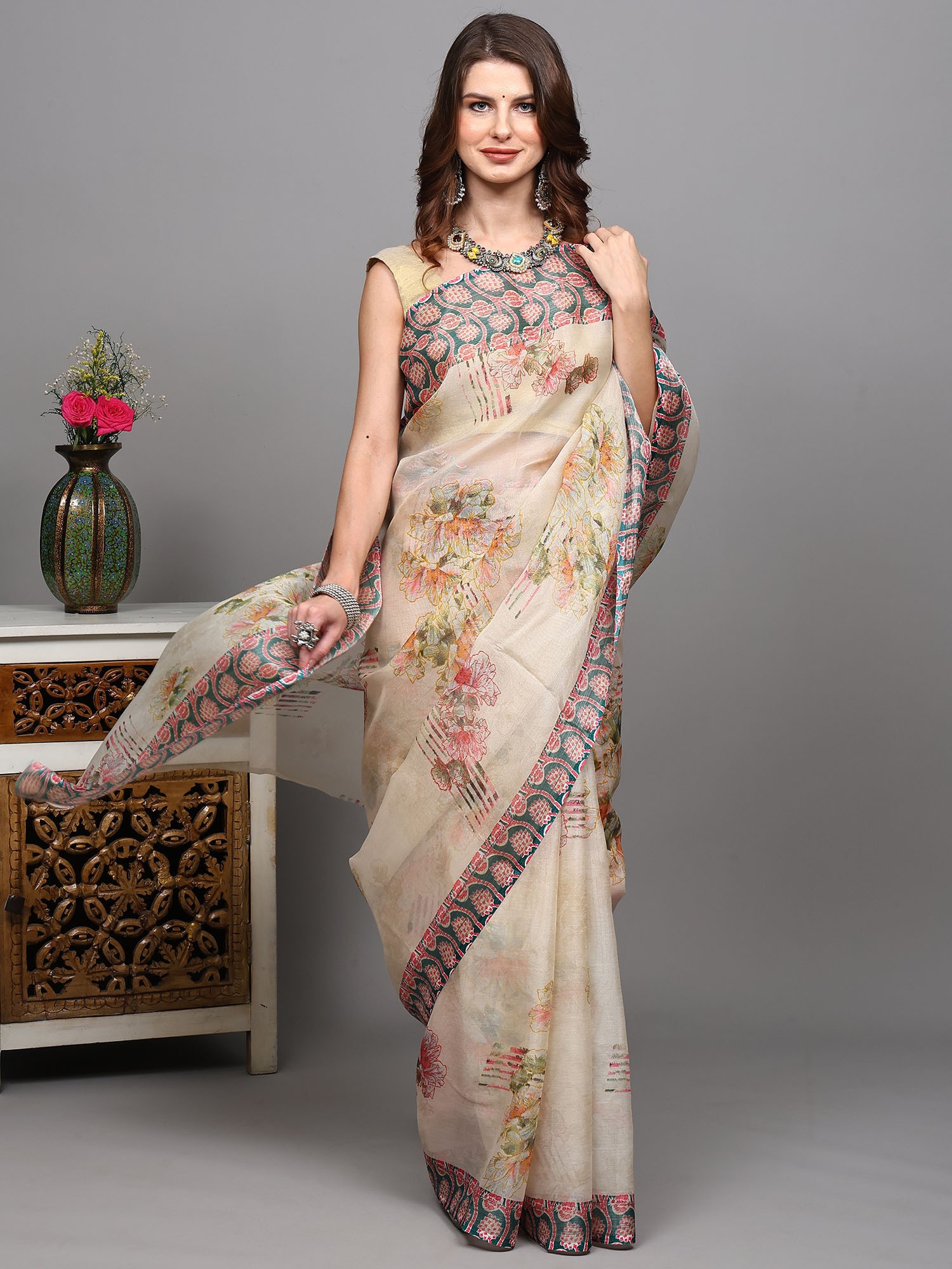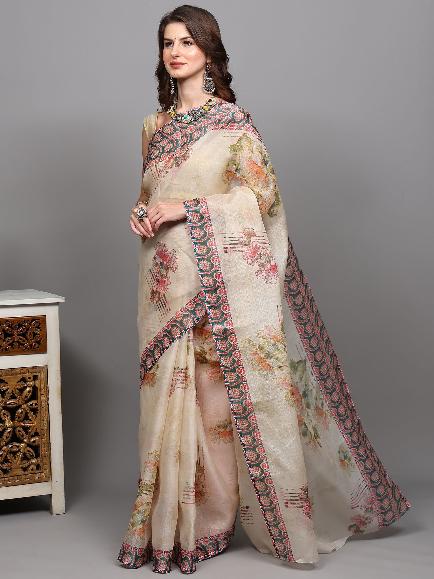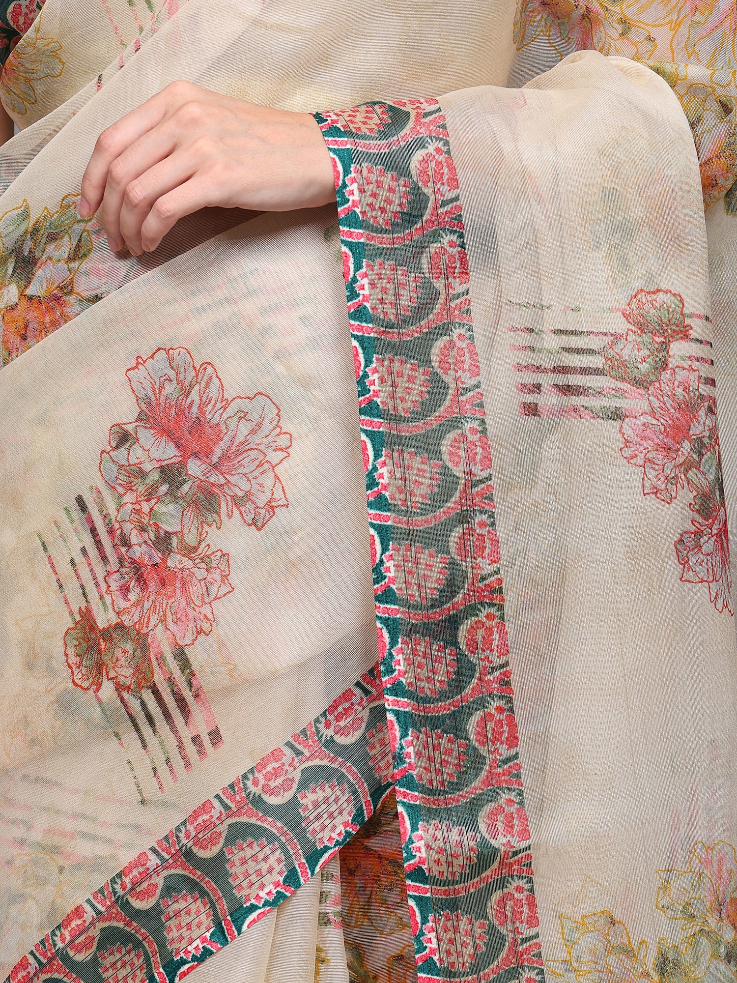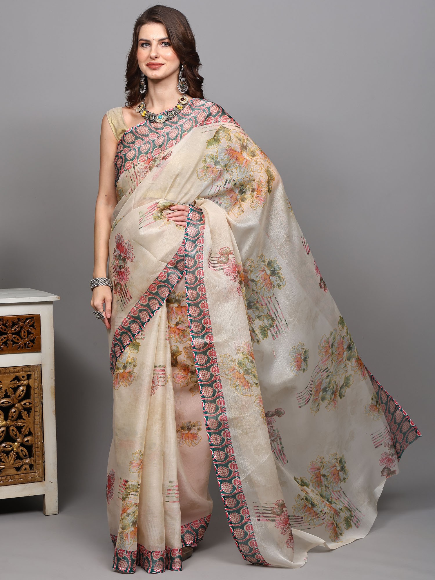 Gravel Digital Floral Printed Saree With Geometric Border