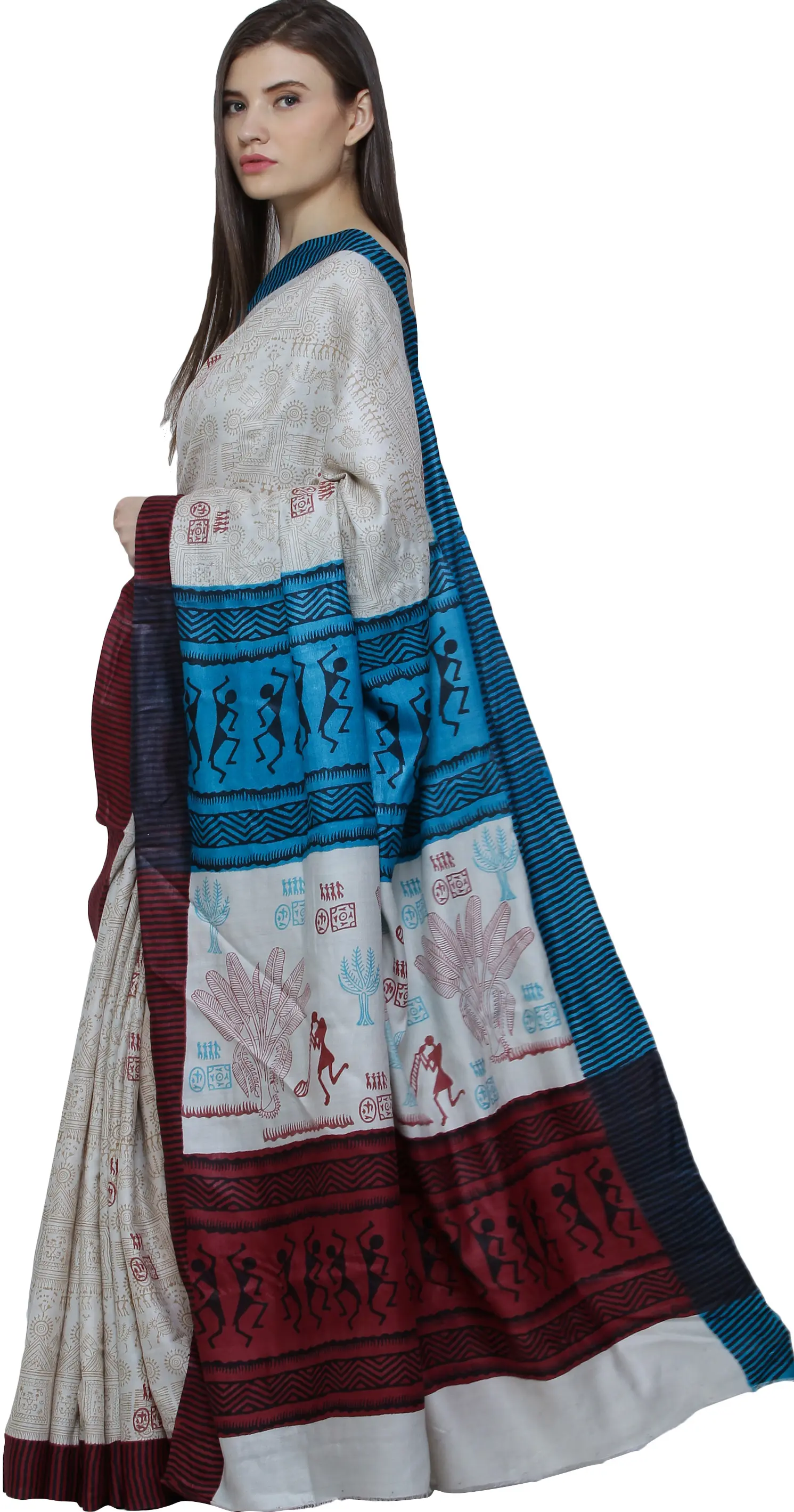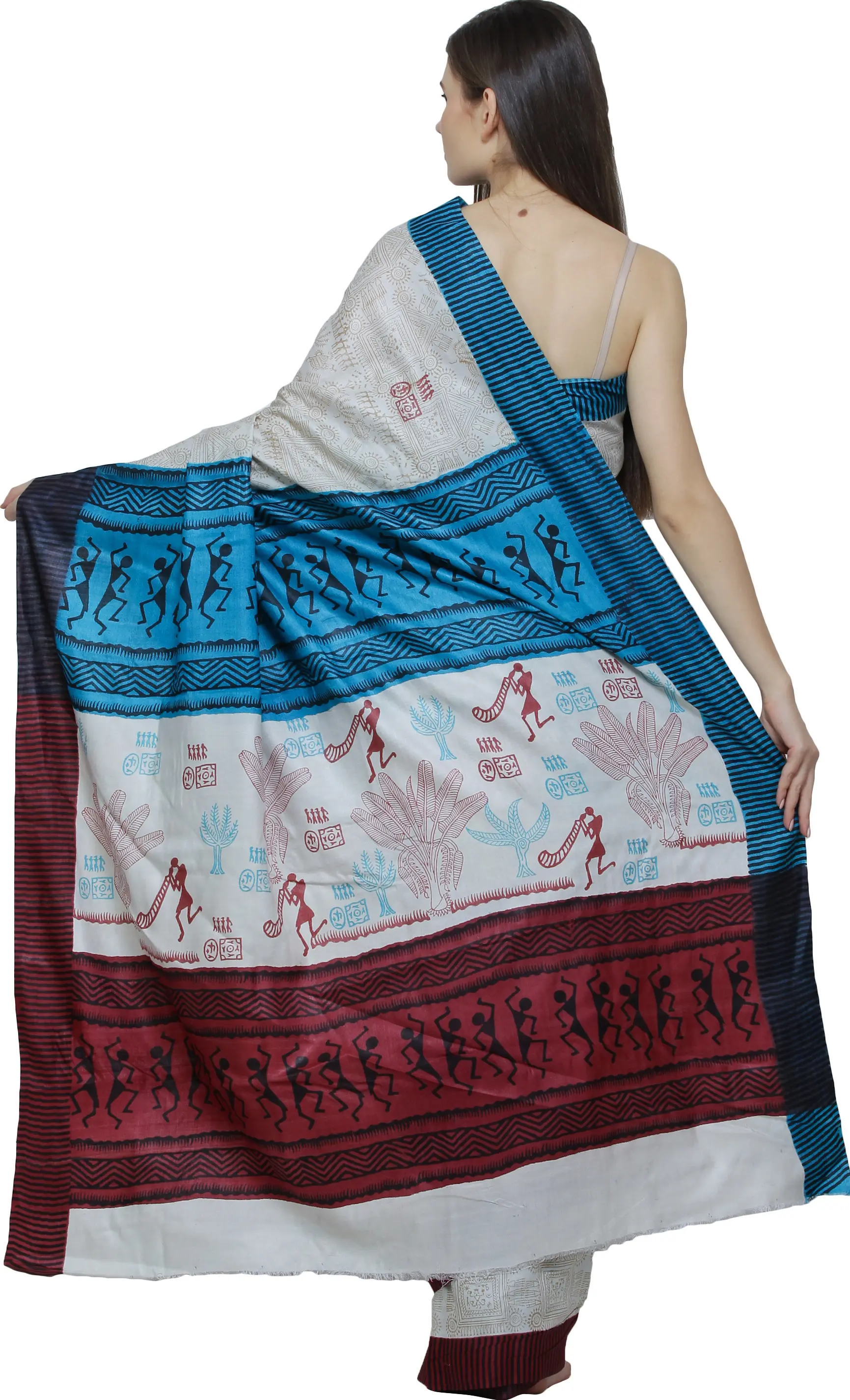 Kalamkari Saree from Telangana with Printed Warli Folk Art Motifs and Peacock-Elephant on Anchal