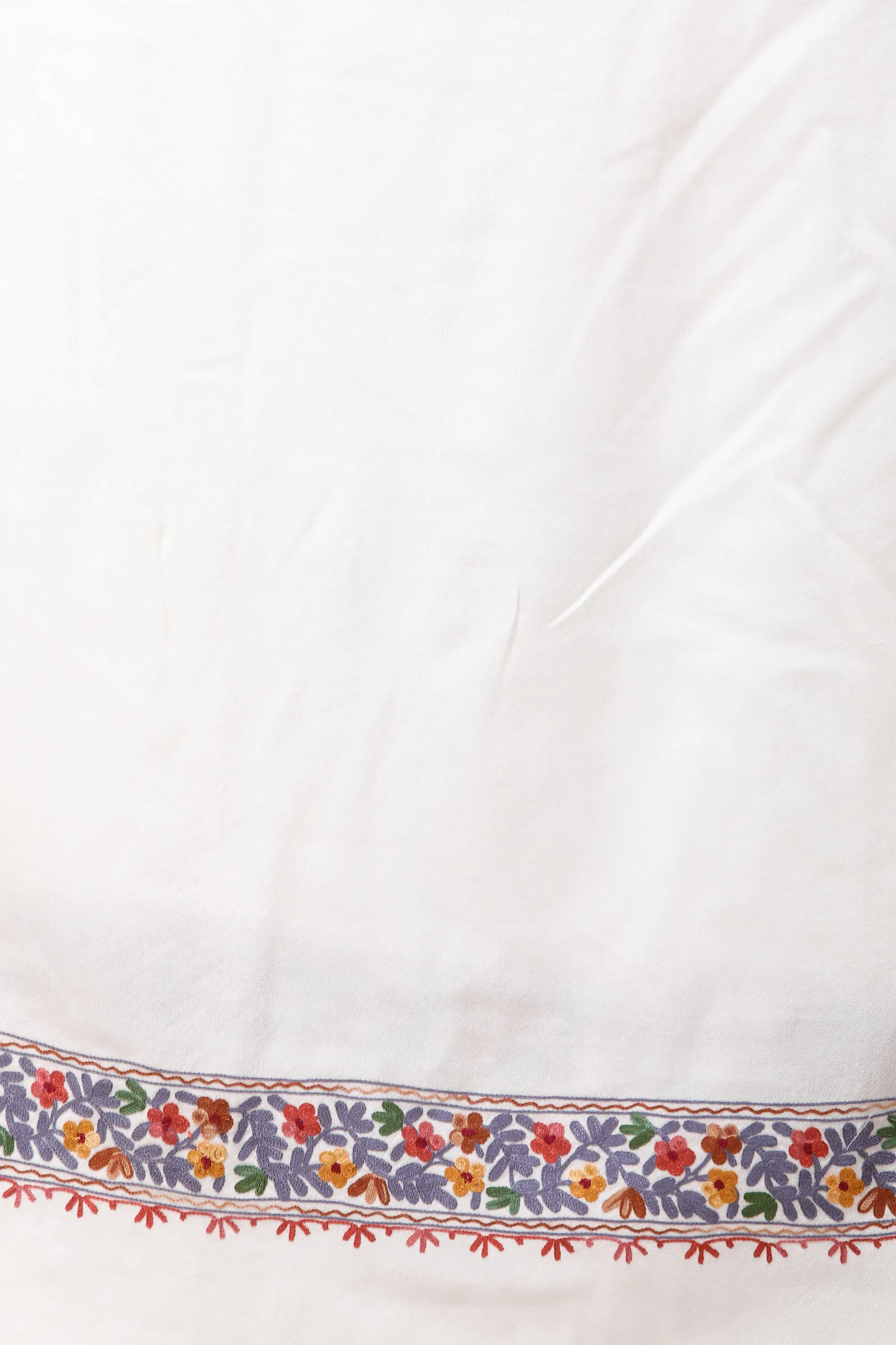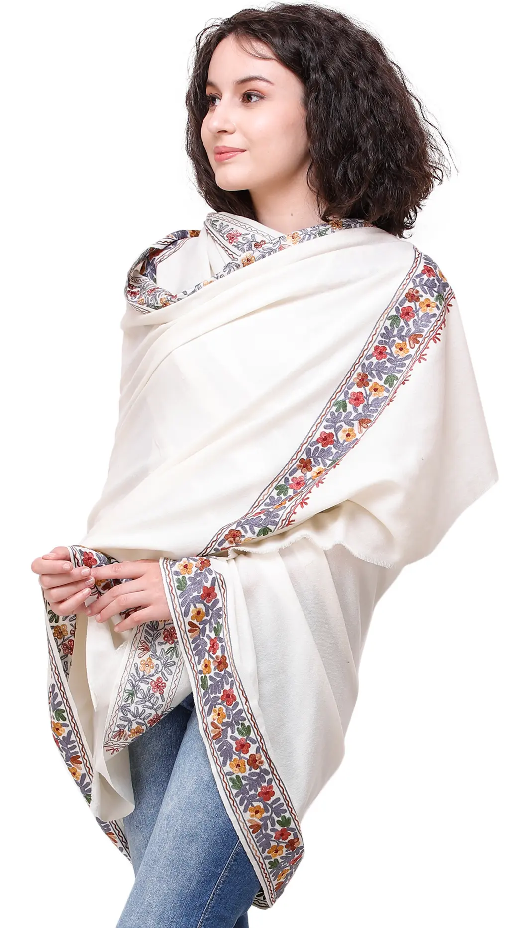 Adorning the edges of this generous shawl is a breathtaking floral motif. Each bloom and leaf is rendered in a spectrum of multicolor threads, featuring warm oranges, cheerful yellows, passionate reds, and cool grays, all set against a backdrop of earthy browns and verdant greens. The flowers appear to burst with life, creating a lively contrast against the serene ivory wool. This detailed embroidery is not merely decorative; it represents hours of skilled handiwork, making each shawl a unique piece of wearable art.
