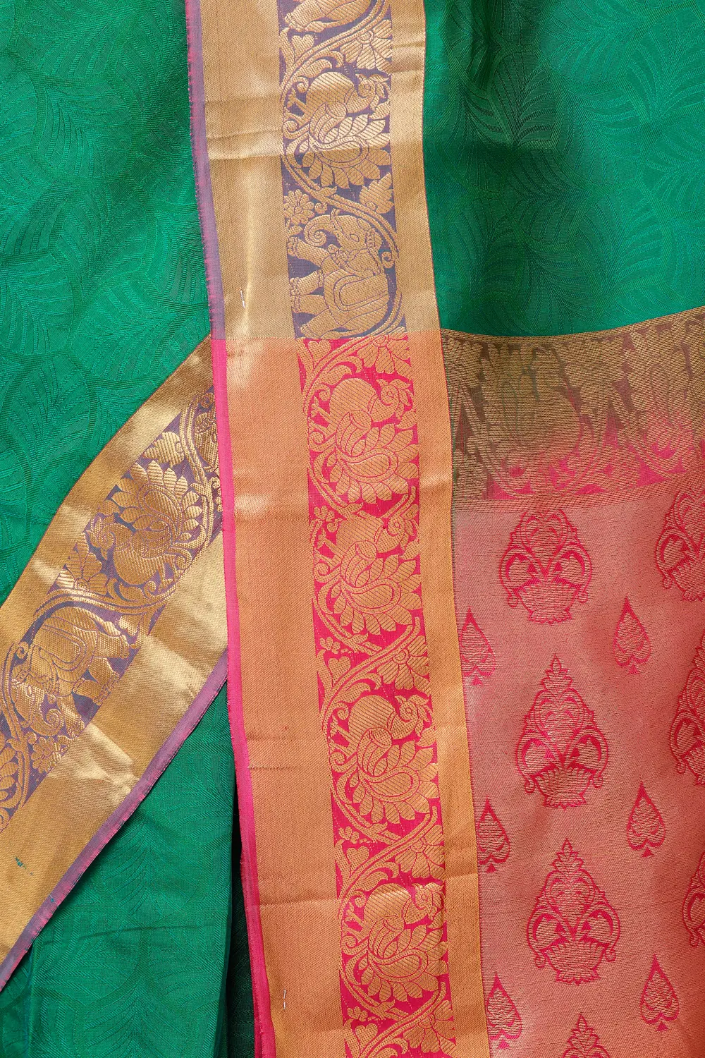 Adding another layer of visual intrigue and luxurious contrast, a vibrant pink hue is subtly incorporated along the edge of the golden borders and within the pallu's rich tapestry. This pop of color adds a delightful dynamism to the sari, preventing the opulent gold from overwhelming and creating a harmonious balance of shades. This thoughtful inclusion enhances the overall richness and appeal of the garment, making it suitable for a wide array of celebratory occasions. The blend of green, gold, and pink creates a visually stunning effect that is both traditional and contemporary.