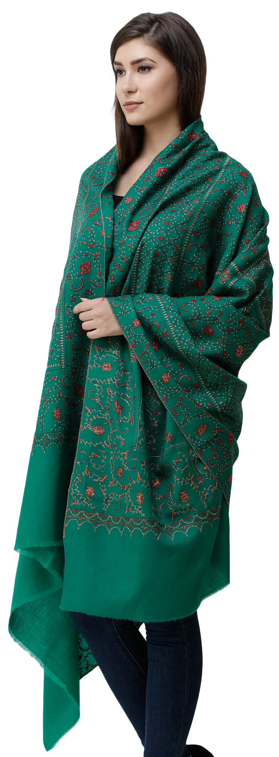 Immerse yourself in the rich heritage of Kashmir with this exquisite, pure wool shawl. The vibrant pepper-green hue serves as a breathtaking canvas for intricate Sozni embroidery, a traditional needlecraft renowned for its delicate beauty and meticulous detail. This shawl is not merely an accessory; it's a wearable piece of art, carrying centuries of artisan skill and cultural narrative.
