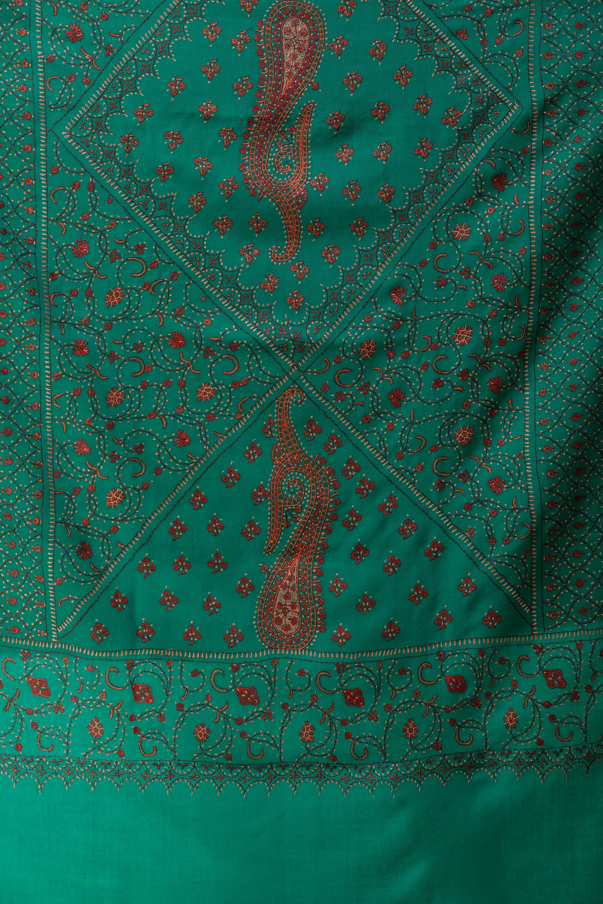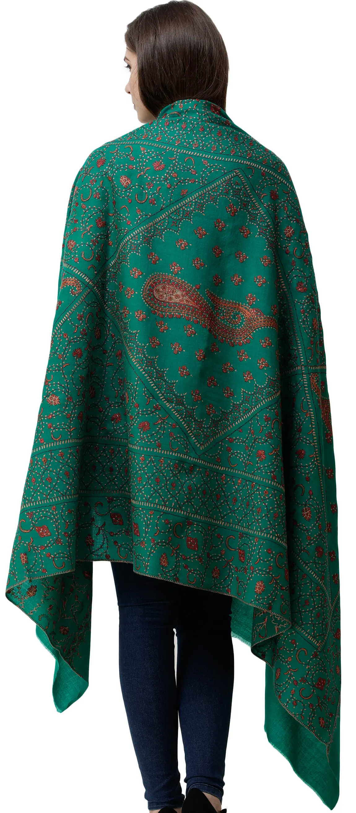 The heart of this shawl's allure lies in its Sozni embroidery. Expert hands have painstakingly stitched delicate floral vines and iconic paisleys across the entire expanse of the pure wool. Each motif is rendered with precision, creating a mesmerizing interplay of texture and color. The subtle contrast between the deep green wool and the warm, earthy tones of the embroidery thread brings the design to life, evoking the natural beauty and timeless elegance of the Kashmiri landscape. This intricate embroidery is more than just decoration; it’s a testament to the patience, skill, and artistry passed down through generations of Kashmiri craftspeople.
