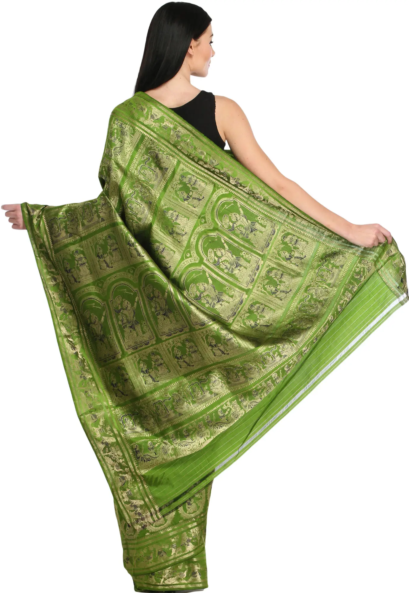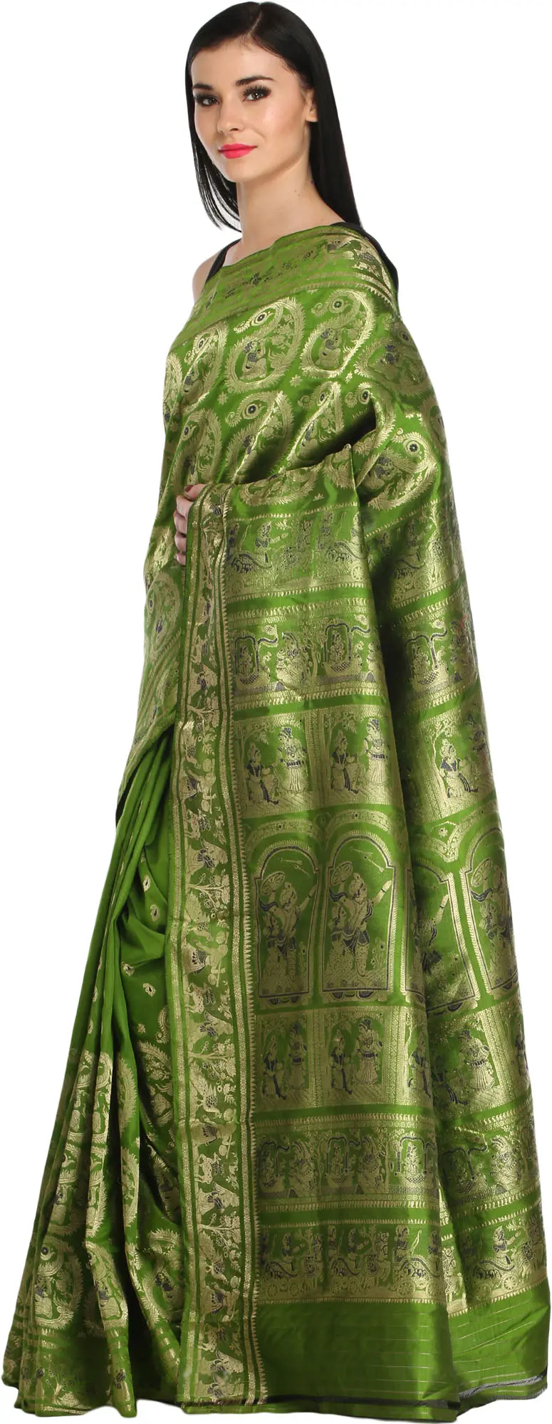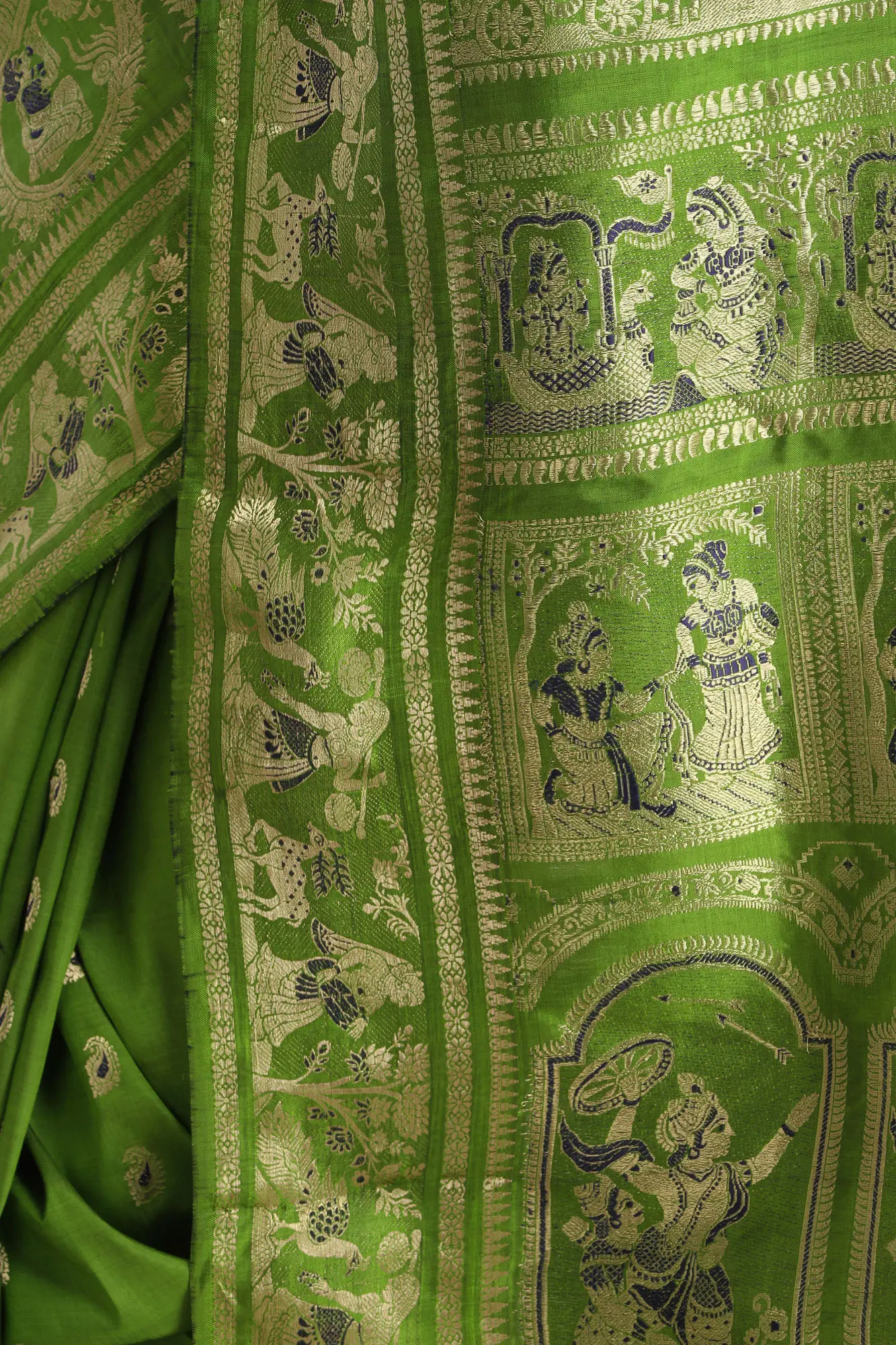 Peridot-Green Baluchari Sari from Bengal Depicting Mythological Episodes from Mahabharata