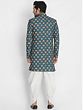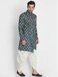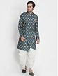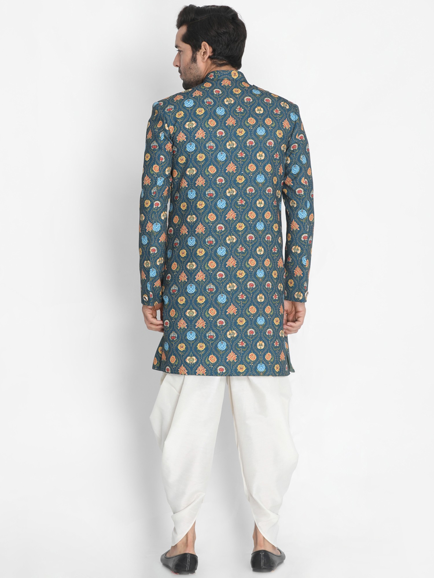 Crafted from a luxurious silk blend, this “Sherwani”, boasts a stunning ogee-floral motif digital print in Persian blue, marrying tradition with contemporary aesthetics. Its Indowestern style adds a modern edge to this classic attire, making it versatile for auspicious occasions. Complementing the Sherwani is a comfortable cream cotton-blend “Patiala-style Dhoti”, ensuring both style and ease of movement. With its impeccable craftsmanship, rich fabric blend, and timeless design, this ensemble, a striking fusion of tradition and contemporary fashion, is the epitome of sophistication and cultural finesse.