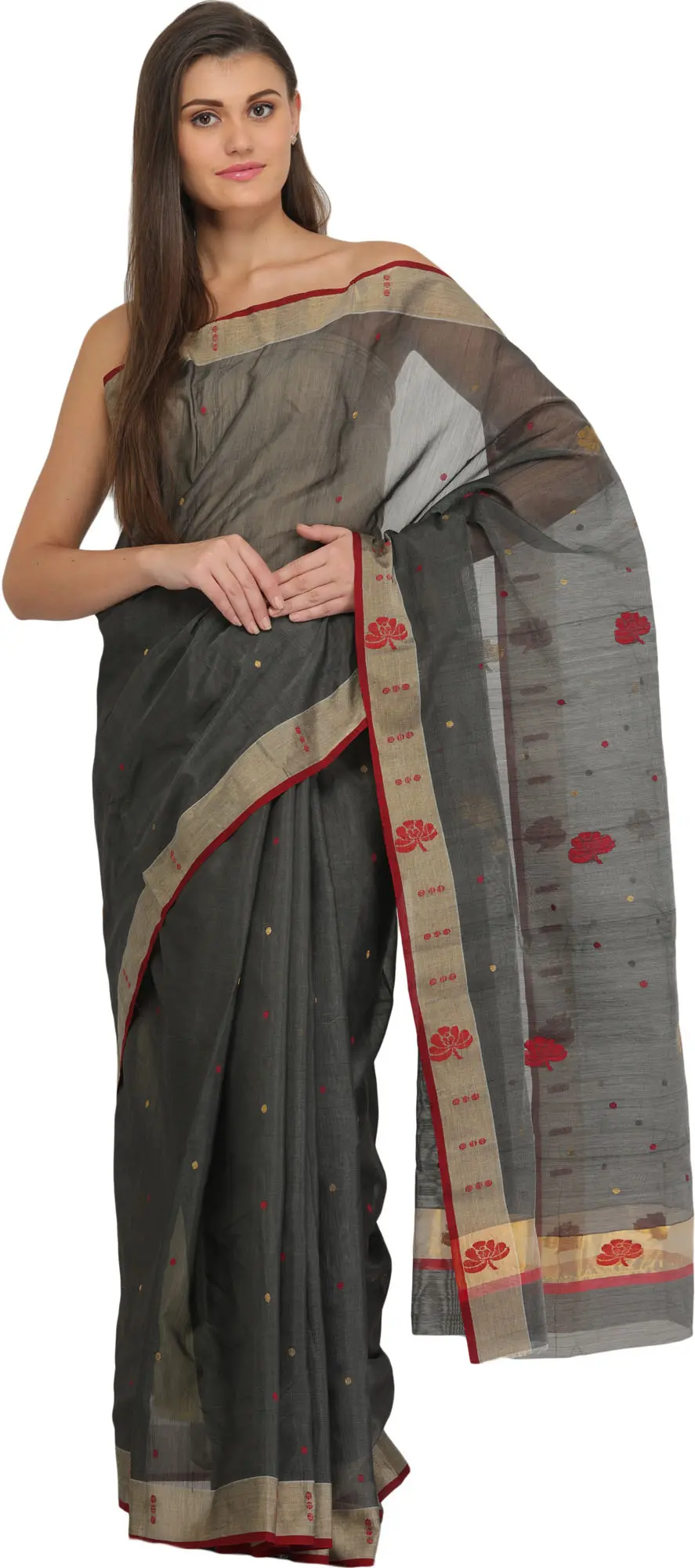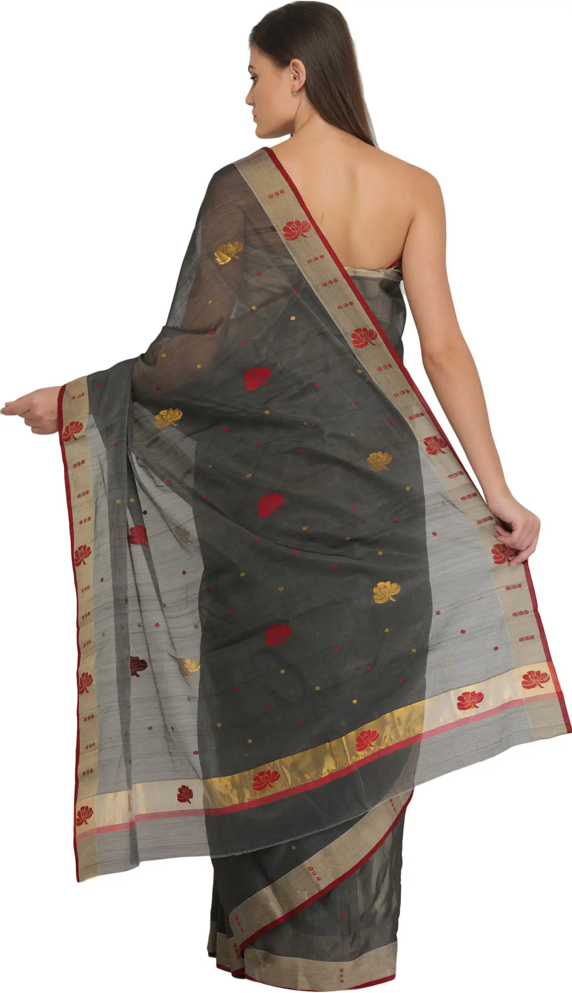 Pewter-Gray Handloom Chanderi Sari with Woven Bootis and Flowers on Pallu