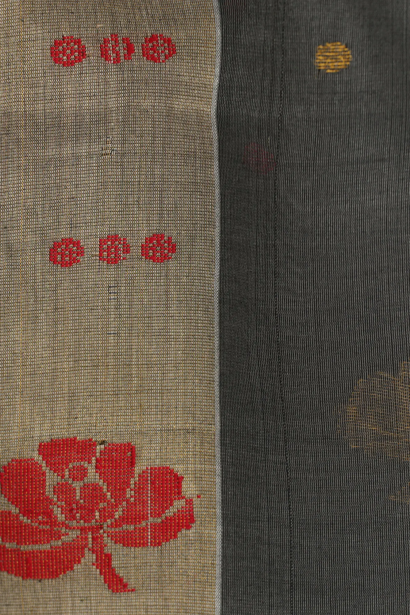 The true artistry of this sari lies in its intricate detailing. The body of the sari is adorned with delicate, woven bootis in a scattering of gold and red, creating a captivating visual texture. The pallu, the most prominent part of the sari, is a masterpiece in itself. It features a striking woven border embellished with stylized floral motifs in vibrant red, interspersed with smaller woven patterns. This thoughtful placement of traditional motifs adds a touch of heritage and charm, making each sari a wearable work of art. The border also includes bands of natural beige and a slender red edge, framing the design with classic grace.