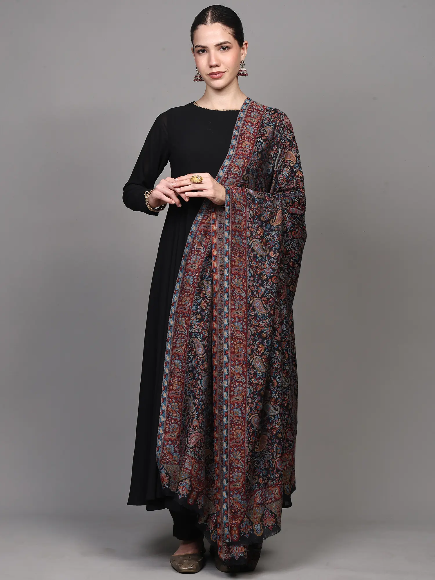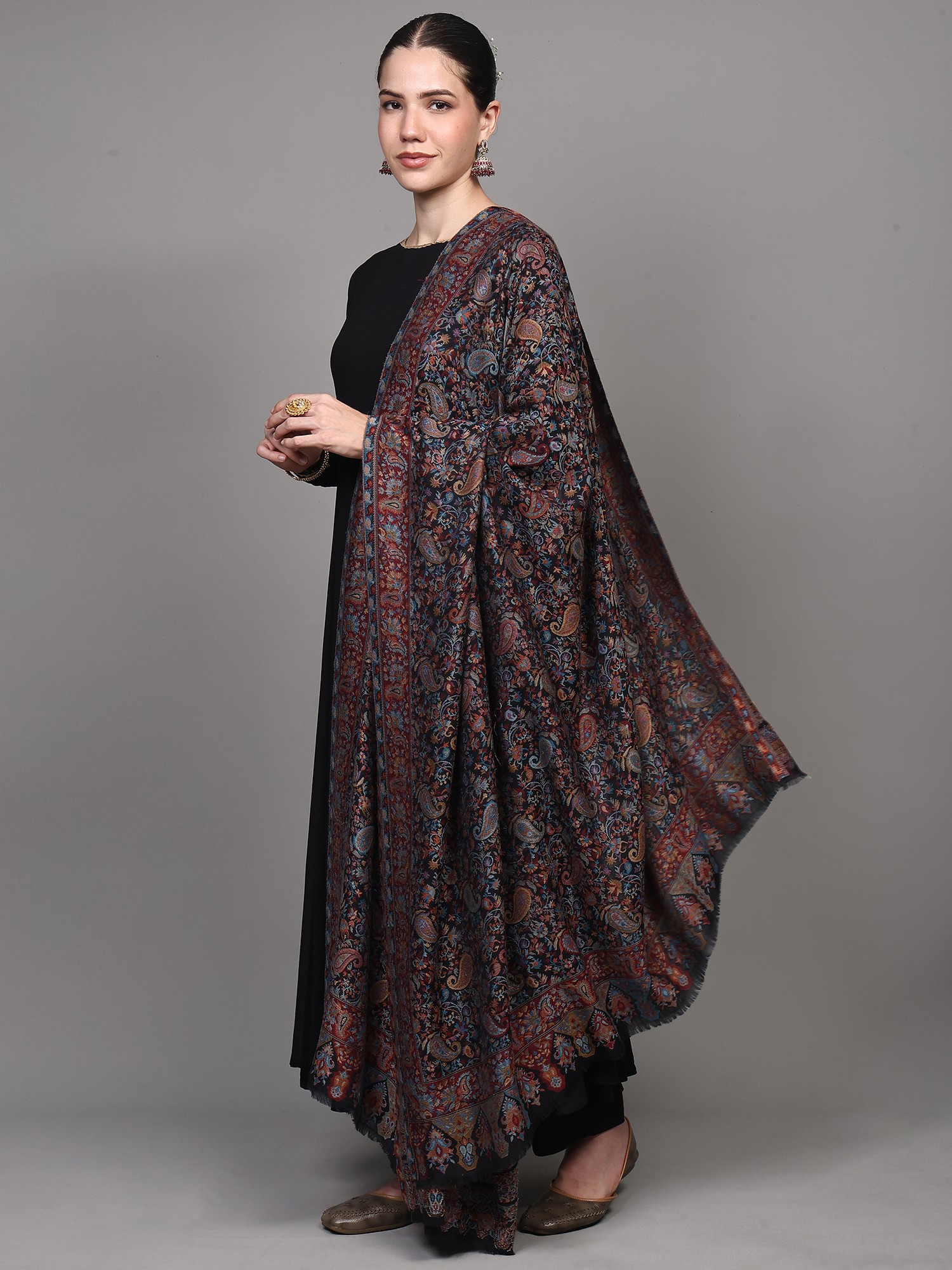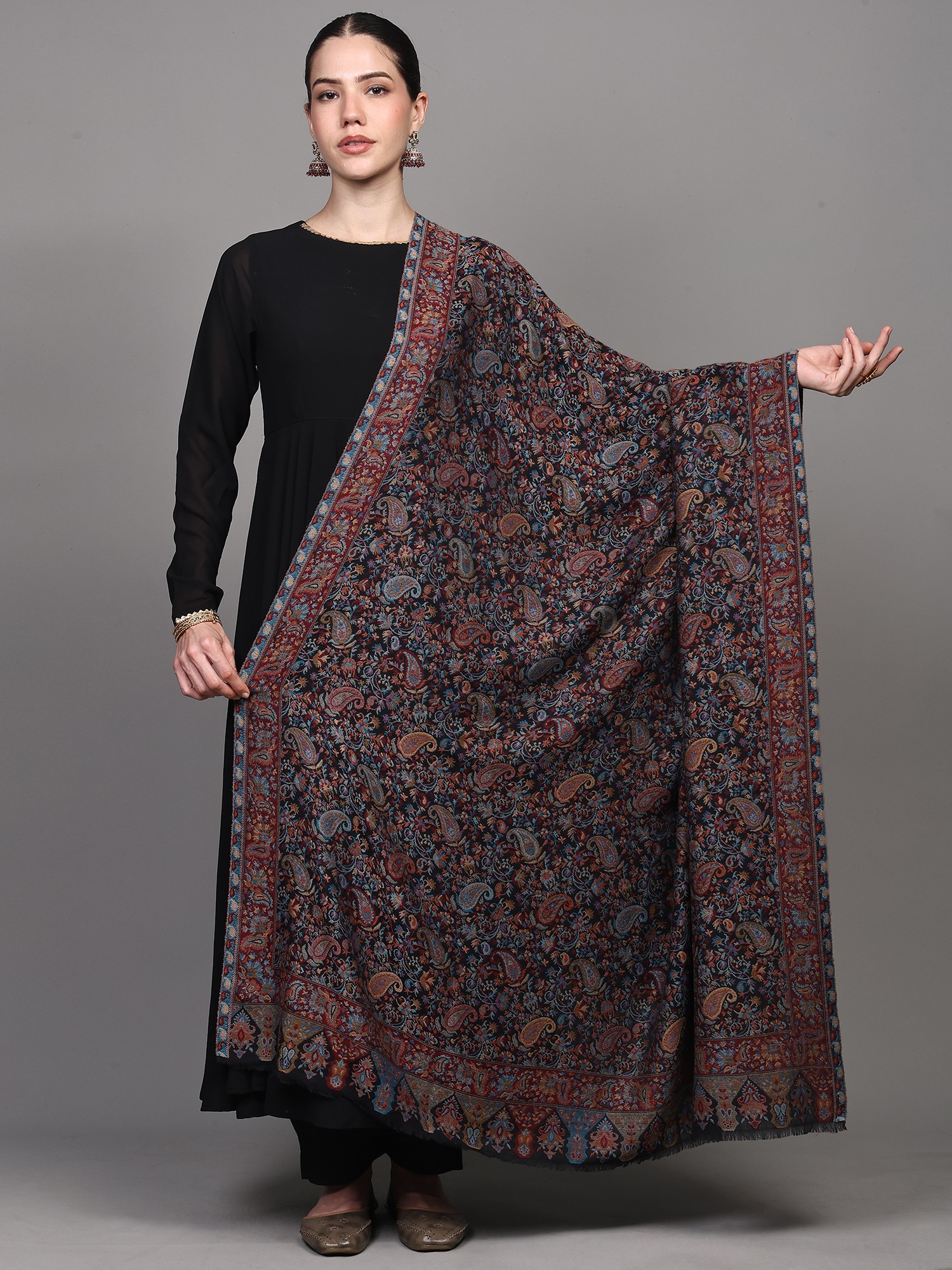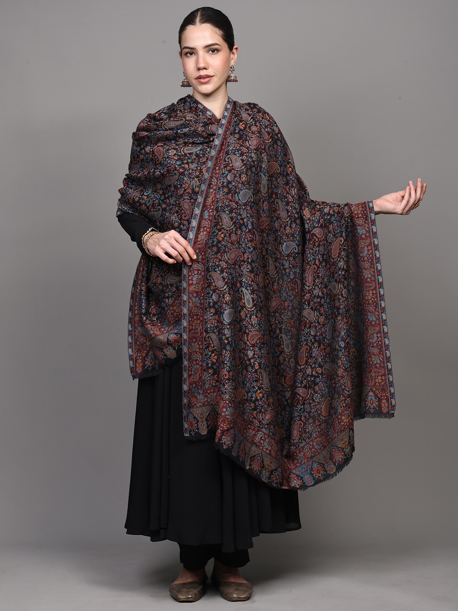 Immerse yourself in the rich cultural heritage of Amritsar with this exquisite Jamawar shawl. Woven from the finest wool, this piece is a testament to the enduring tradition of intricate textile artistry. The deep, enigmatic phantom-black base serves as the perfect canvas for a breathtaking tapestry of multicoloured floral vines and iconic paisley motifs. Each element is meticulously woven, creating a visual symphony that speaks of skilled craftsmanship and timeless elegance.
