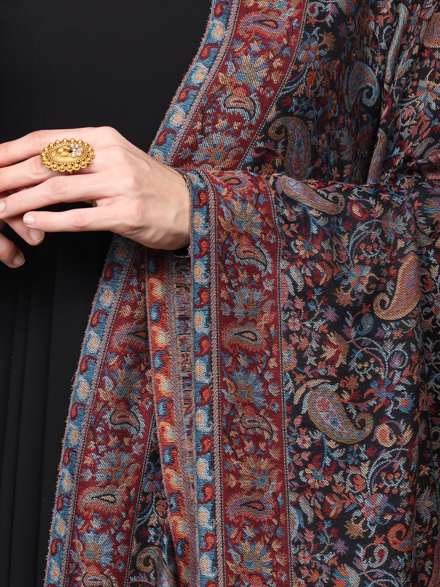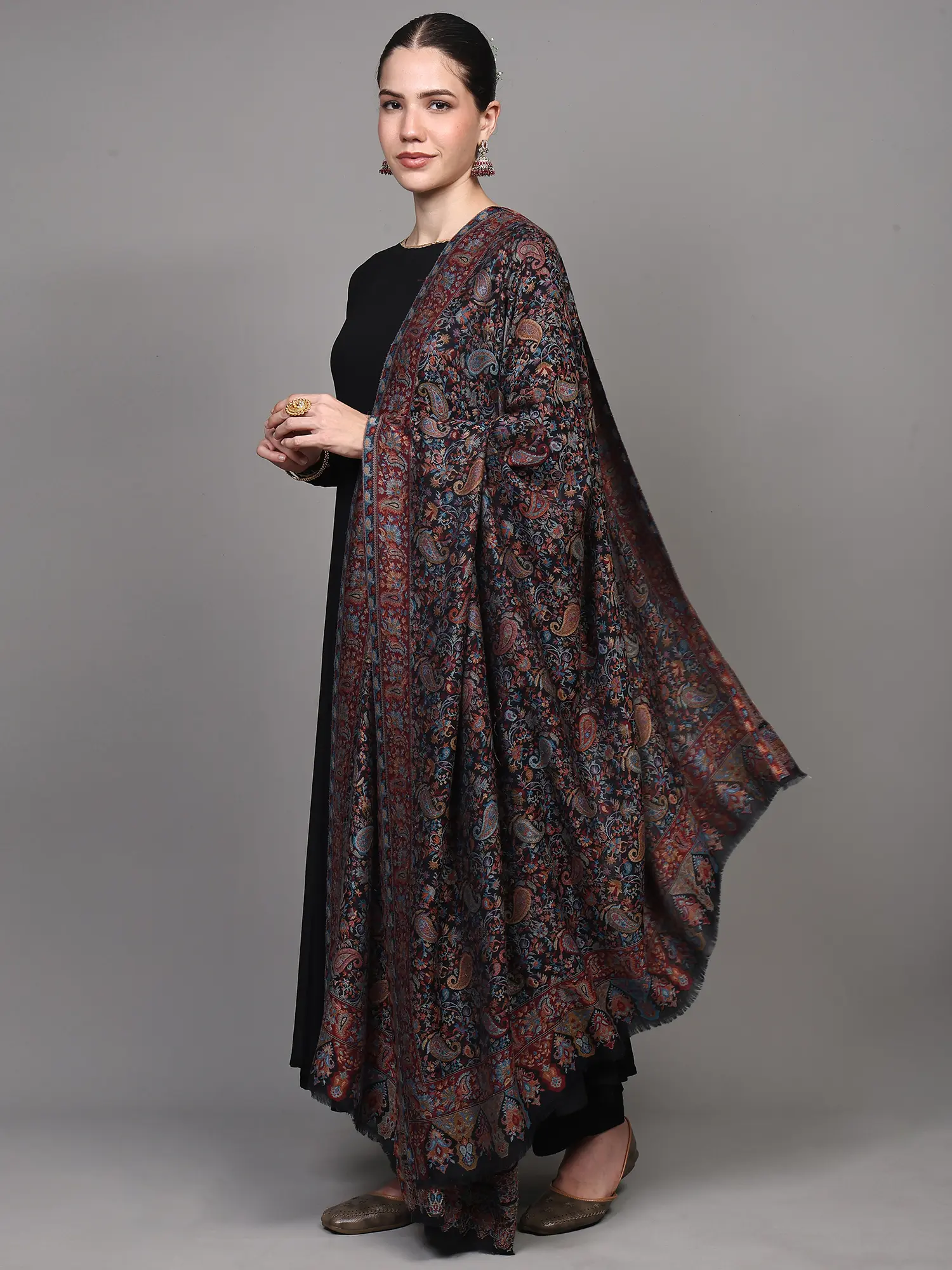 Phantom-Black Jamawar Shawl from Amritsar with Woven Multicolour Floral Vines And Paisleys