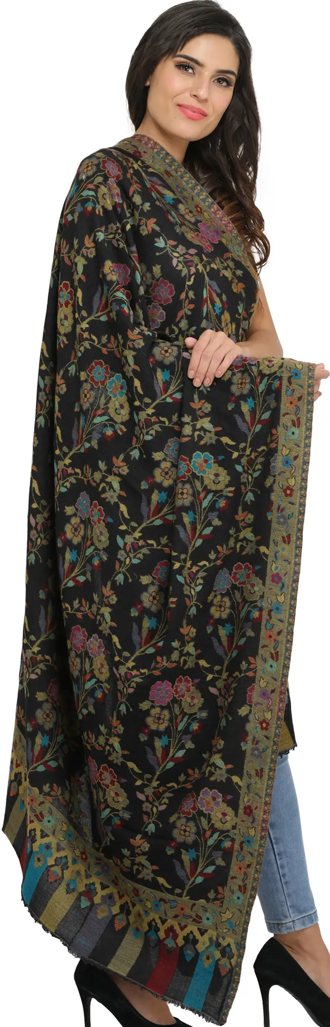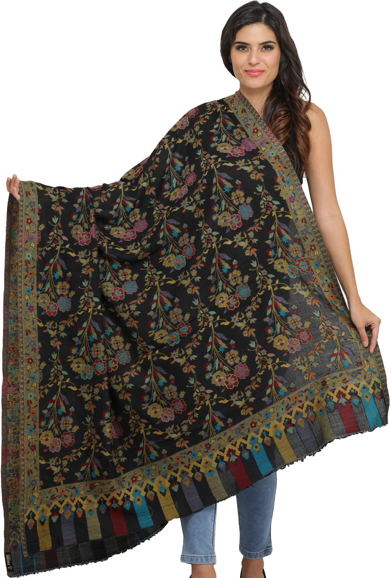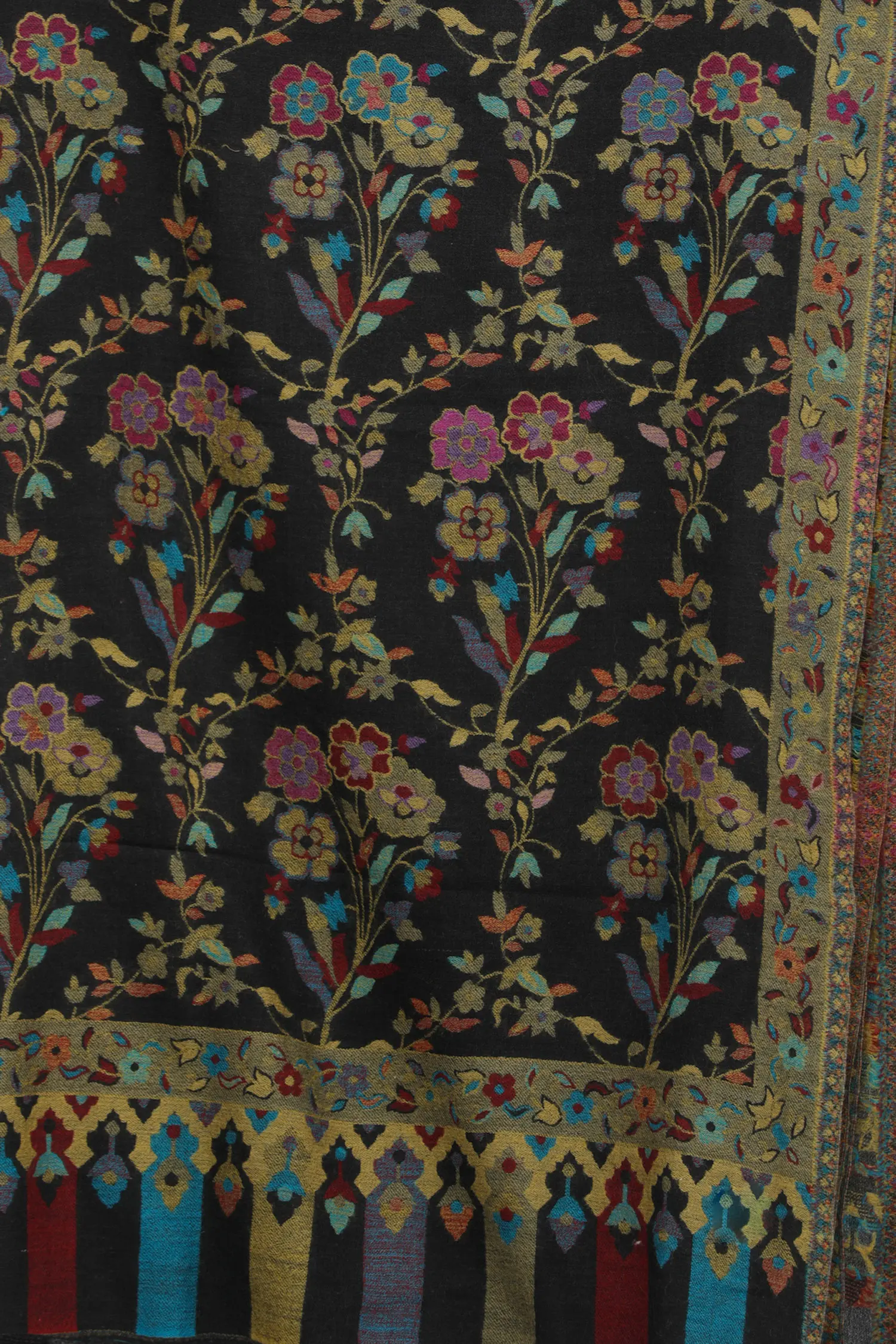 Black-Iris Cashmere Shawl from Amritsar with Kani Woven Multicolor Flowers and Paisleys