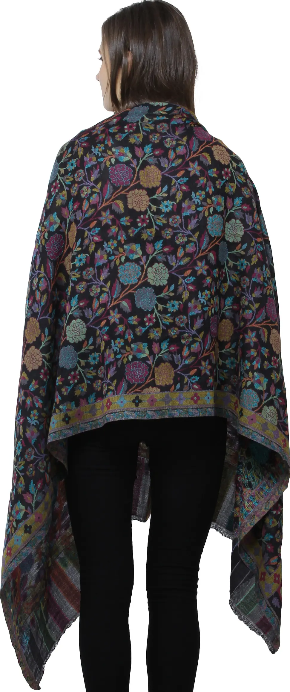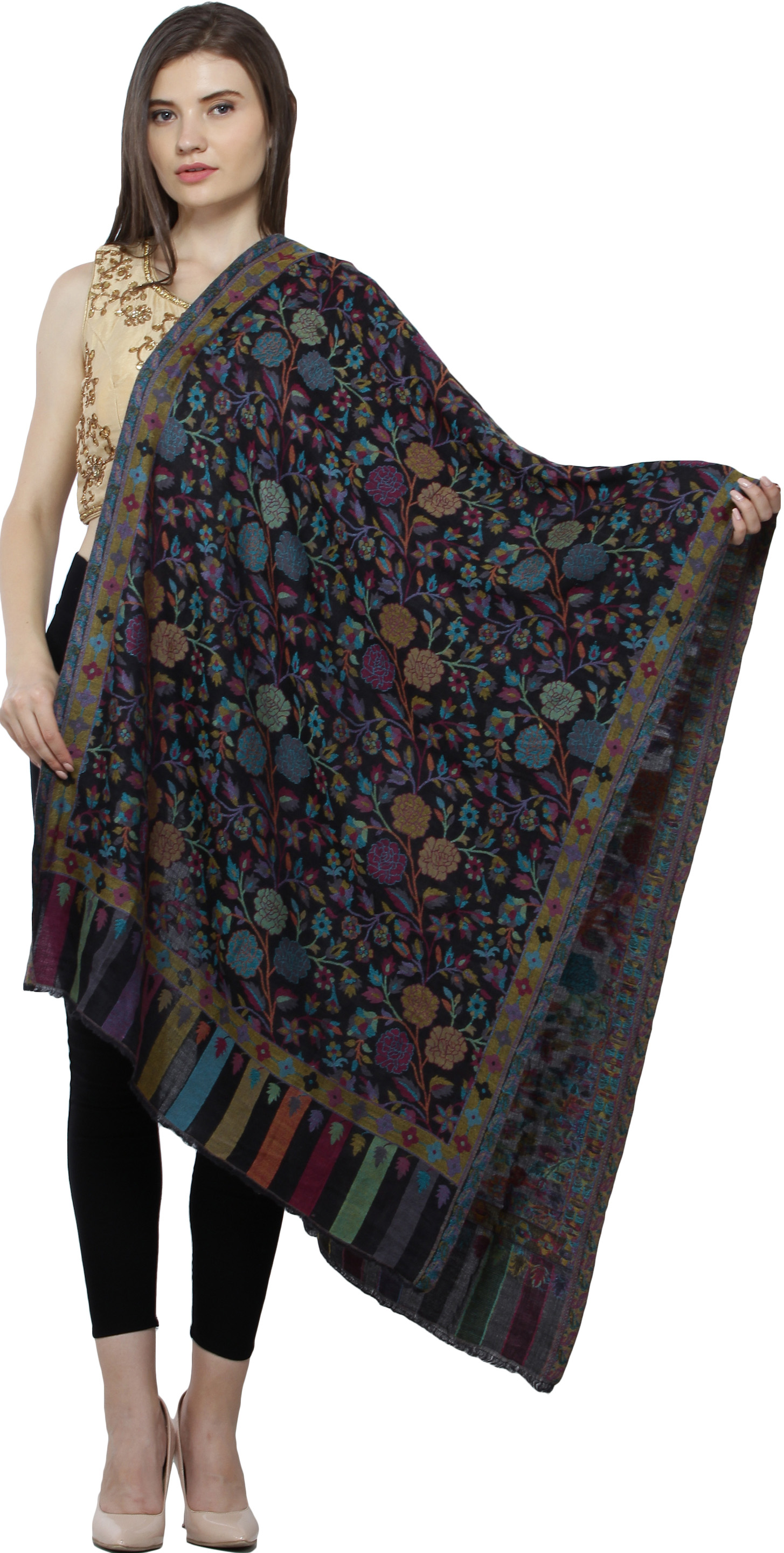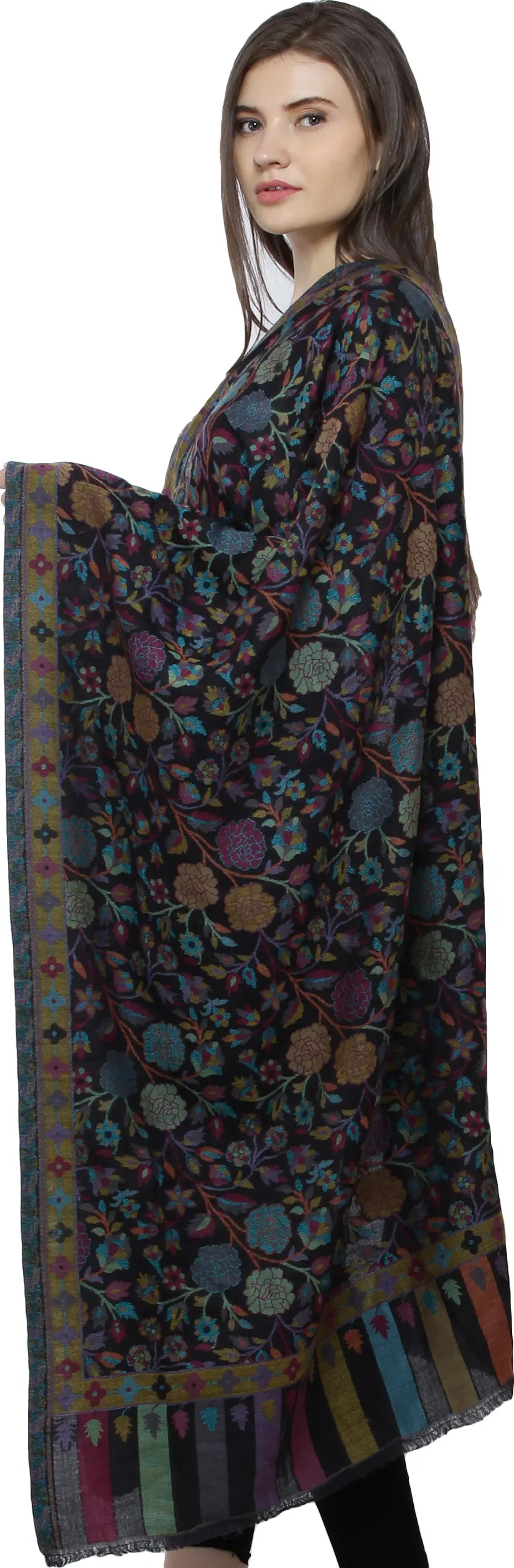 Black-Iris Cashmere Shawl from Amritsar with Kani Woven Multicolor Flowers and Paisleys