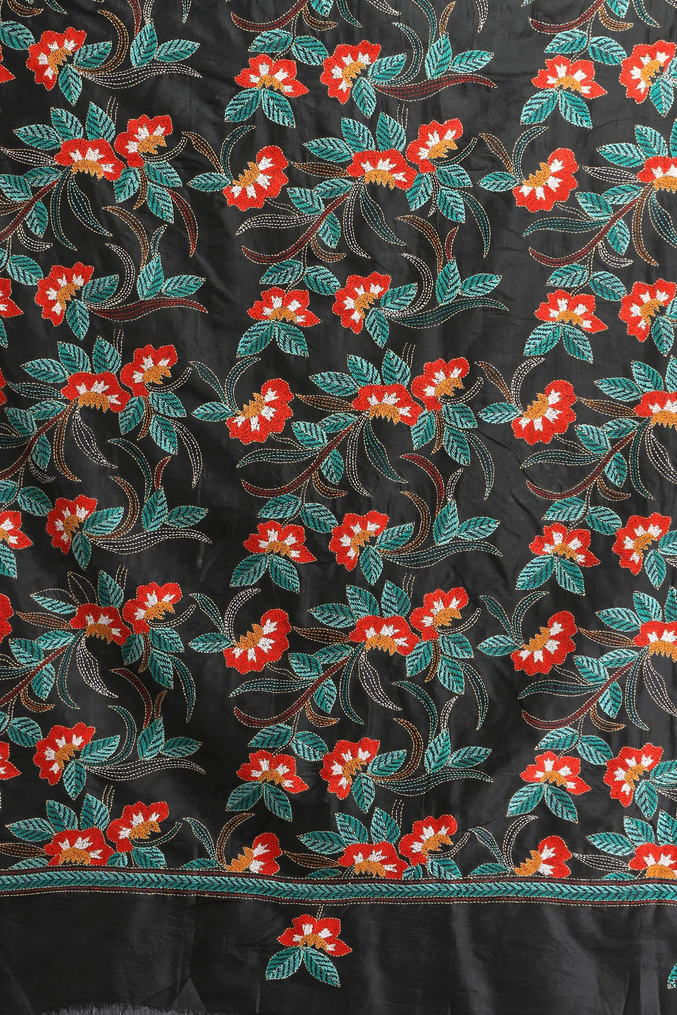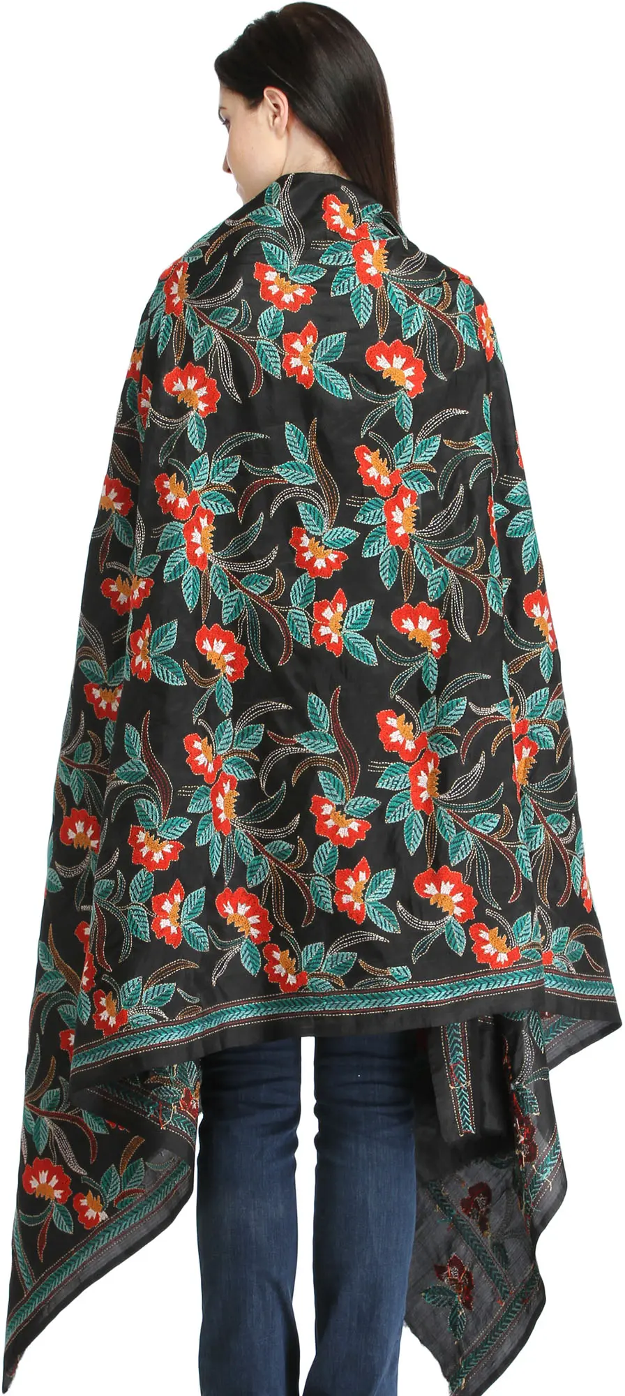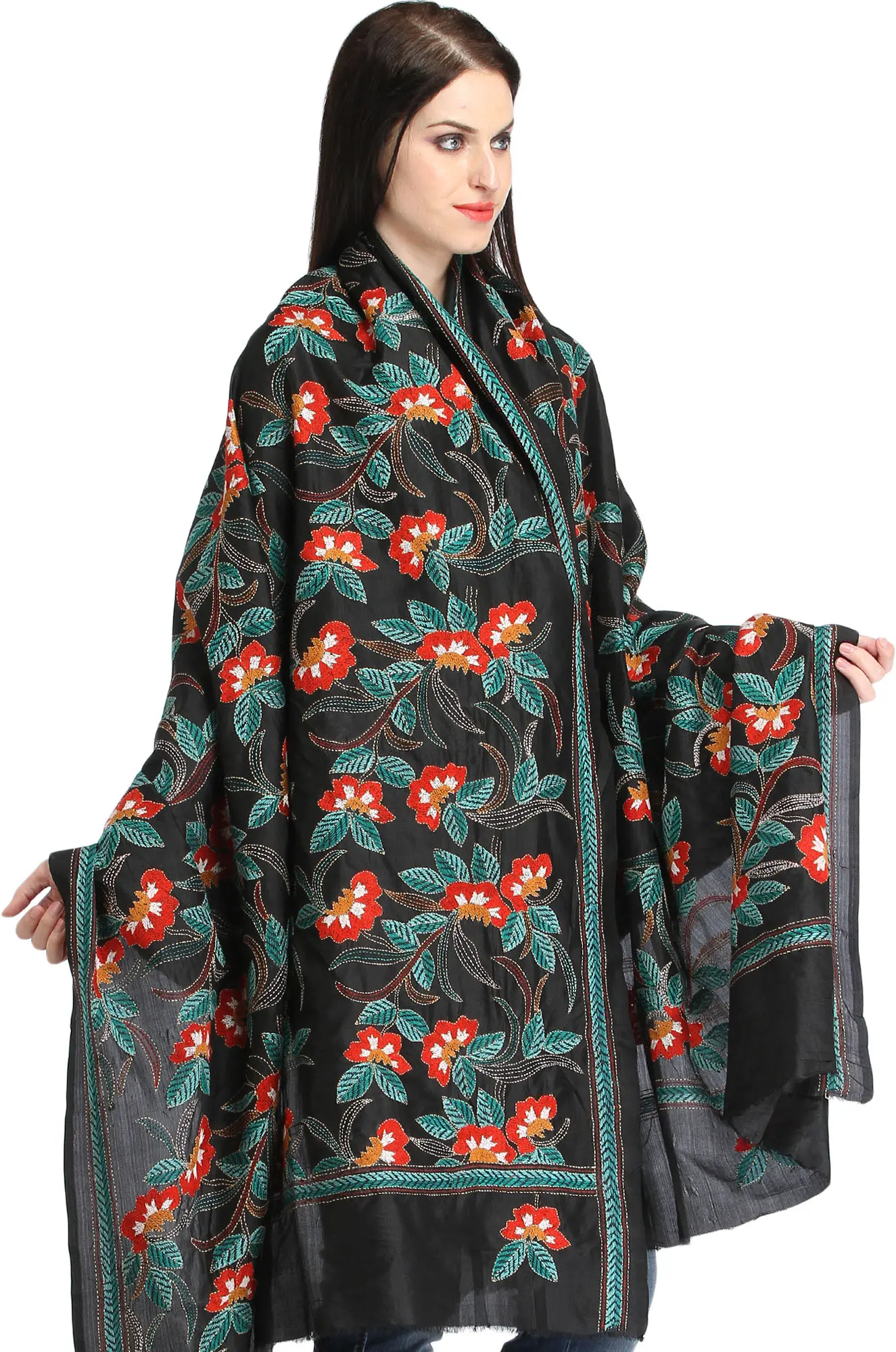 Searching for a stylish and stunning shawl here and there? Fret no more, we have got this uniquely designed and stylish kantha shawl. The phantom black colour of the shawl will add glorious touch and will make you feel like the perfect diva. What's more, the woven flowers and embroidered border of the shawl makes the piece attain an extra look. The embroidery done by the artisans all over the shawl has the capability of making any outfit alive. Specially designed to augment your charm, this shawl is ideal for your needs and preferences. The high-quality fabric used by the artisans will not only provide you comfort during the chilly winter days but also give you the best look. Additionally, the flowers embroidered all over the shawl is enough to give you a comfortable and warm feel. Shop with us and make sure you are ready to hypnotise your audience with your charm.
