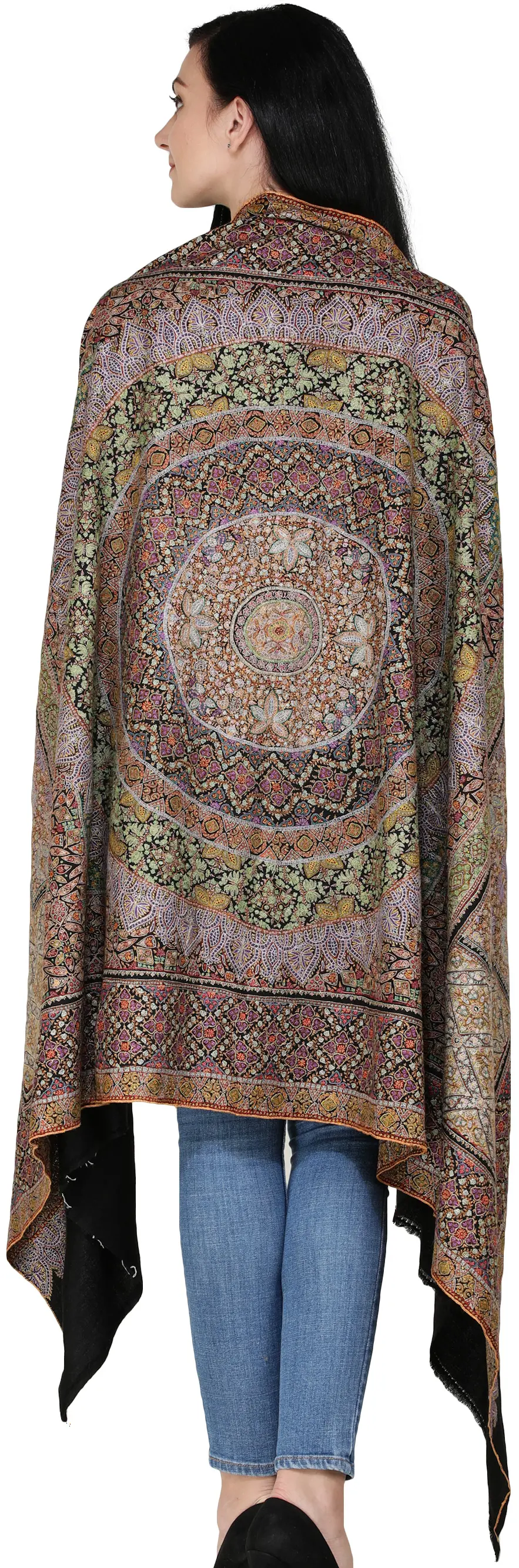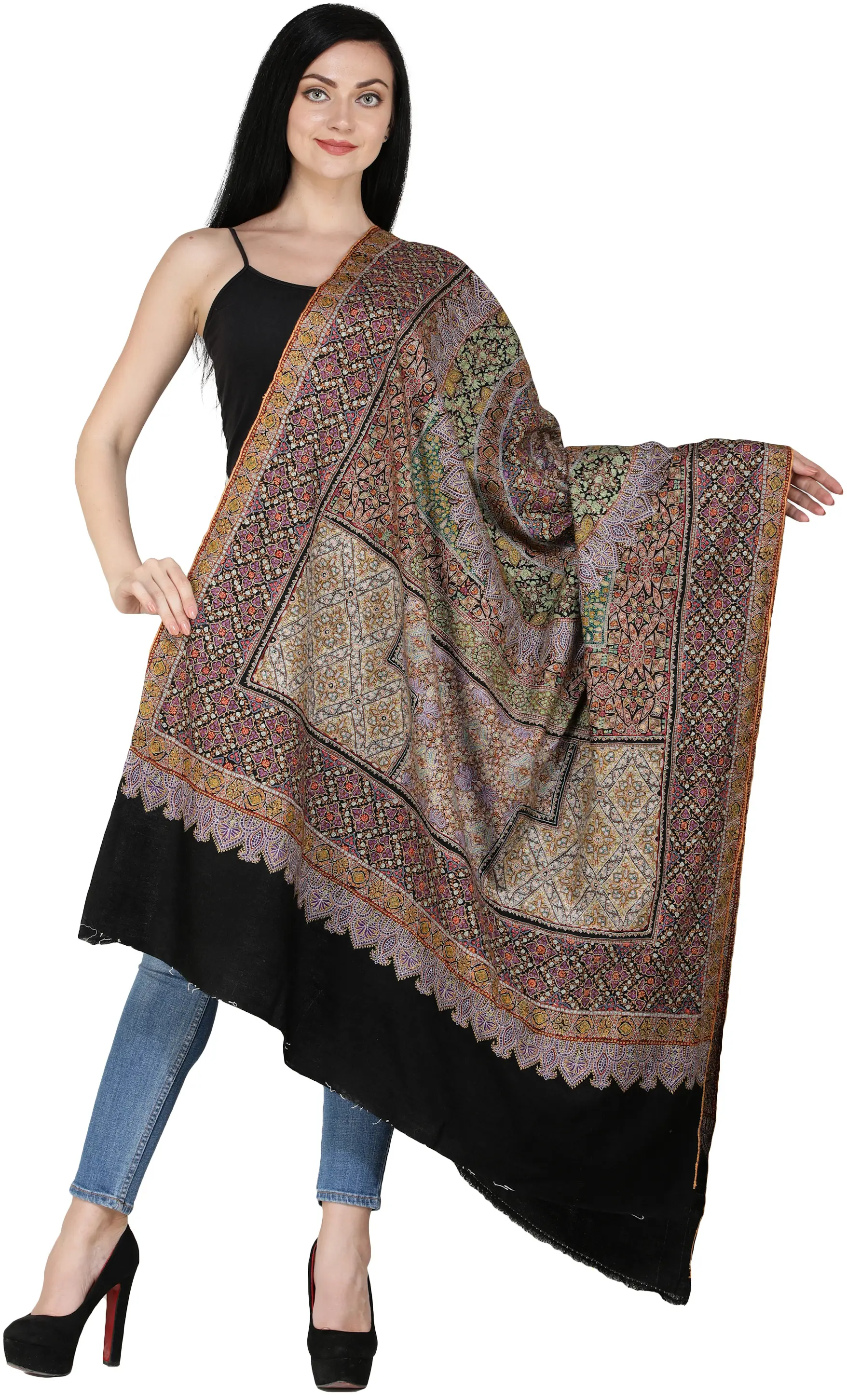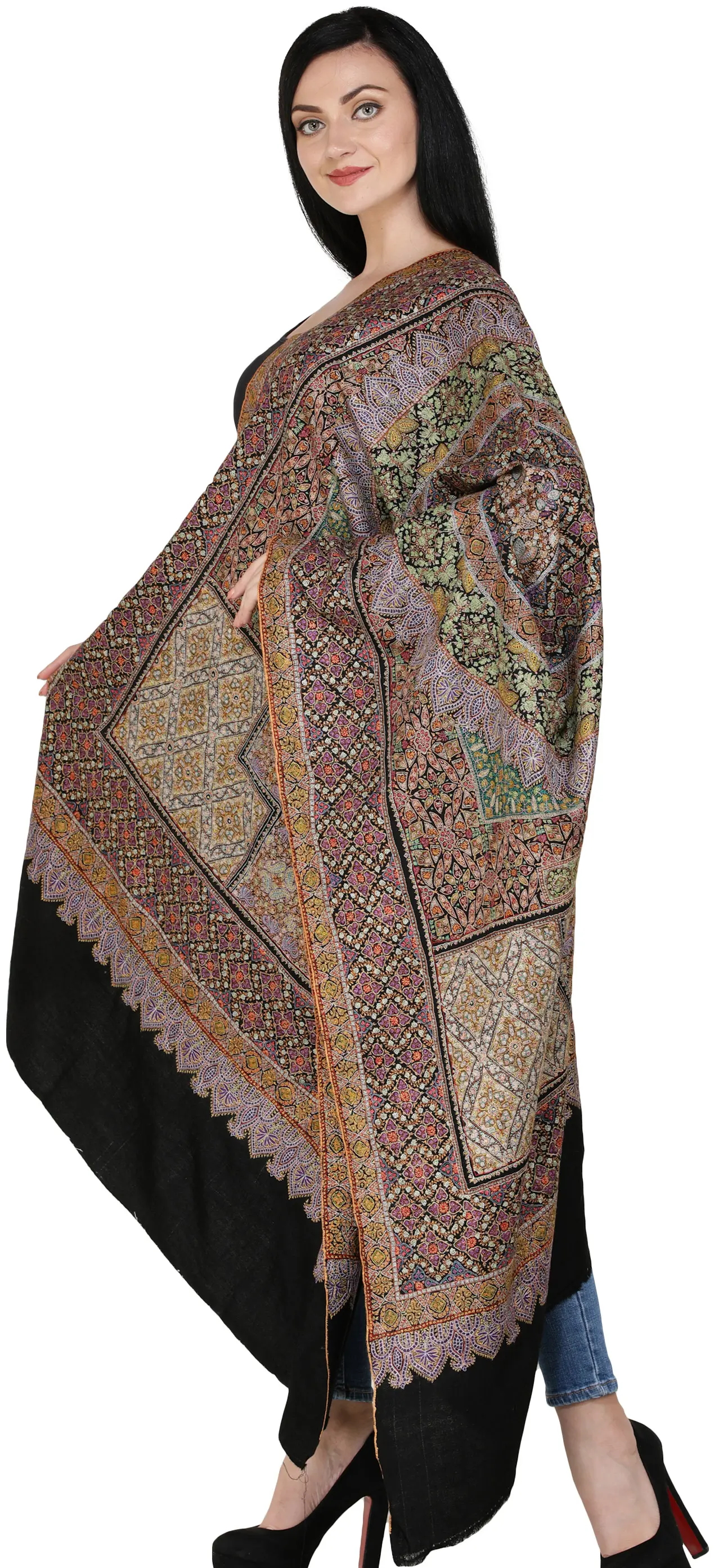 Pure Pashmina Black Paper Mache All Over Heavily Detailed Embroidery Shawl from Kashmir