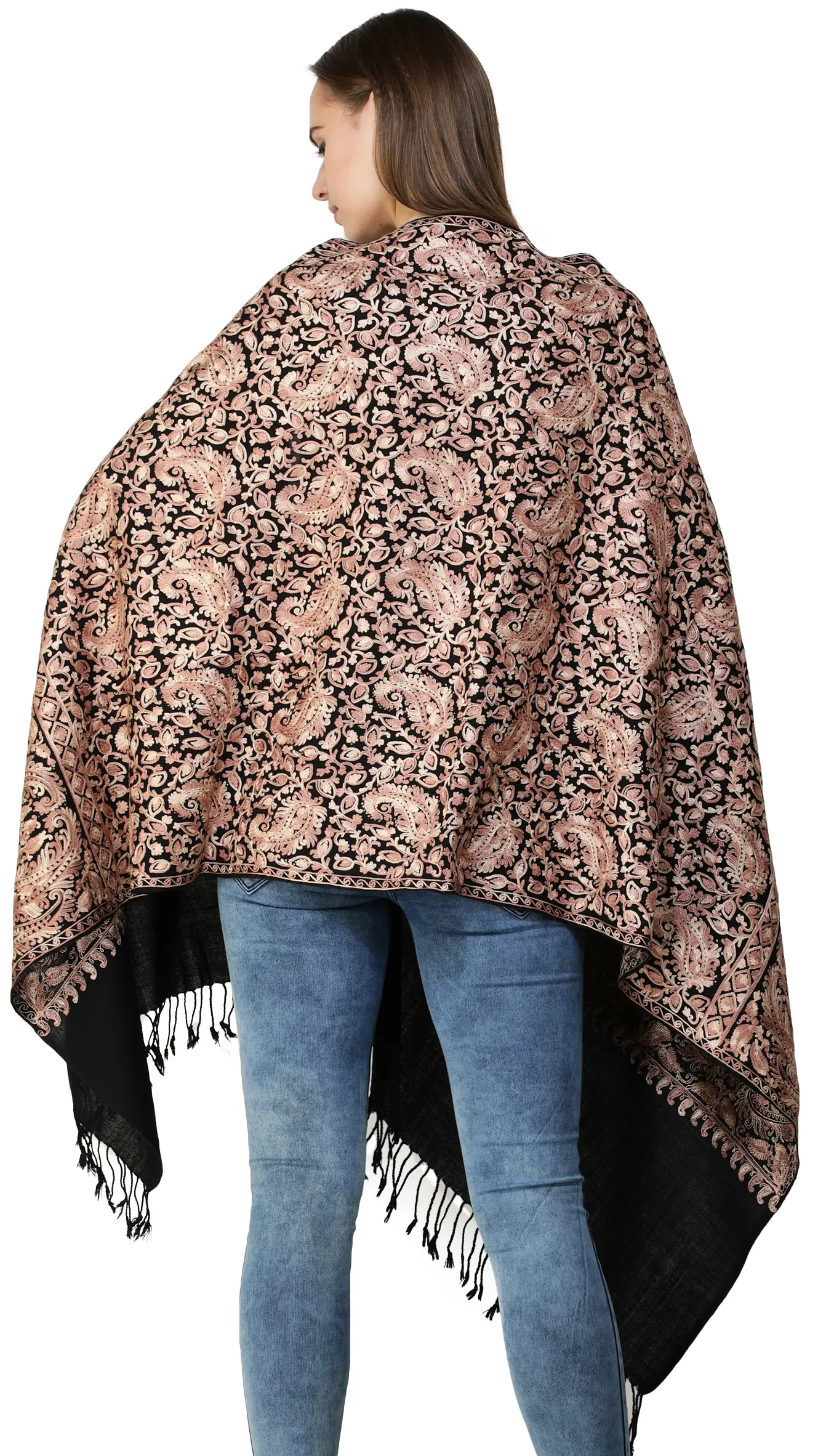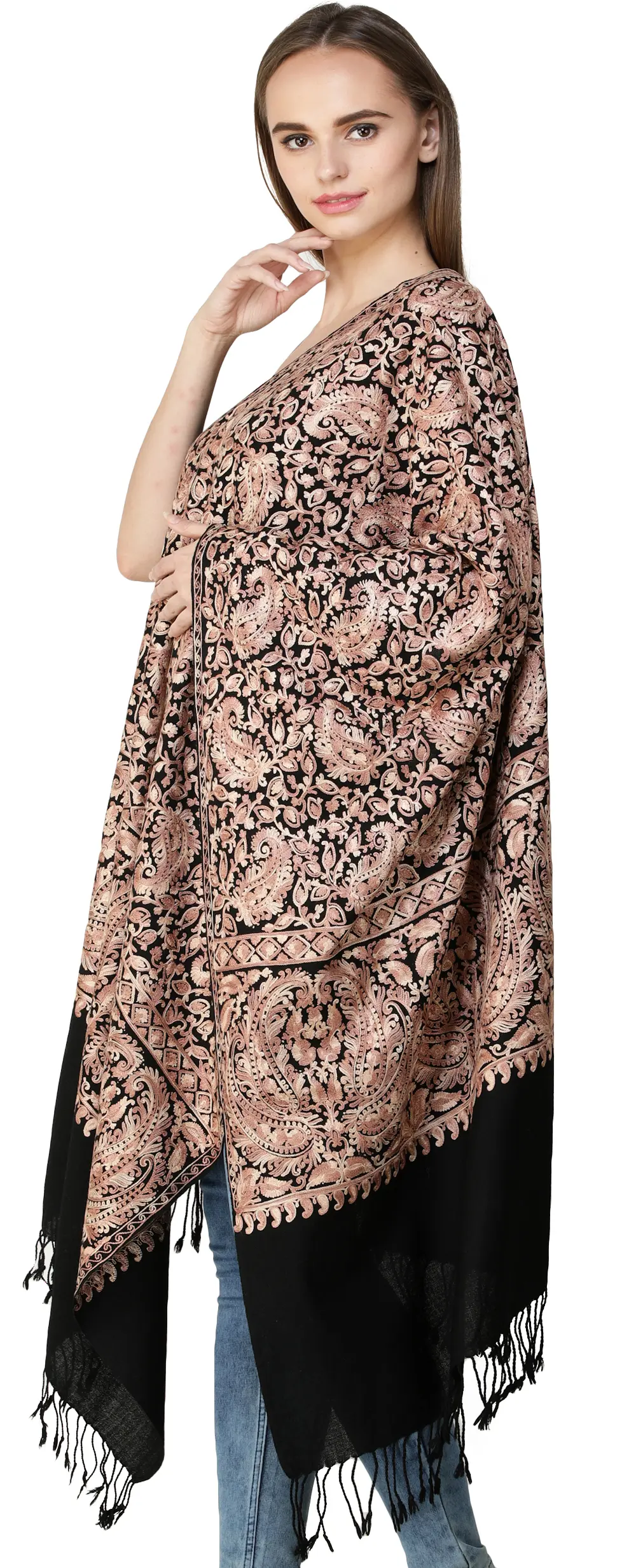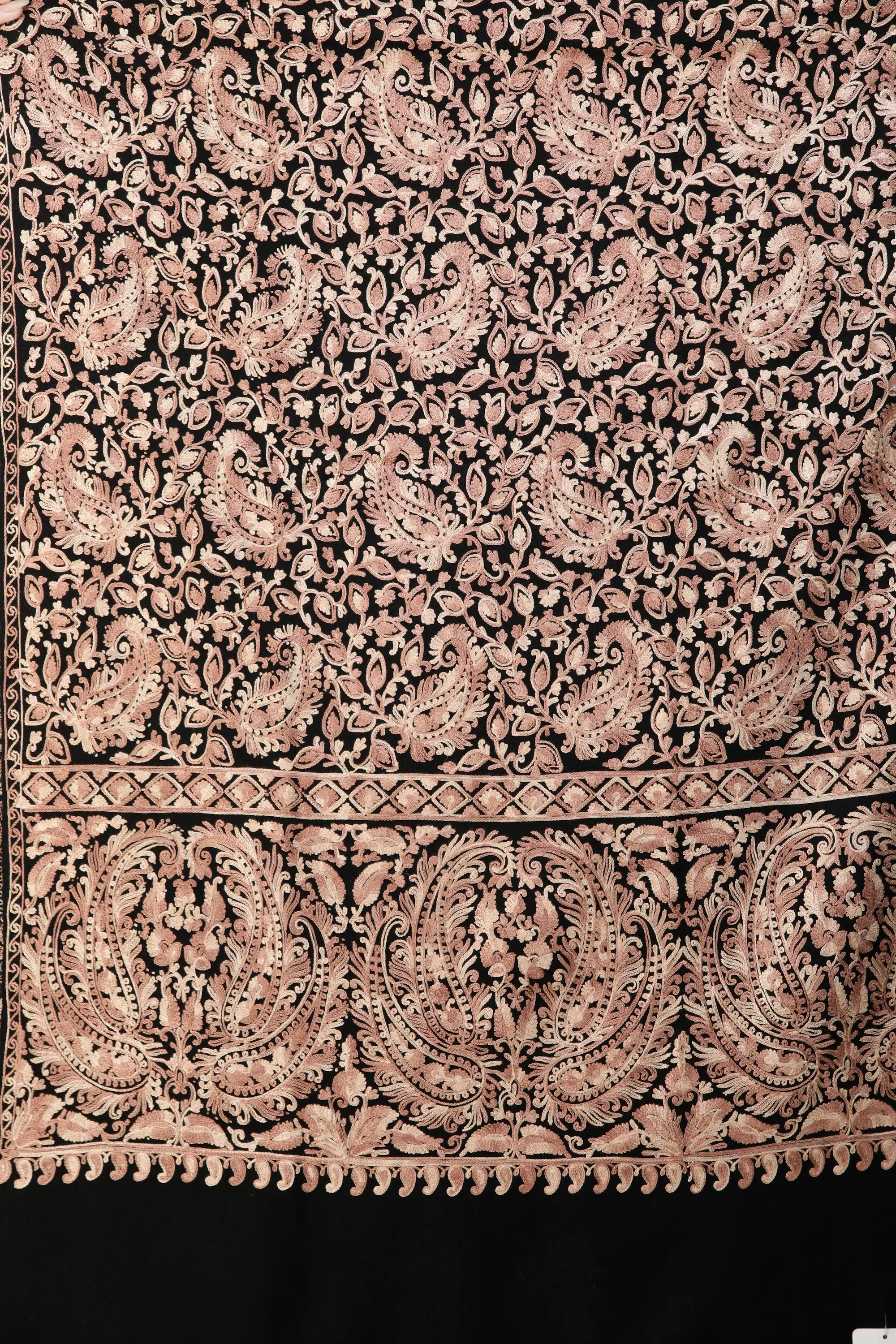 Black Shawl with Intricate Heavy Thread Embroidered Paisley and Flowers
