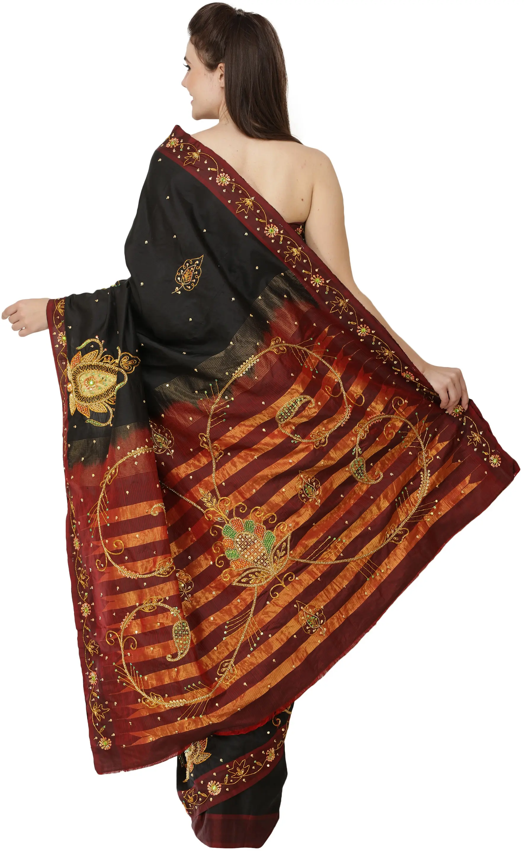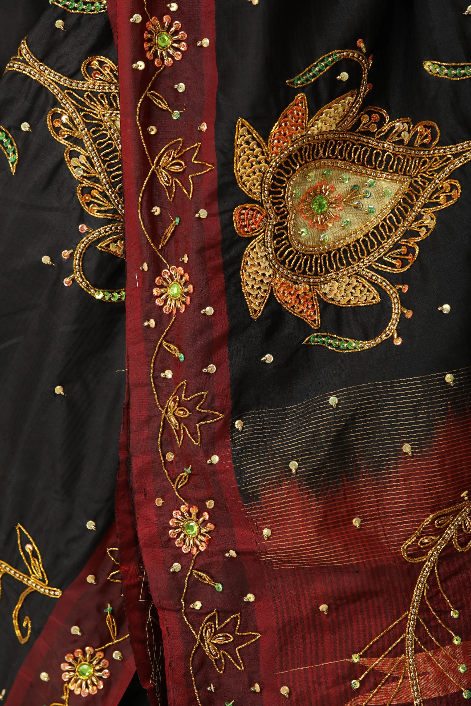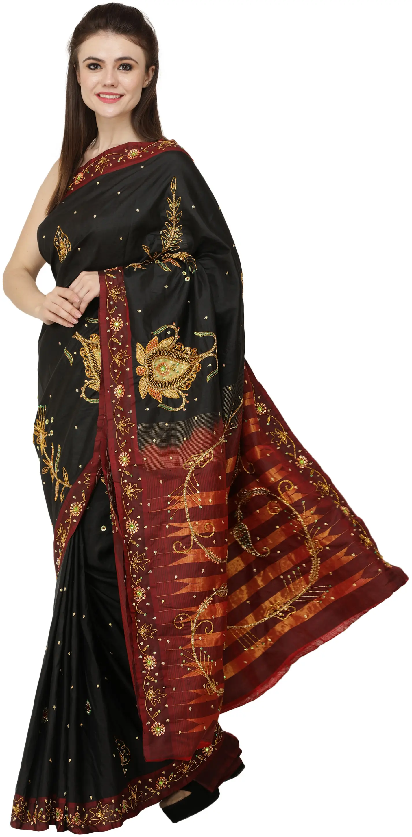 Golden Tussar Silk Saree with Traditional Pasley Motifs Woven with Green and Magenta Threadwork