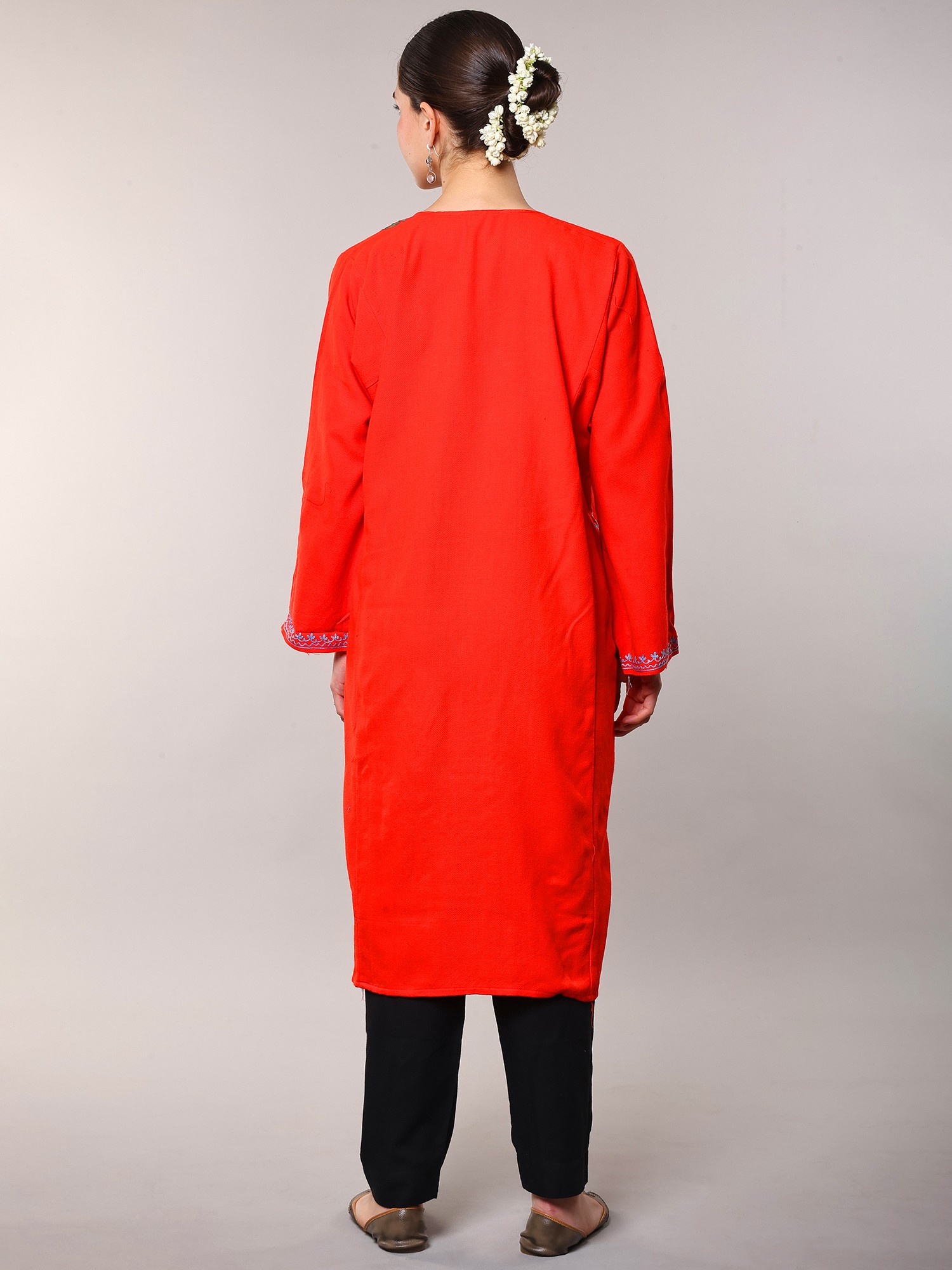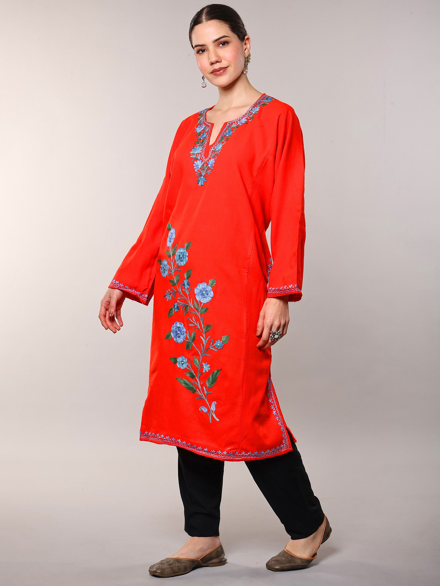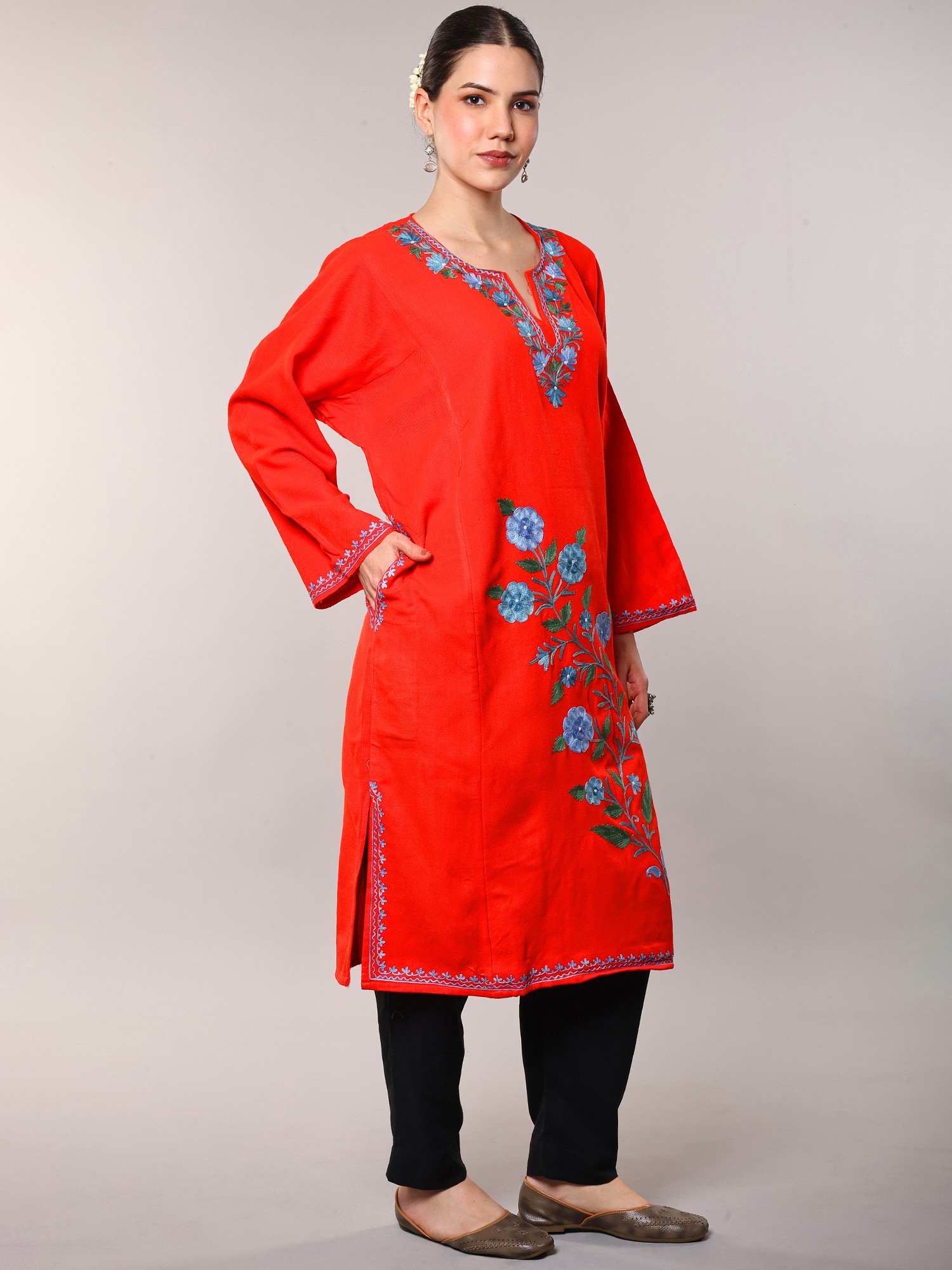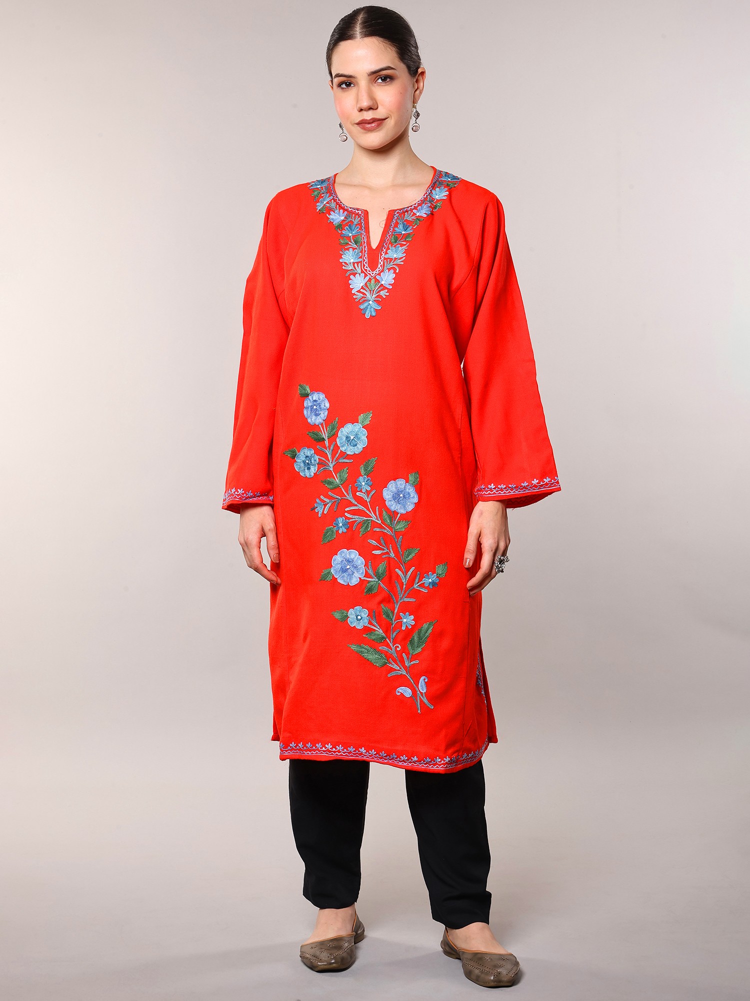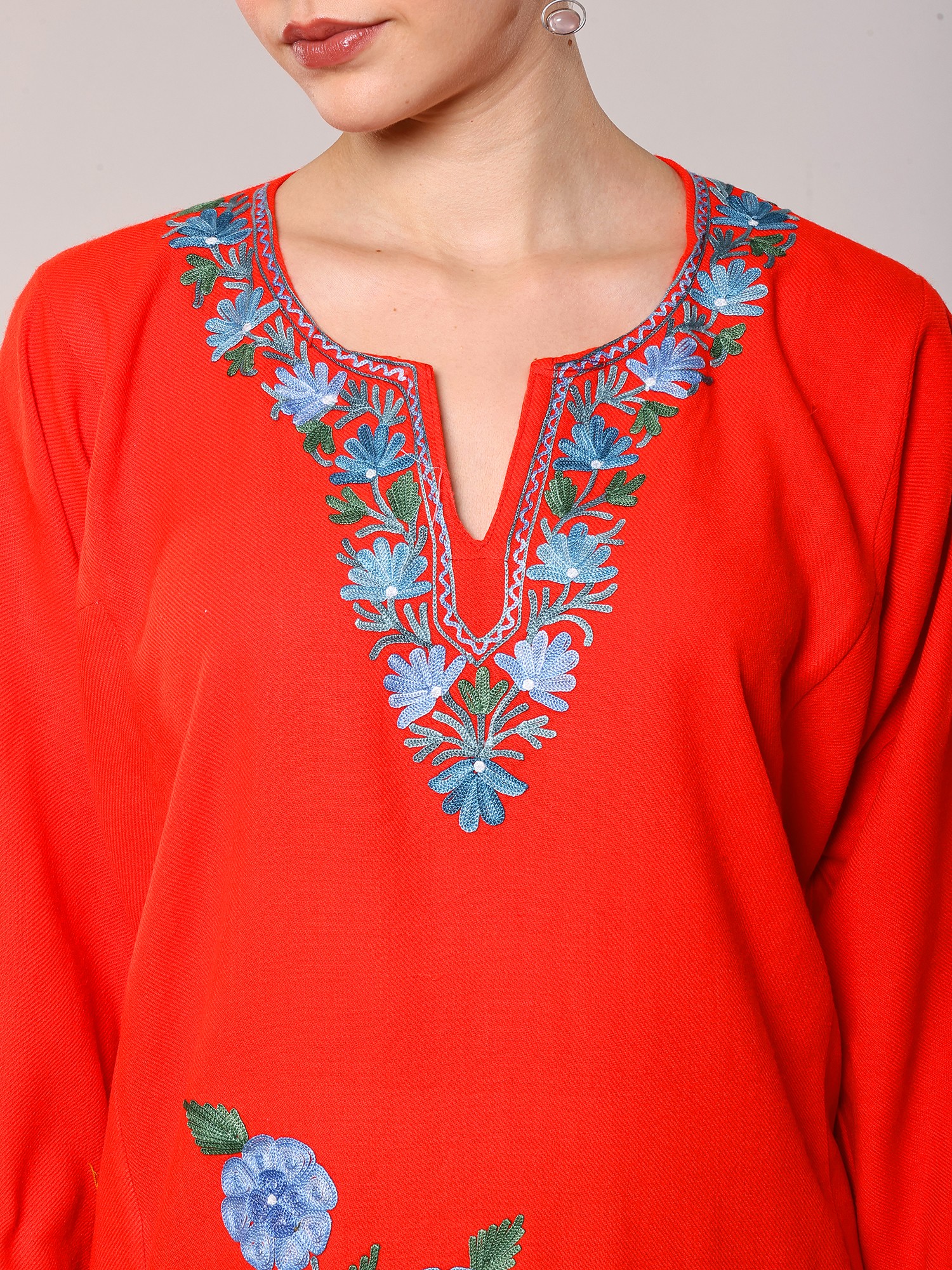 The heart of this phiran lies in its intricate Aari embroidery, a traditional Kashmiri technique known for its fine stitches and detailed designs. Cascading floral motifs, bursting with hues of fiery red, sunny orange, and cheerful yellow, are meticulously stitched onto the rich blue fabric. The embroidery gracefully outlines the V-shaped neckline, drawing attention to your face, and then flows down the front of the garment, creating a stunning visual spectacle. Each stitch is a testament to the skill and dedication of the artisans who have passed down this craft through generations. Delicate red and green thread work further accentuates the floral patterns, adding depth and dimension to the design. The sleeves and hemline are also delicately bordered with similar red embroidery, ensuring a cohesive and polished look. ––––––––––––––––––––