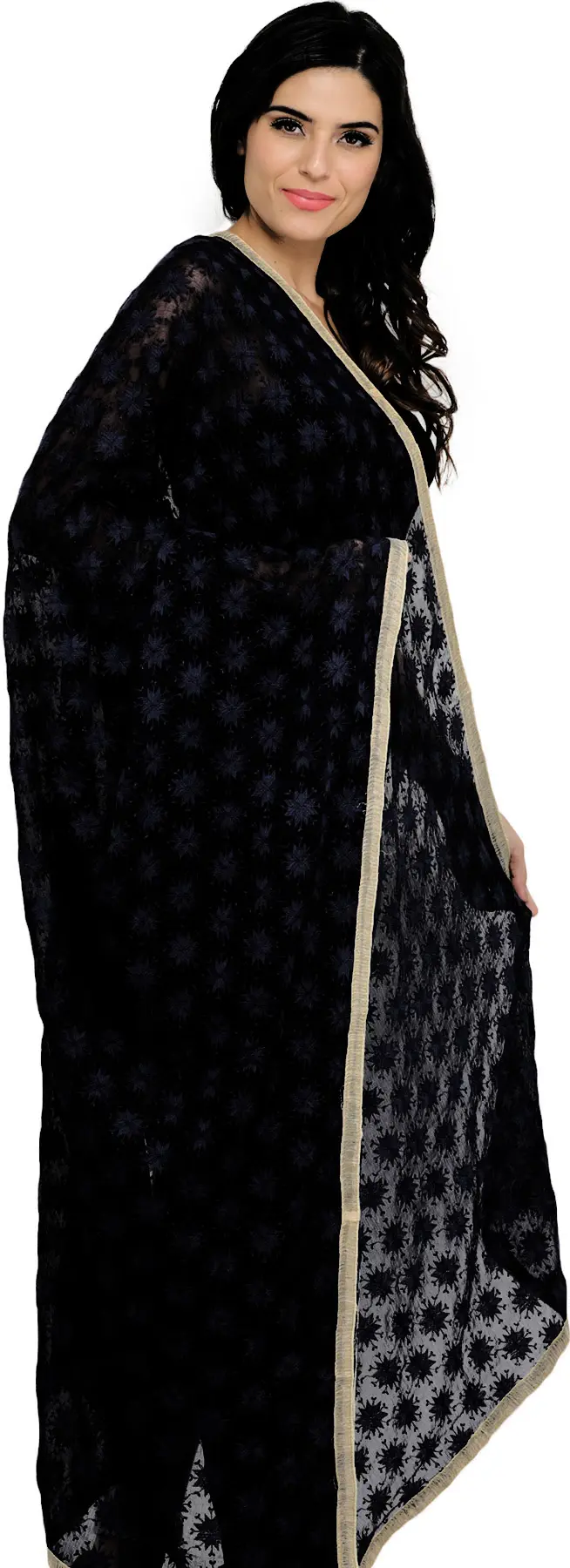 Jet-Black Stole from Kashmir with Aari Hand-Embroidered Foliage