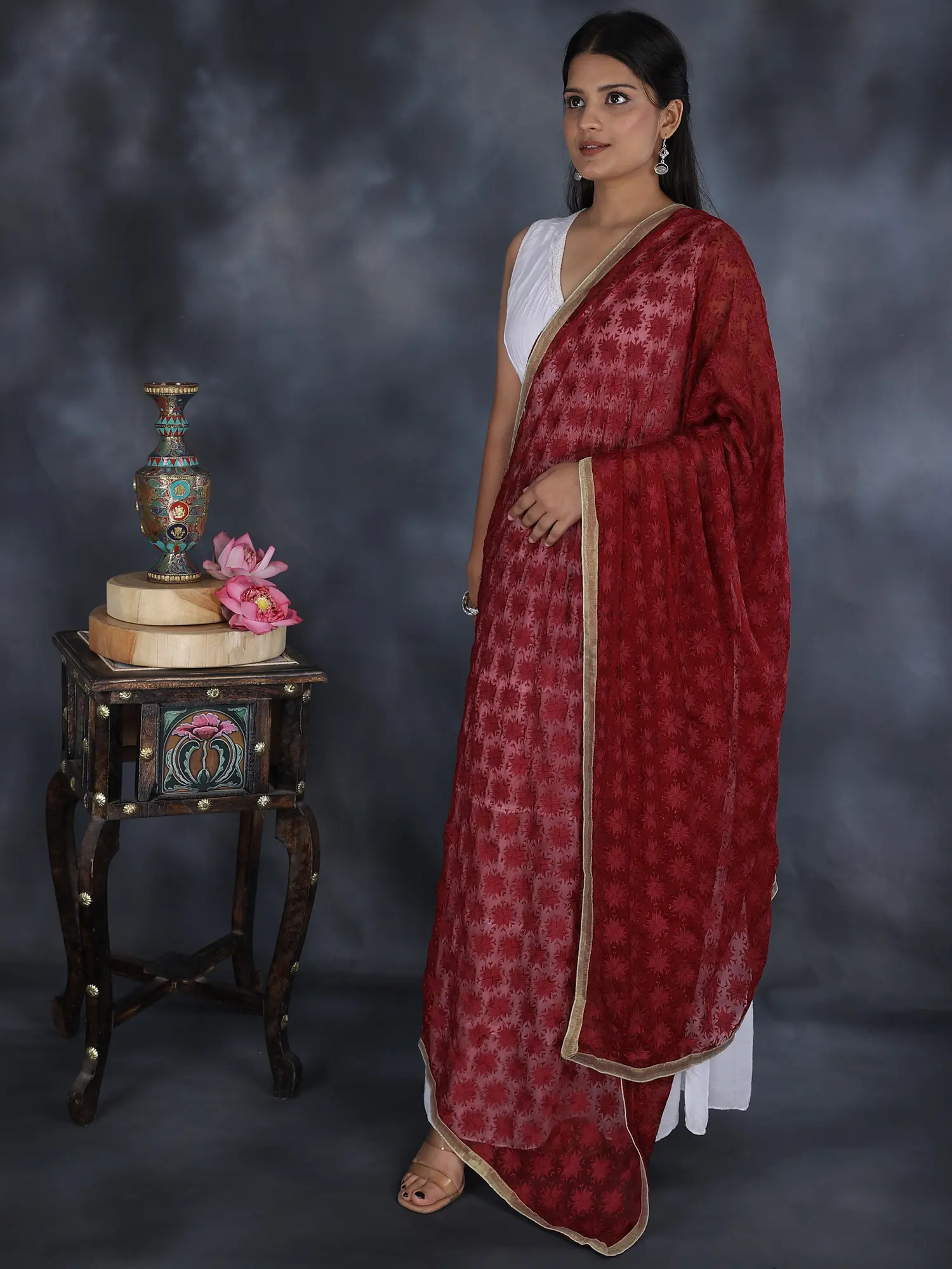 Crafted from a lightweight and breathable chiffon fabric, this dupatta drapes beautifully, offering both comfort and a graceful silhouette. The choice of chiffon ensures it is suitable for various occasions, from festive gatherings to everyday elegance. The dupatta is generously sized, providing ample fabric for versatile styling options. It can be elegantly draped over the shoulders, worn as a headscarf, or even incorporated into ethnic outfits to add a touch of sophisticated charm. The self-color thread embroidery creates a subtle yet captivating texture, allowing the intricate bootis (small floral motifs) to stand out with understated grace.