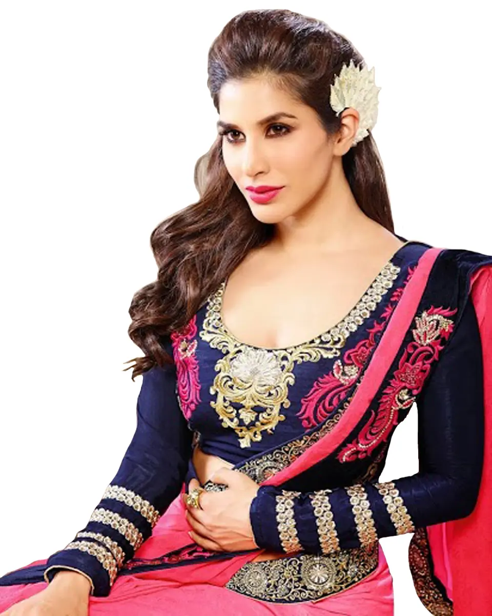 The Pink and Dark-Blue Designer Sari, crafted from fine georgette, is a mesmerizing fusion of elegance and style. The harmonious blend of pink and dark-blue hues creates a captivating drape that's perfect for everyday fashion statements. Its allure is further enhanced by the intricate Zari-embroidered floral patch border adorned with sparkling crystals, adding a touch of richness and glamour to its overall design. This sari not only celebrates the timeless beauty of the pink and blue palette but also exudes an aura of sophistication, making it an ideal choice for those seeking to make a stylish and chic statement in their daily attire.