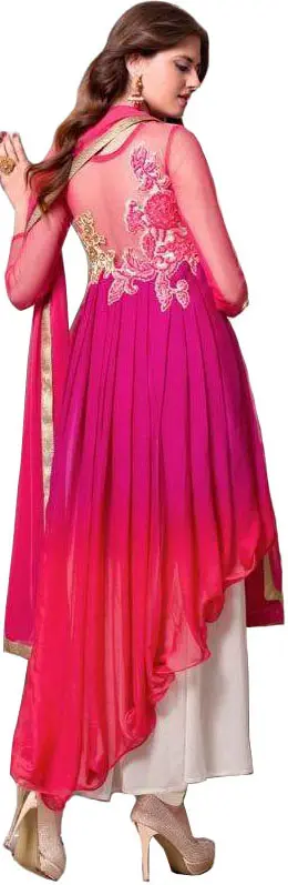 The upper layer of the Anarkali cascades in a mesmerizing ombre effect, transitioning seamlessly from a vibrant, rich pink to a soft, fiery red. This gradient of color is not just a visual delight but also evokes a sense of effortless movement and fluidity. Crafted from delicate Georgette, this layer drapes beautifully, offering a light and airy feel. Complementing this vibrant hue is an underlying layer of soft ivory, providing a subtle contrast that highlights the beauty of the ombre. This inner layer adds depth and a sophisticated base, ensuring a polished and complete look. The sheer Net sleeves add a touch of alluring modesty, extending the intricate detailing of the bodice all the way to the wrists.