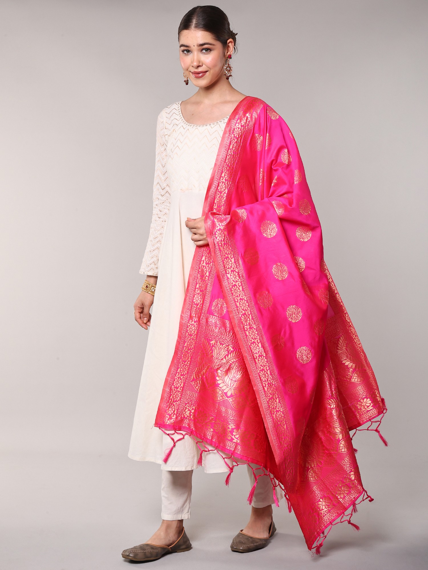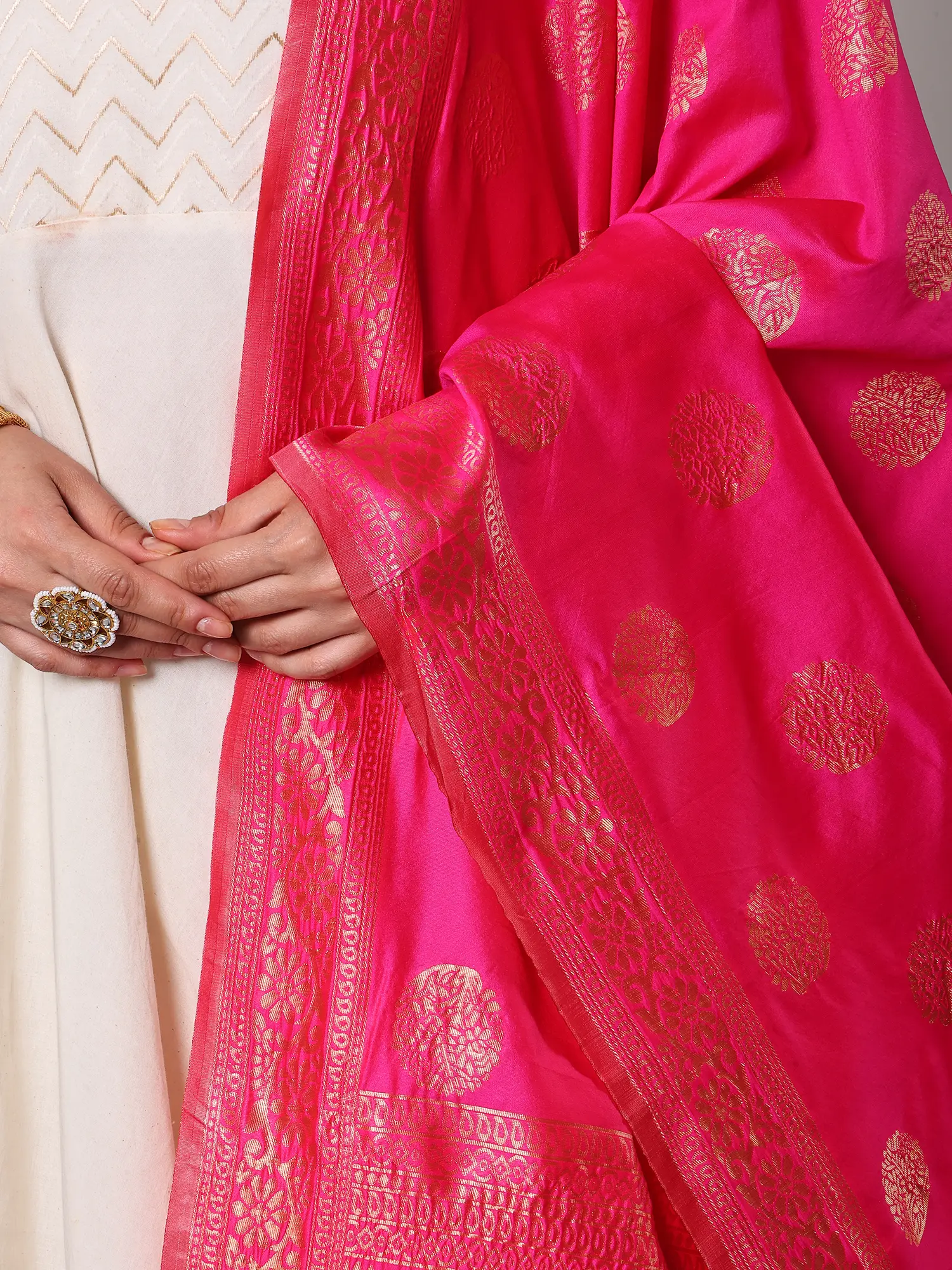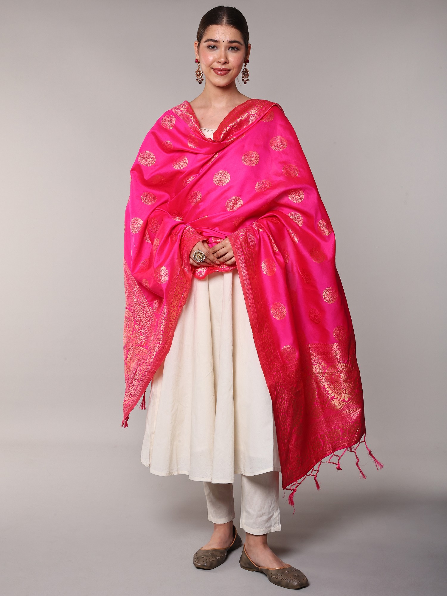 Deep-Pink Art Silk Banarasi Dupatta with Zari Brocaded Floral Vines