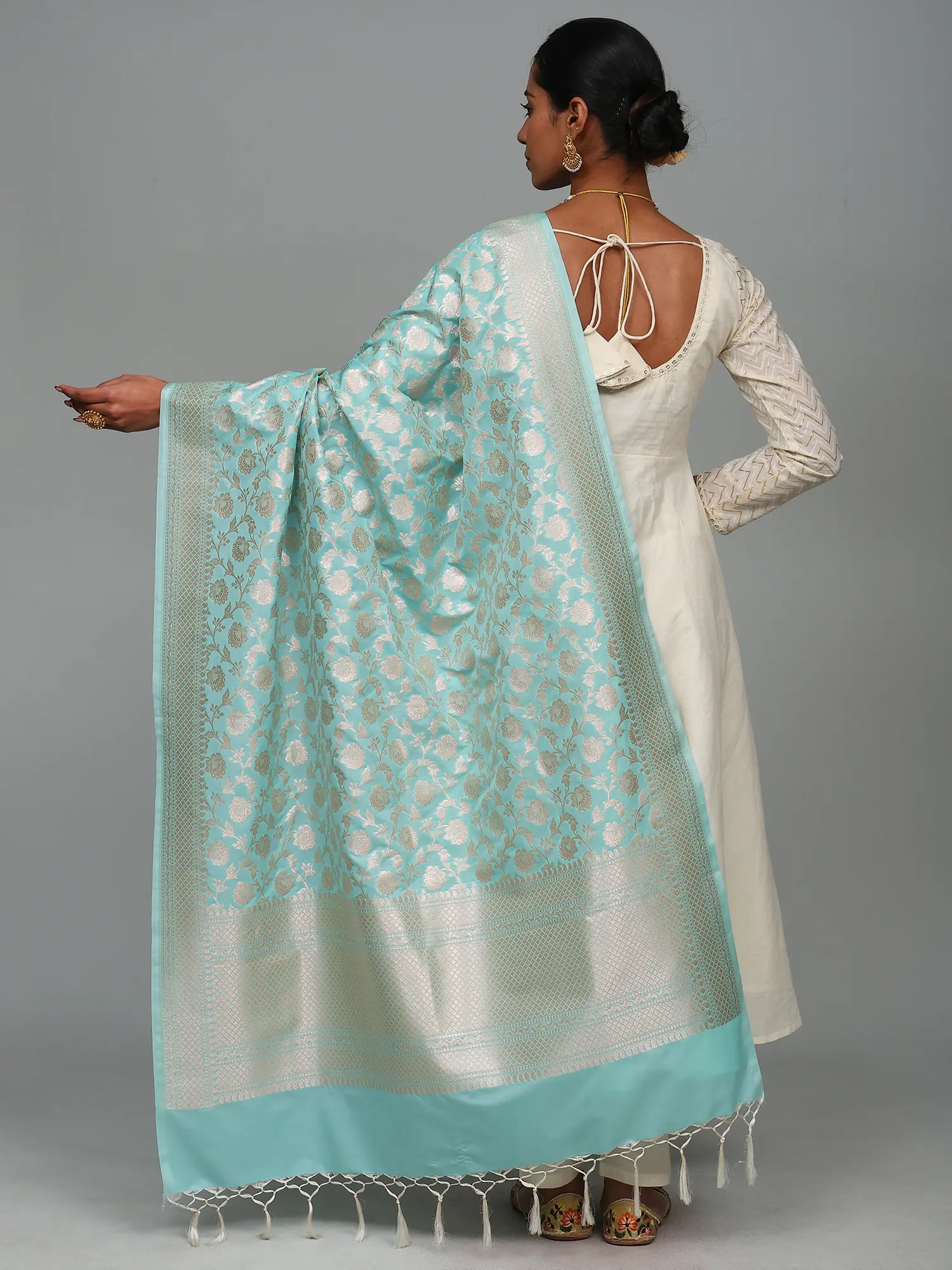 Grace your ensemble with this captivating art silk dupatta, a stunning blend of elegance and artistry. The rich, flowing fabric drapes beautifully, adding a touch of sophistication to any outfit. Its delicate mint green hue is both refreshing and versatile, making it a perfect addition to your wardrobe. The intricate all-over floral vine pattern, meticulously woven with shimmering silver threads, creates a captivating visual effect that's sure to turn heads. This dupatta is more than just an accessory; it's a statement piece that reflects your impeccable taste.