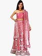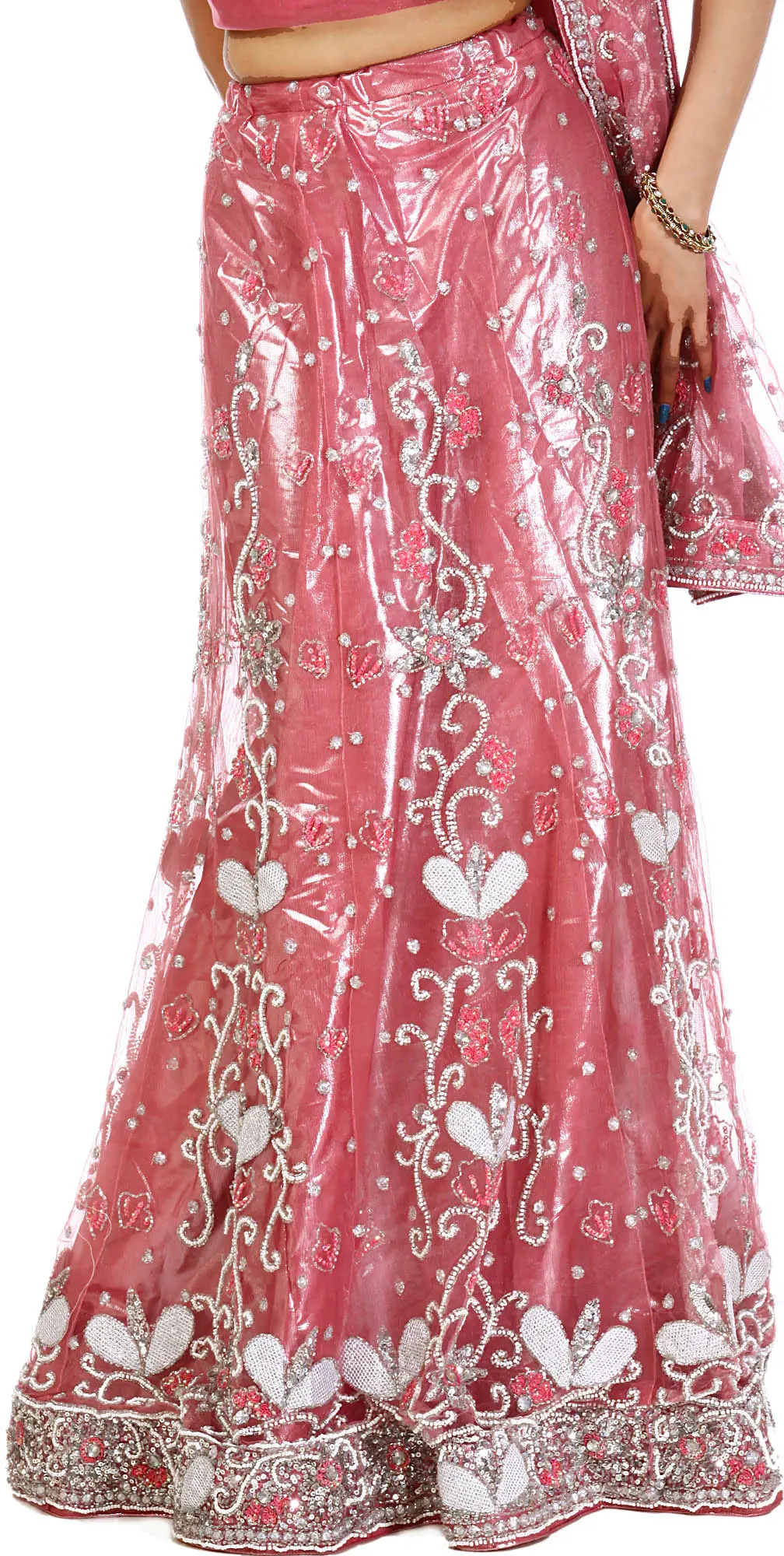 The plain shimmer blouse is paired with a contrasting smooth flowing pleated lehenga, filled with tiny silver sequins all over and for a heavy and party look, it is beautifully embroidered in floral patterns starting from below the belt till the end in vertical wavy patterns; every pleat of the lehenga has a vertical floral strip embroidered over it all around. Bottom is bordered heavily in similar flower patterns. The weaver has used the embroidery of silver sequins and pink beads in an enchanting way, such that every design adds on to the charm of the lehenga.