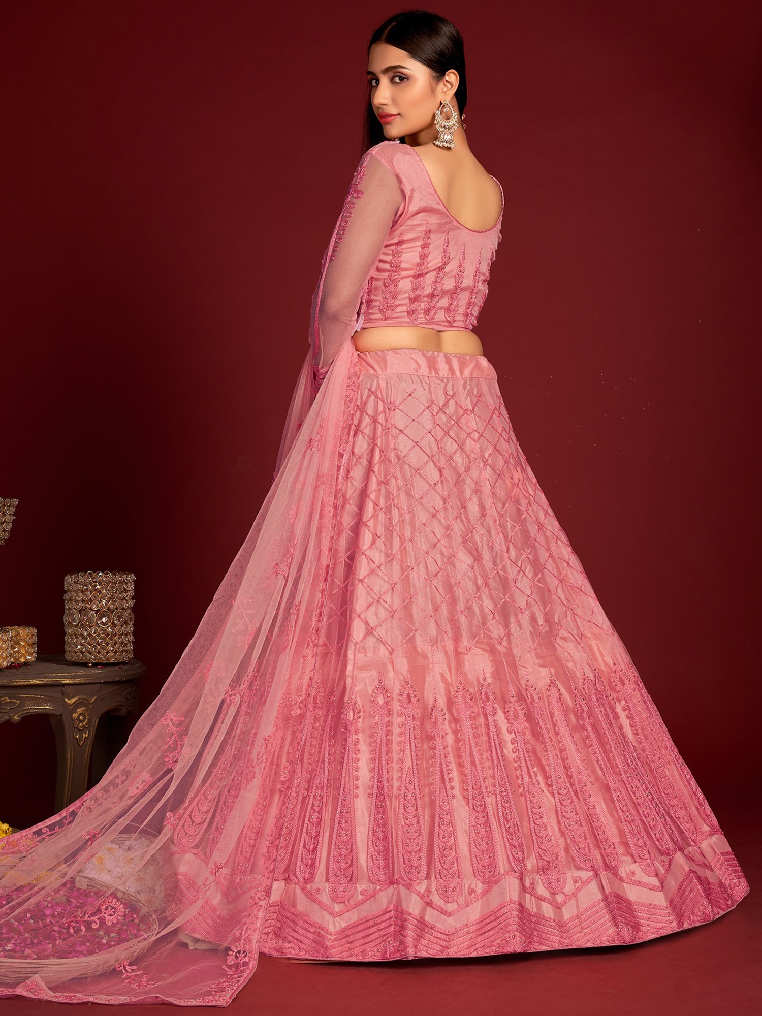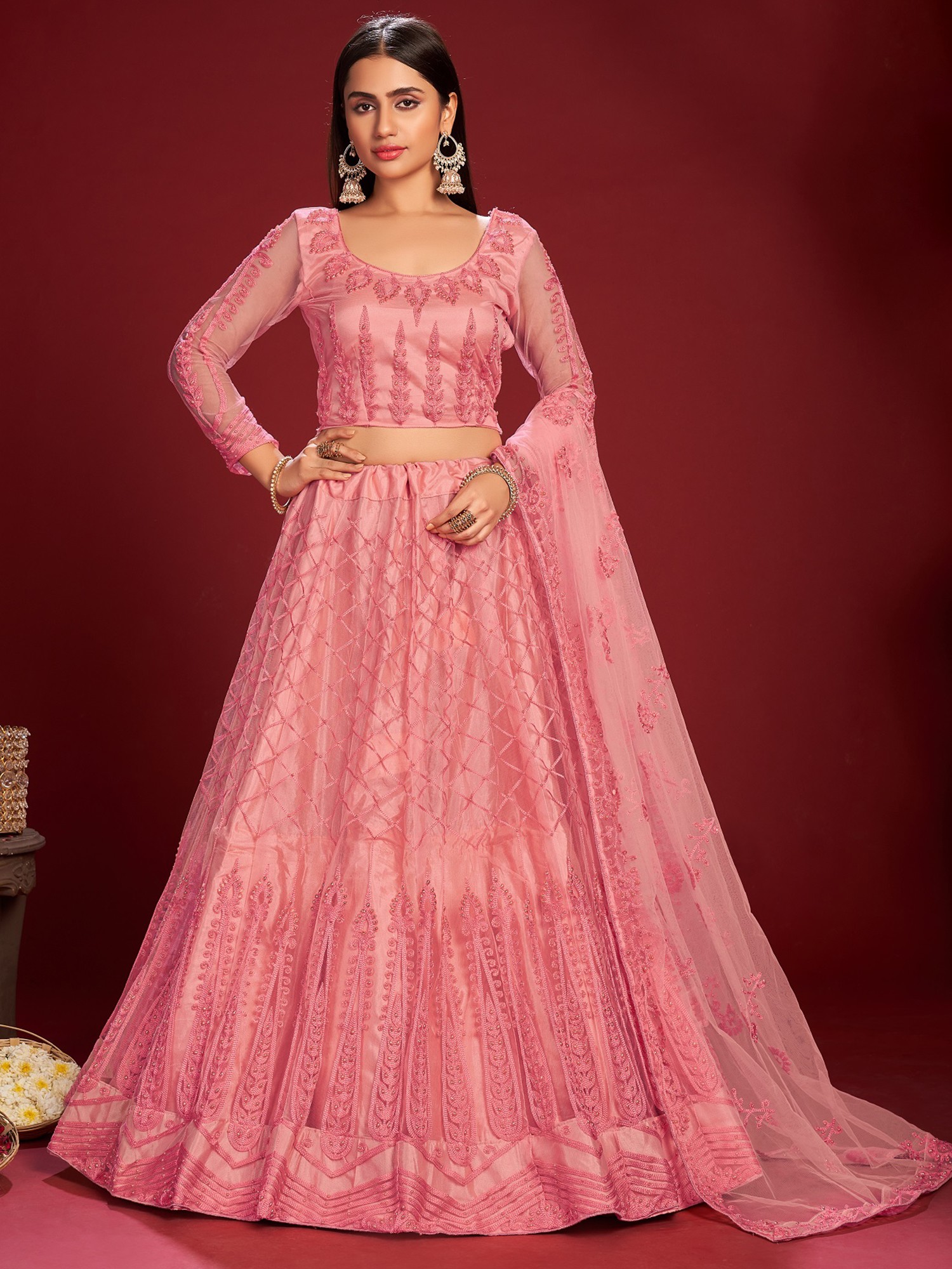 Light-Pink Soft Net Thread Embroidered Lehenga Choli with Sheer Dupatta