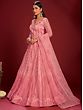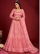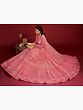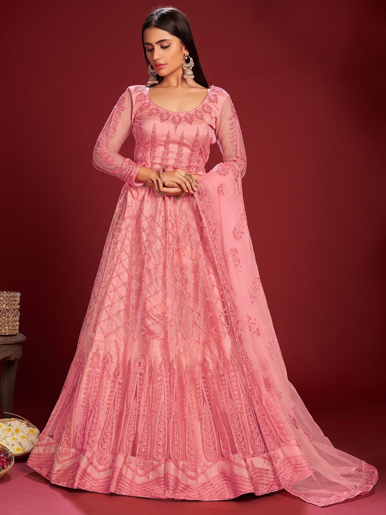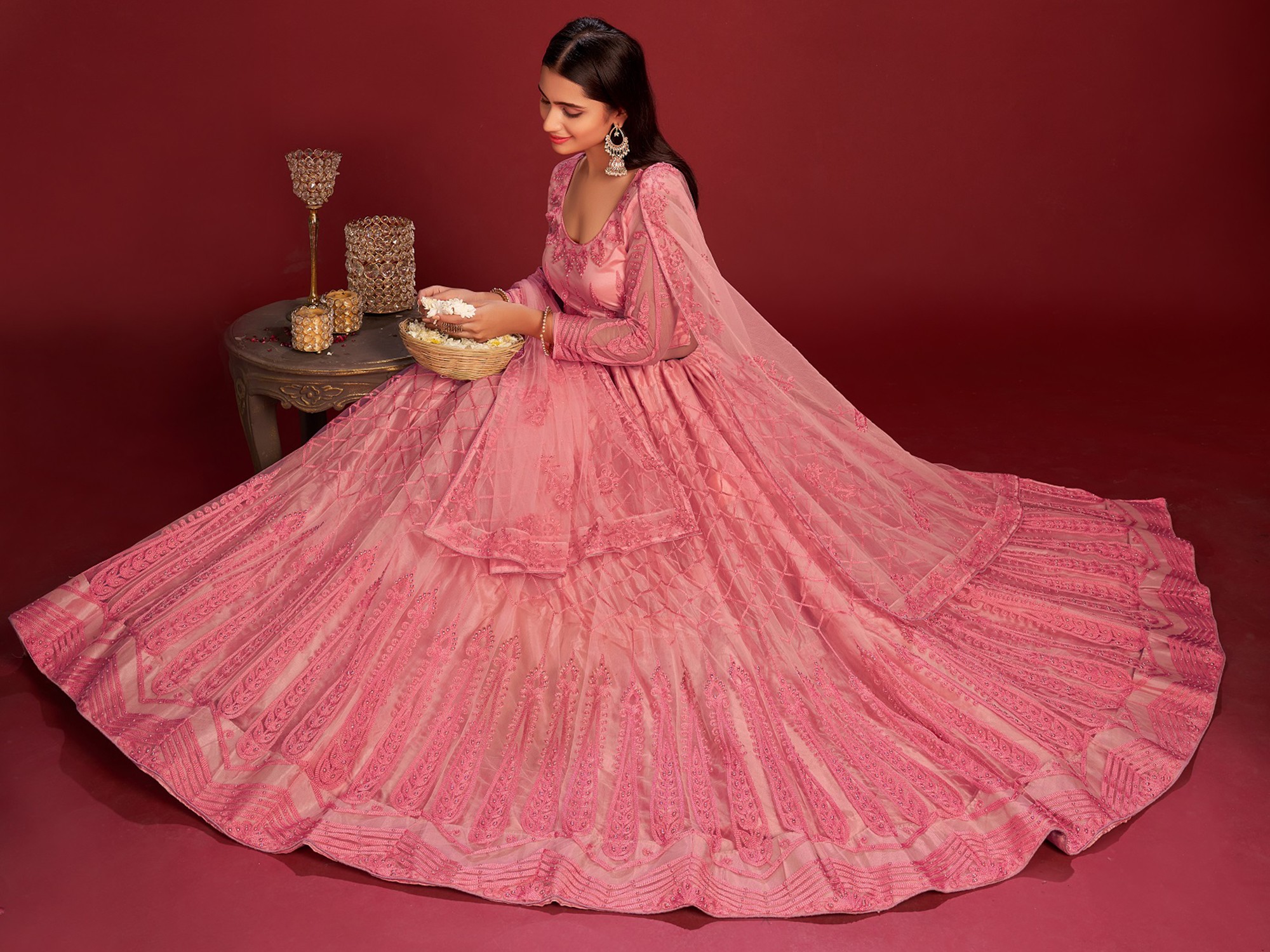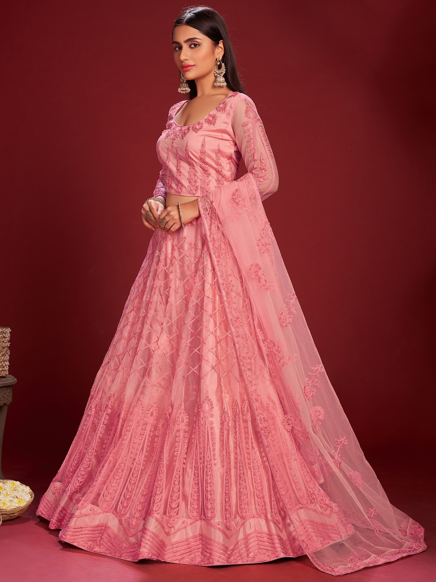 Pink-Dolphin Kali-Diamond Pattern Net Lehenga Choli With Thread-Stone Work On All-Over And Floral Butta Dupatta