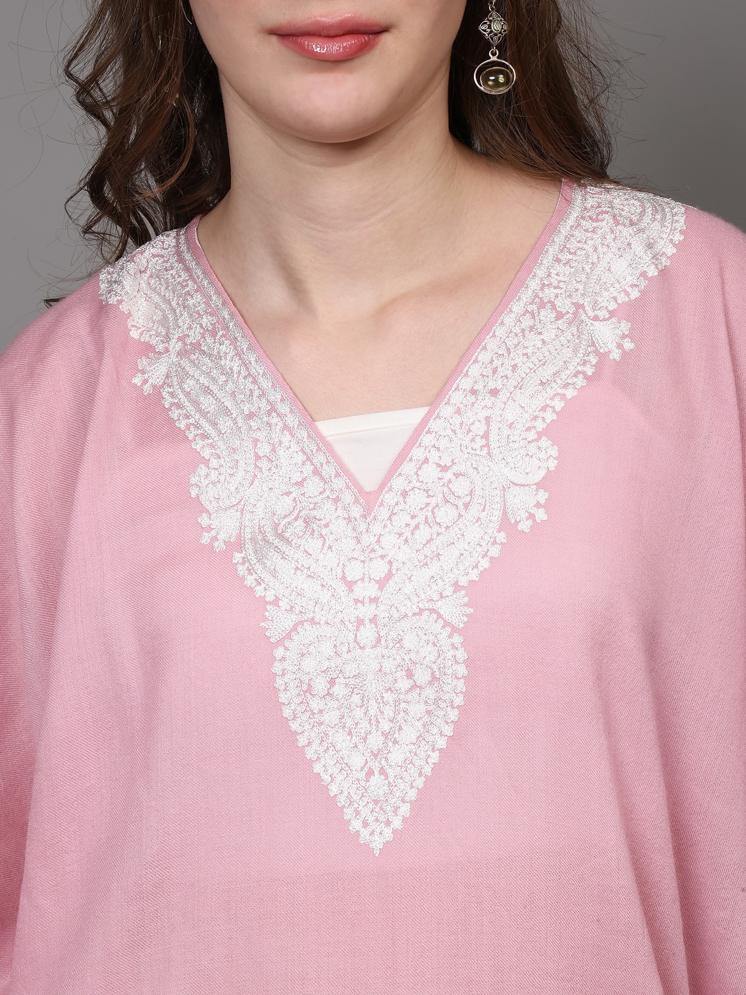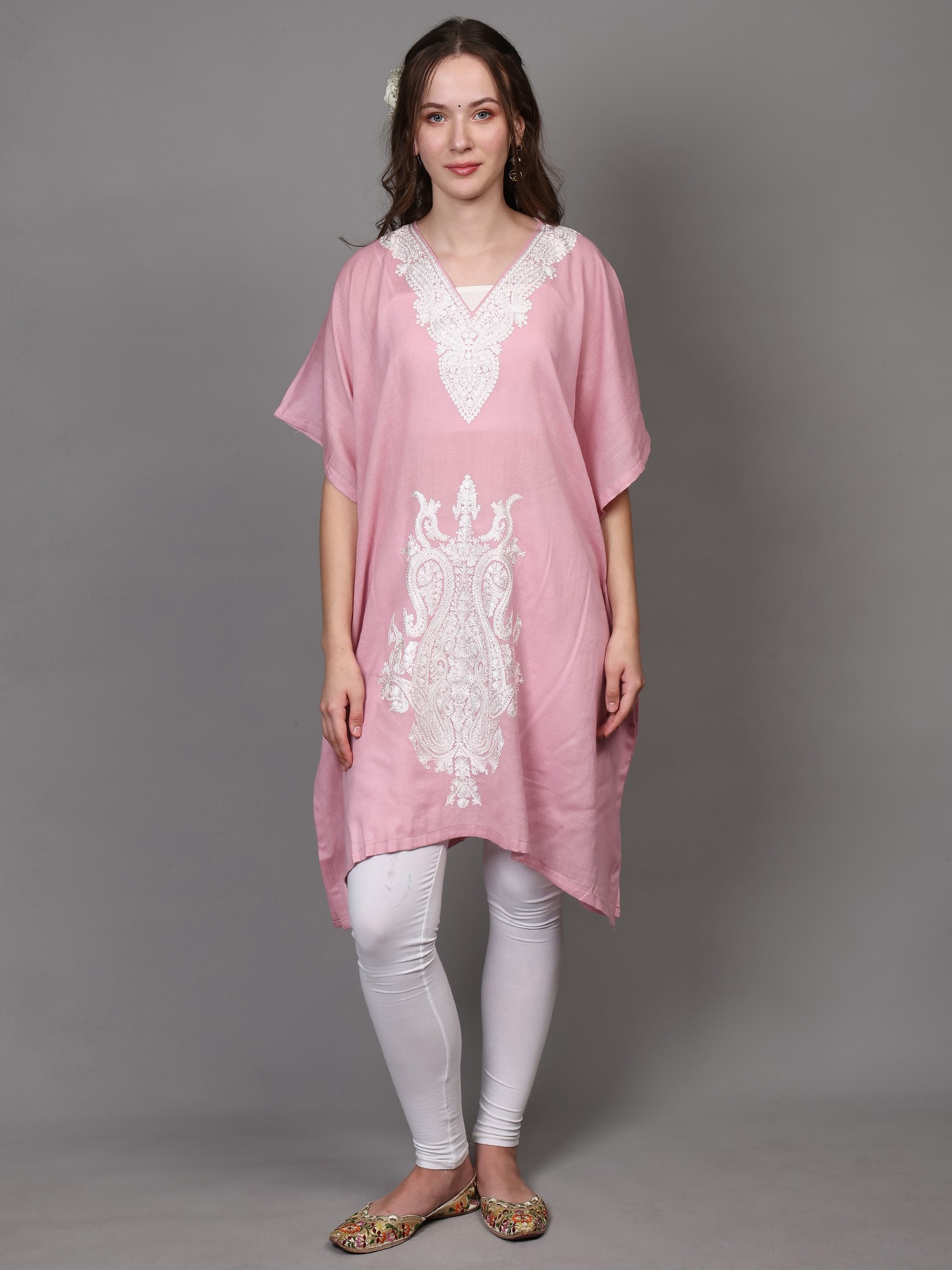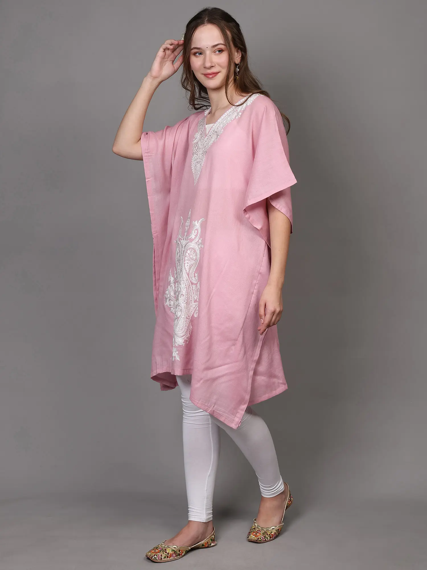 Flamingo-Pink Kashmiri Long Kaftan with Chain Stitch Aari Embroidery