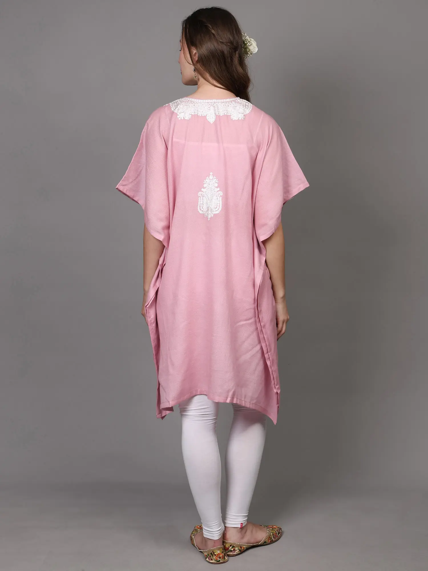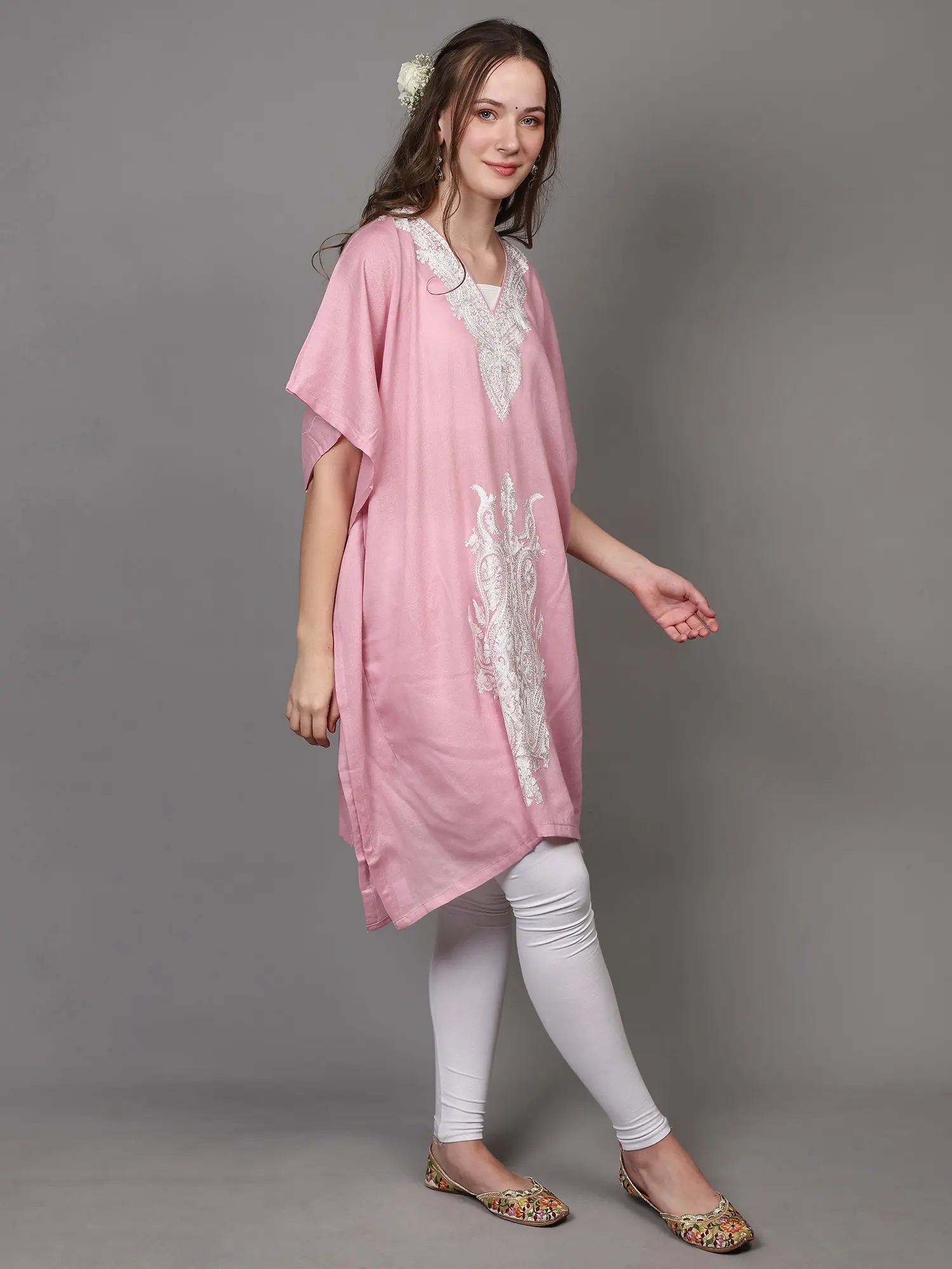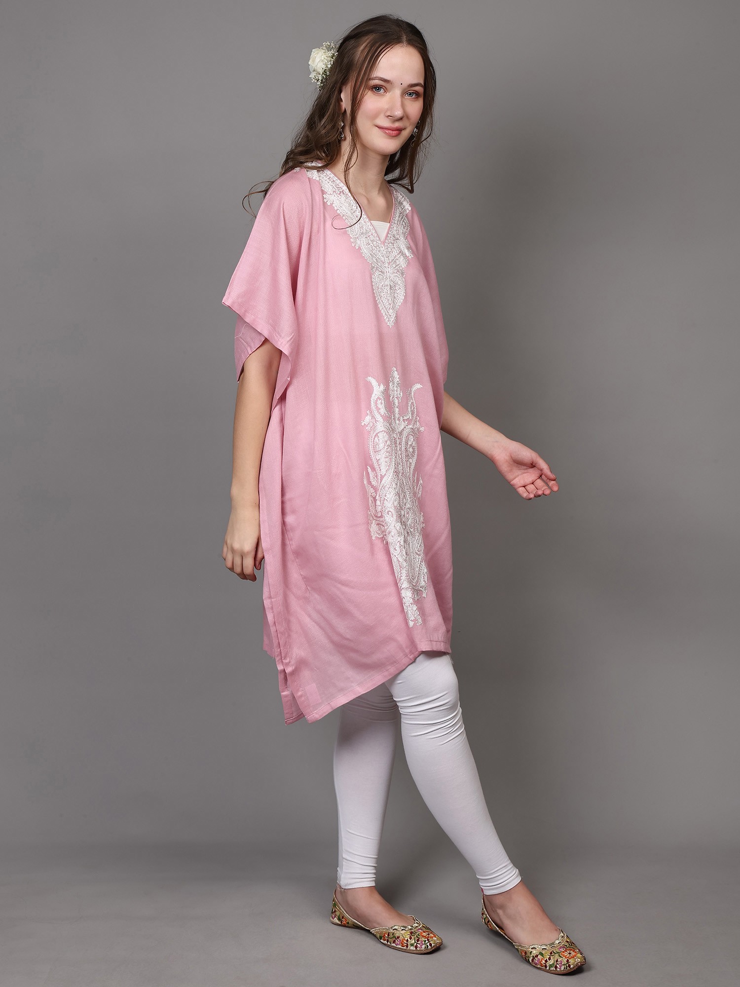 Flamingo-Pink Kashmiri Long Kaftan with Chain Stitch Aari Embroidery