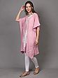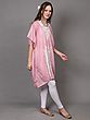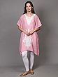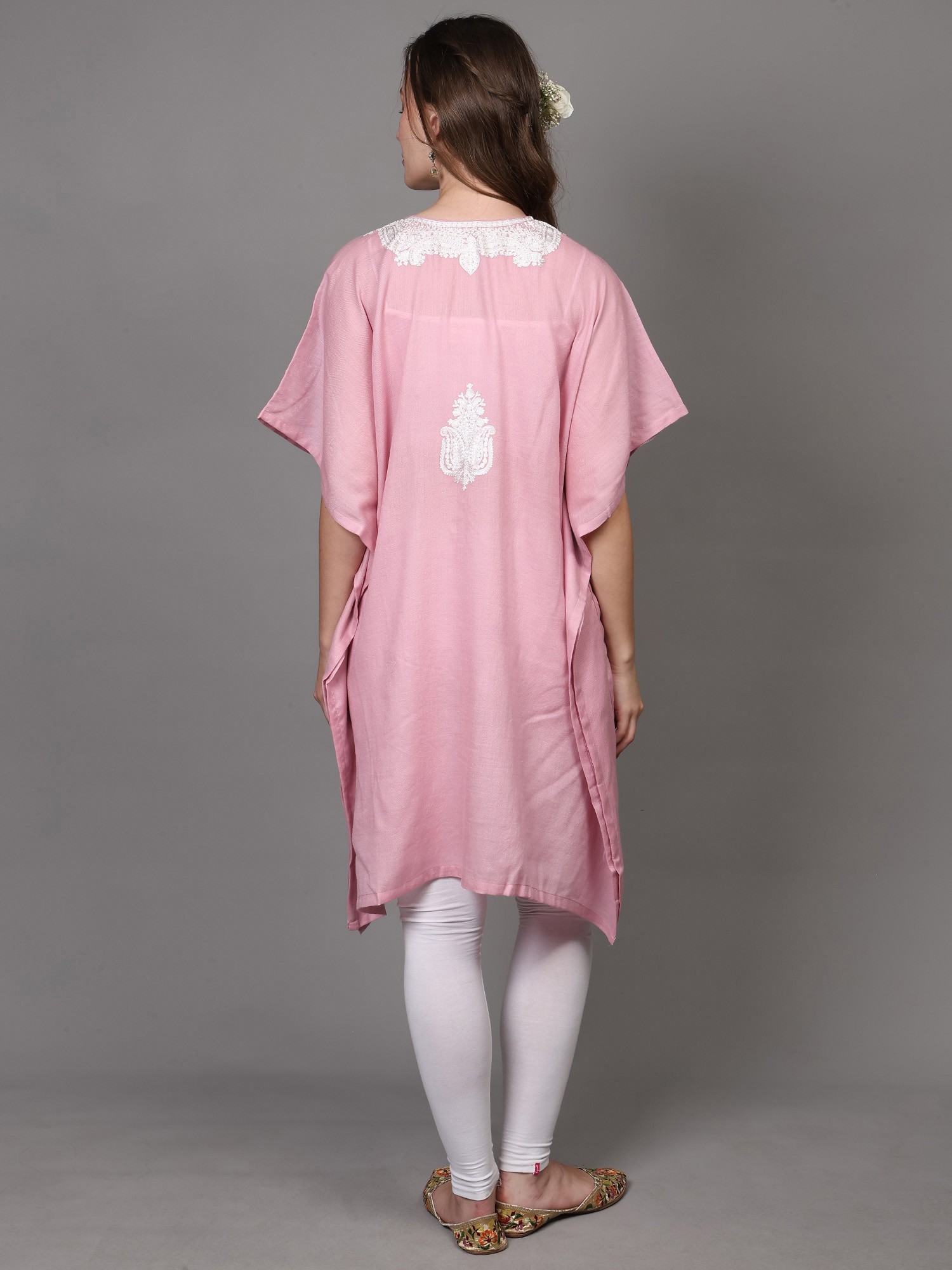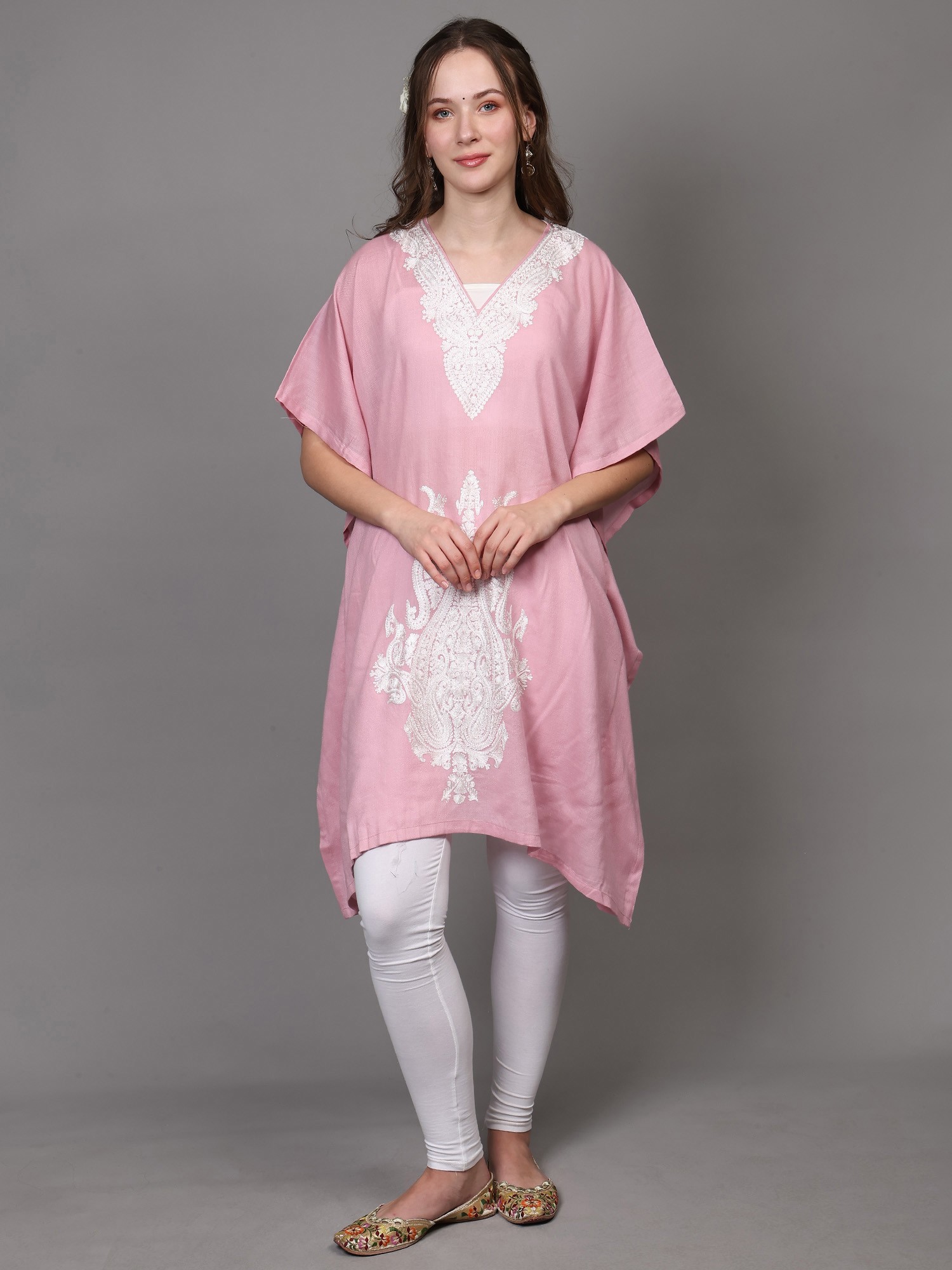 The kaftan's 40-inch length and 54-inch bust provide a relaxed, comfortable fit for a variety of body types. The easy-to-wear design makes it a versatile addition to any wardrobe. Pair it with leggings or jeans for a casual daytime look, or dress it up with elegant jewelry and heels for a sophisticated evening ensemble. Its timeless appeal transcends seasonal trends, making it a piece you'll reach for again and again. The pink hue adds a touch of femininity and complements a wide range of skin tones and personal styles.