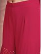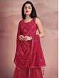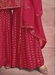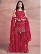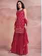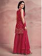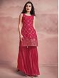 Bloom like the spring rose dressed in this gorgeous pink georgette designer sharara suit. The kurta with its mesh pattern and blossoming roses on the hem is an ode to the timeless charm of femininity. The sequined leaf creeper pattern on the sharara adds sparkle to the flowy fabric, which will make your every step stand out.