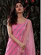The pink georgette Sharara suit also has a dreamy net dupatta which is embellished with glass imitations on the border and its body.