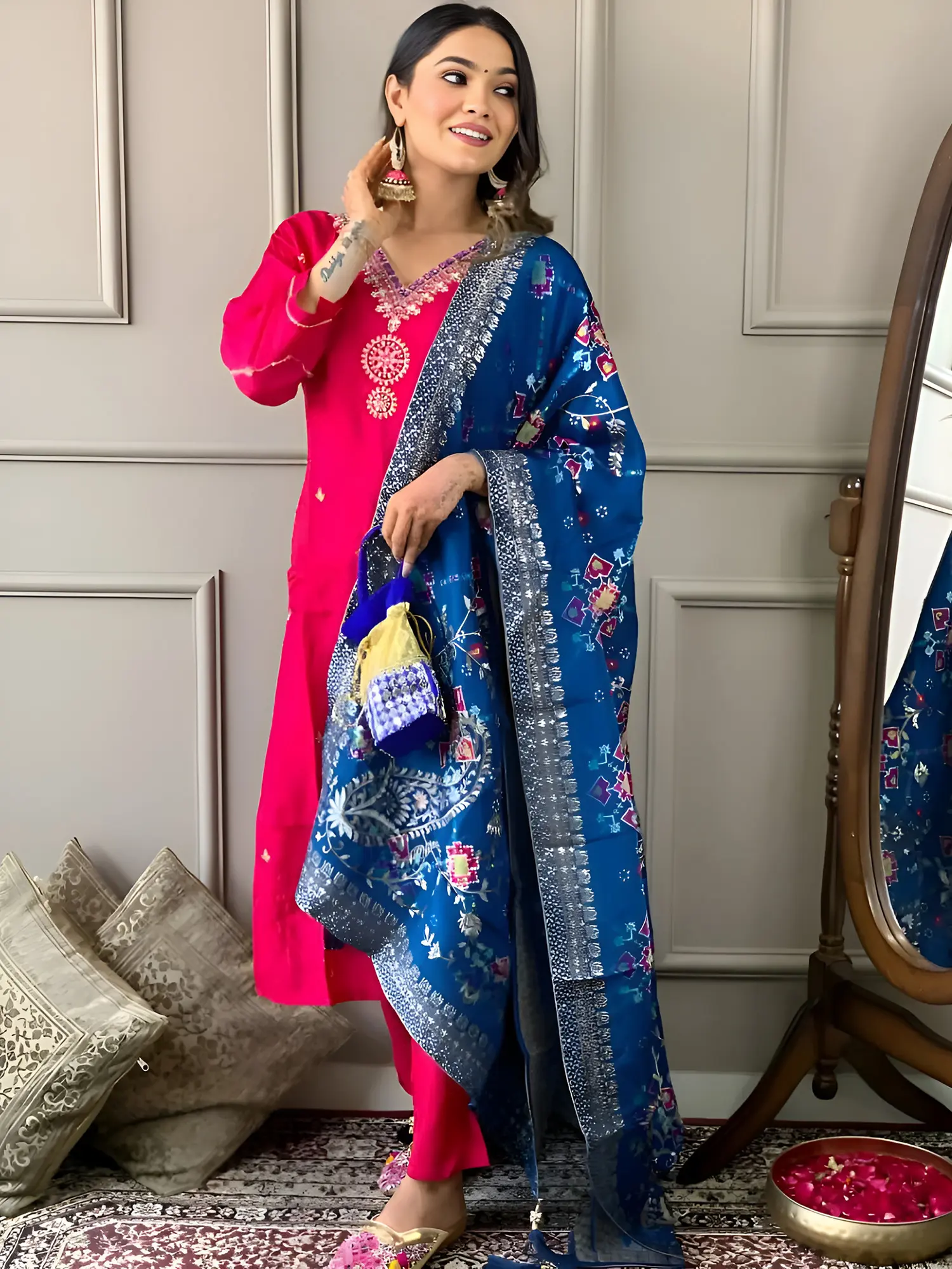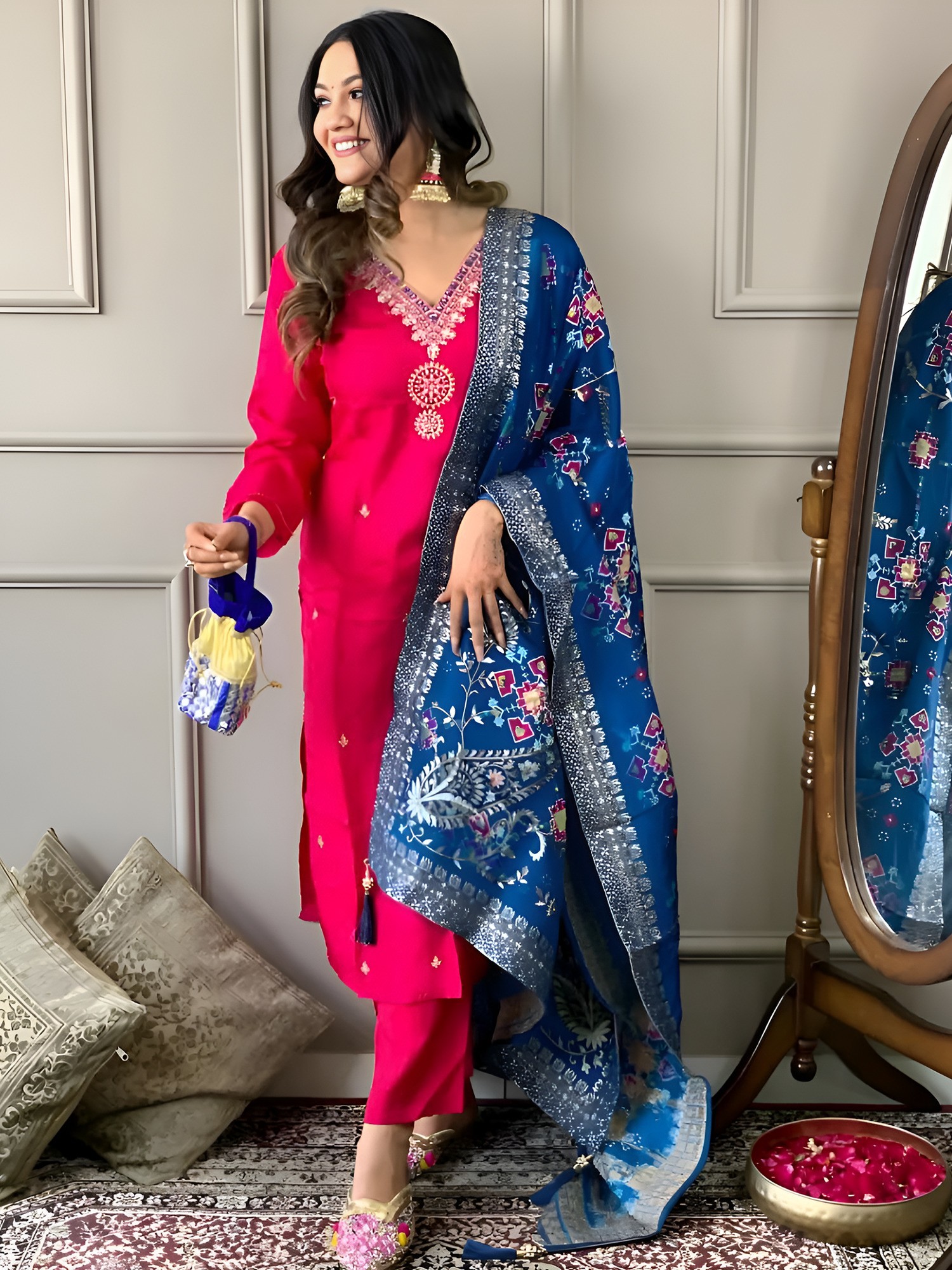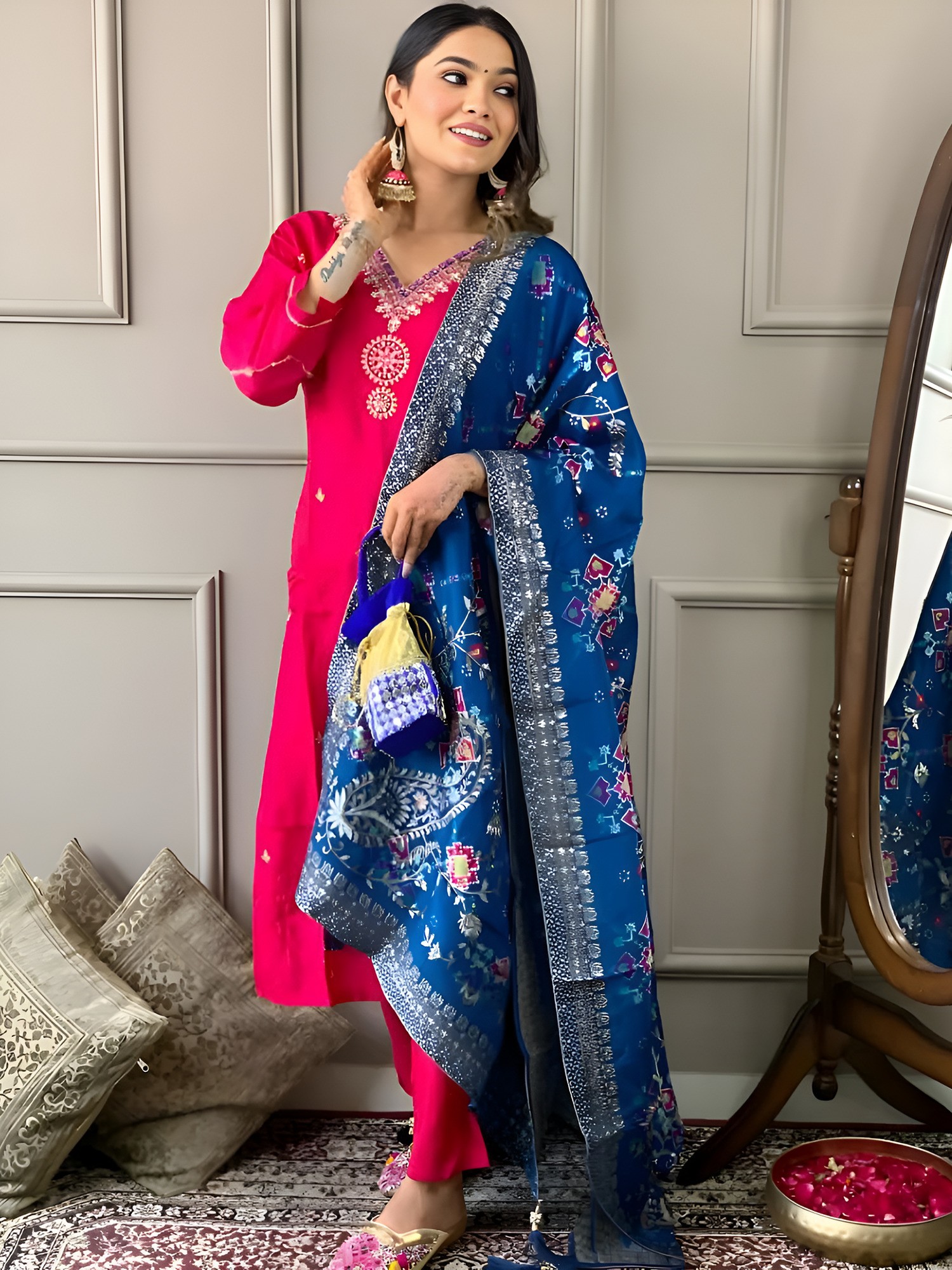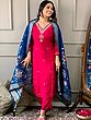 Three-Piece Salwar Kameez Suit with Dupatta and All-Over Intricate Multicolor Embroidered Flowers-Paisleys