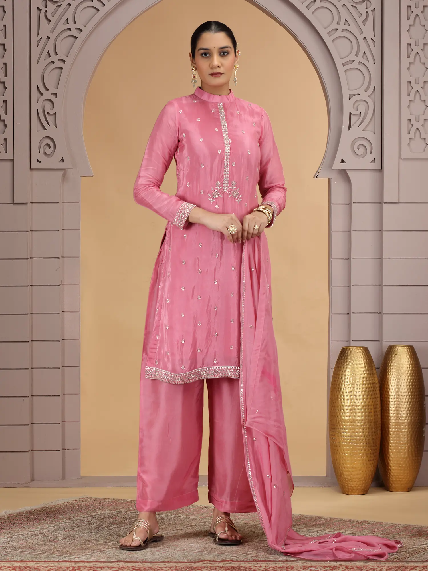 Each element of this ensemble is a testament to meticulous artistry. Crafted from lustrous satin silk, the fabric drapes beautifully, offering a soft, opulent feel against your skin. The intricate embroidery, featuring delicate sequins, beads, and fine threadwork, is meticulously applied by skilled artisans, showcasing a dedication to traditional techniques.