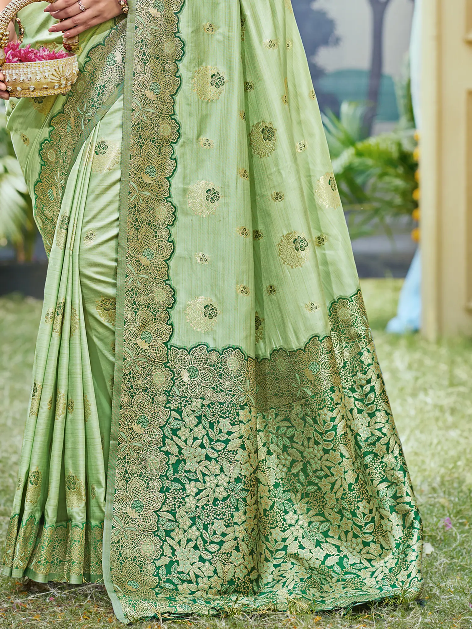 This designer embroidered floral border Banarasi silk saree is more than just an article of clothing; it's an heirloom-quality piece that will be cherished for years to come. Its timeless design and superior craftsmanship ensure that it remains eternally stylish and relevant, a testament to its enduring beauty. Invest in a piece of elegance that will become a treasured addition to your wardrobe.