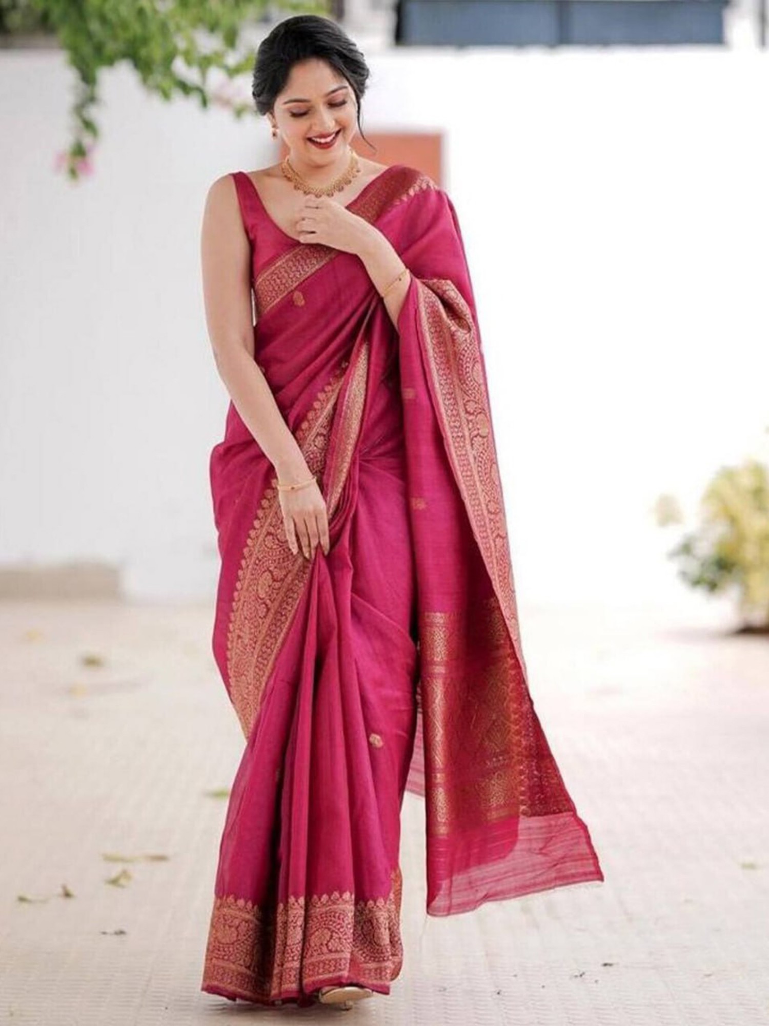Drape yourself in the captivating allure of this exquisite silk saree, a masterpiece designed to make you shine at any celebratory occasion. The soft, rich pink hue exudes a gentle warmth, reminiscent of blooming roses and twilight skies, creating a sophisticated and feminine aura. Crafted from the finest silk, this saree promises a luxurious feel against your skin, ensuring comfort and a graceful drape that moves with you.