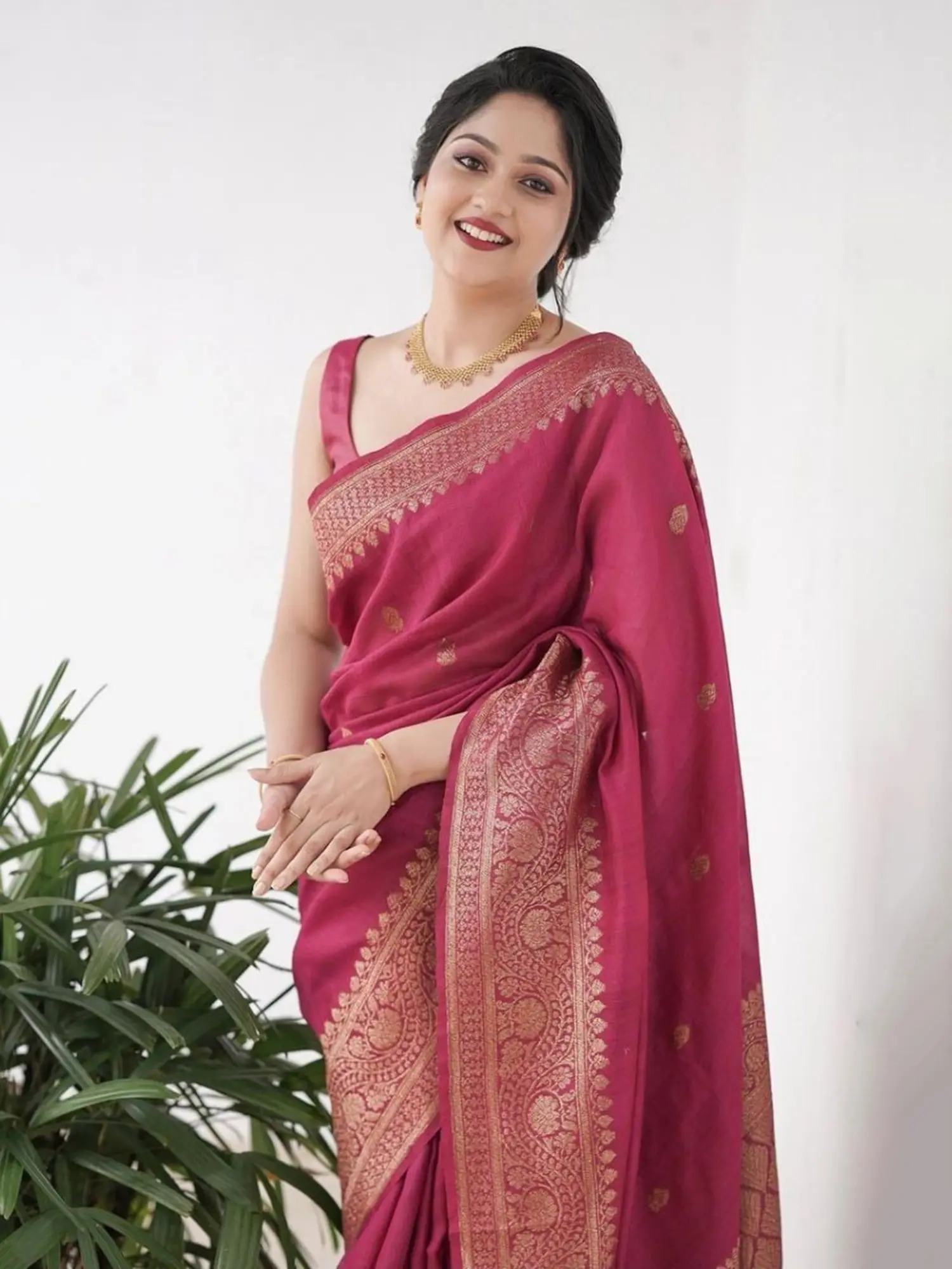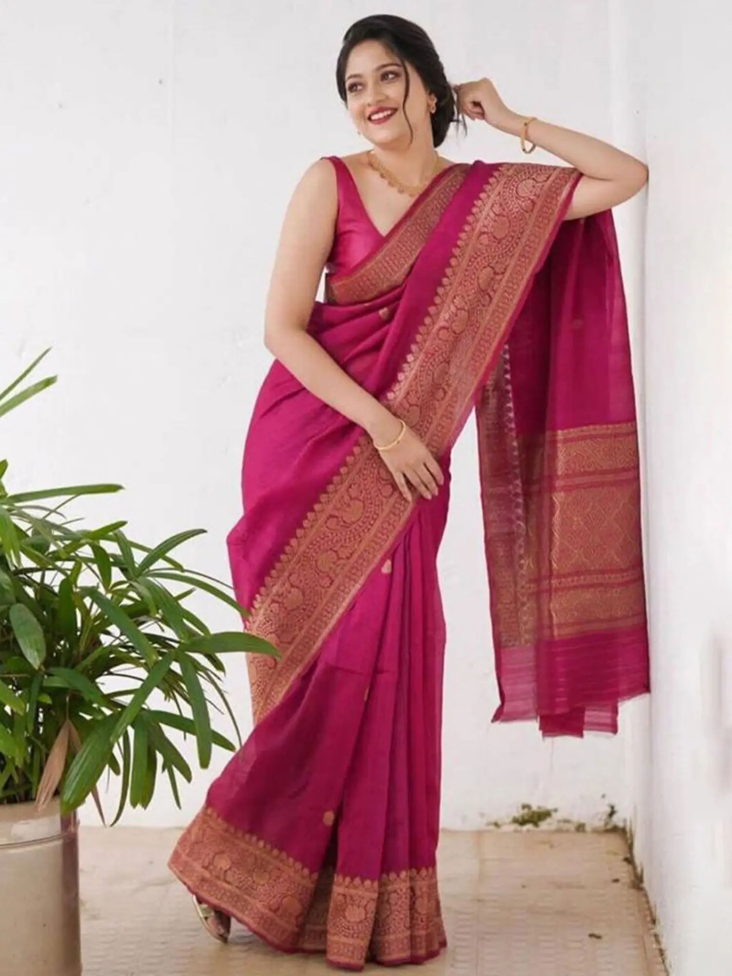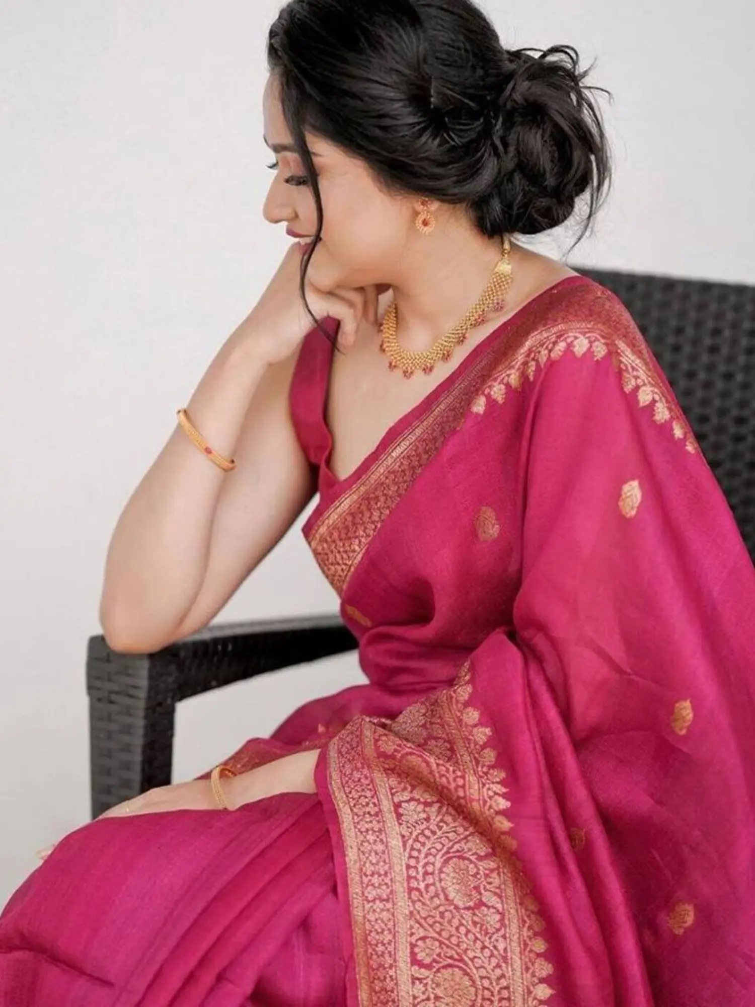 The true artistry of this saree lies in its stunning pallu and border, adorned with intricate jacquard weaving. The detailed patterns, rendered in a shimmering gold thread, create a mesmerizing contrast against the vibrant pink silk. Each motif is a testament to the skill of master weavers, showcasing traditional designs that are both timeless and elegant. The richness of the gold detailing adds a touch of opulence, making this saree a true statement piece. Whether it's a wedding ceremony, a festive gathering, or a special party, this saree is designed to turn heads and garner admiration.