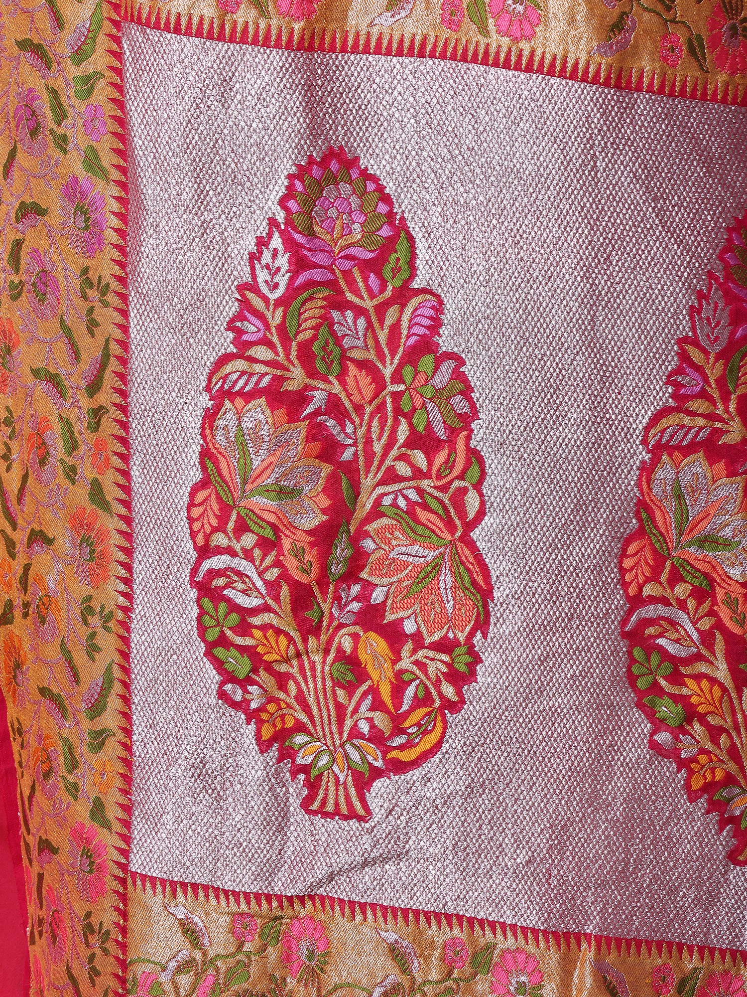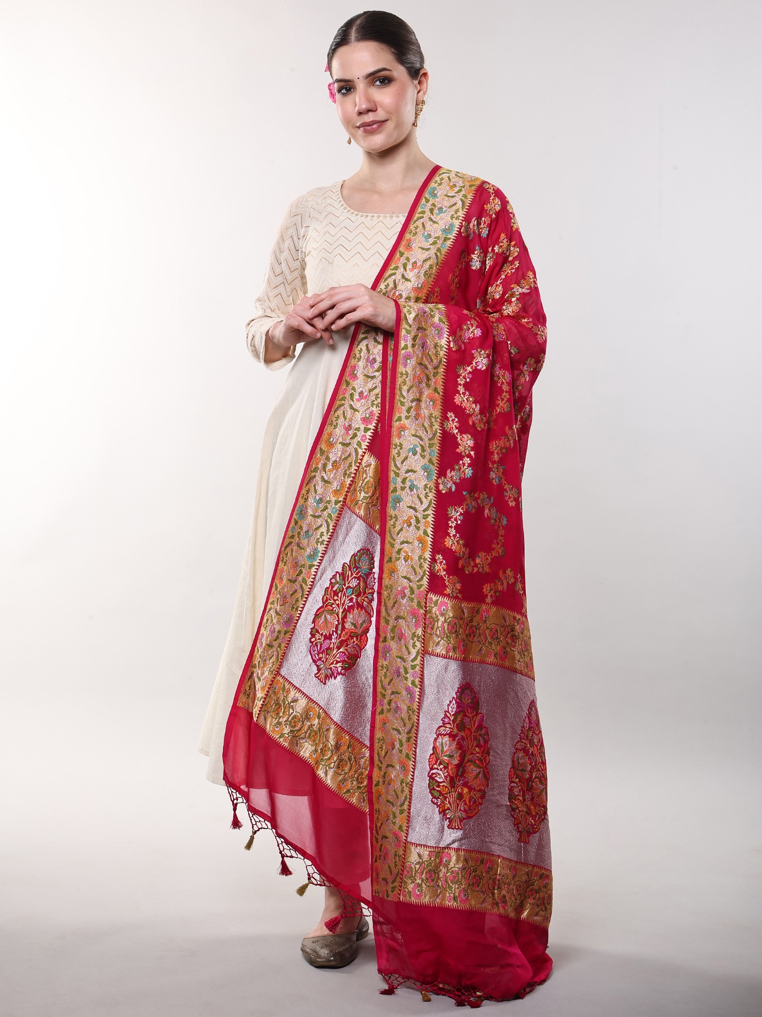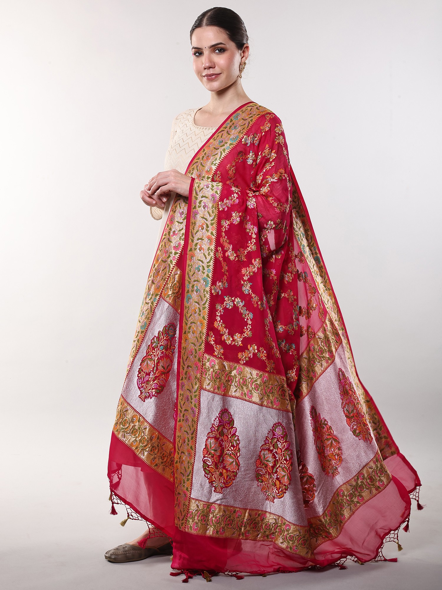 Pink-Yarrow Brocaded Meenakari Pure Chiffon Dupatta with Zari Woven Flowers