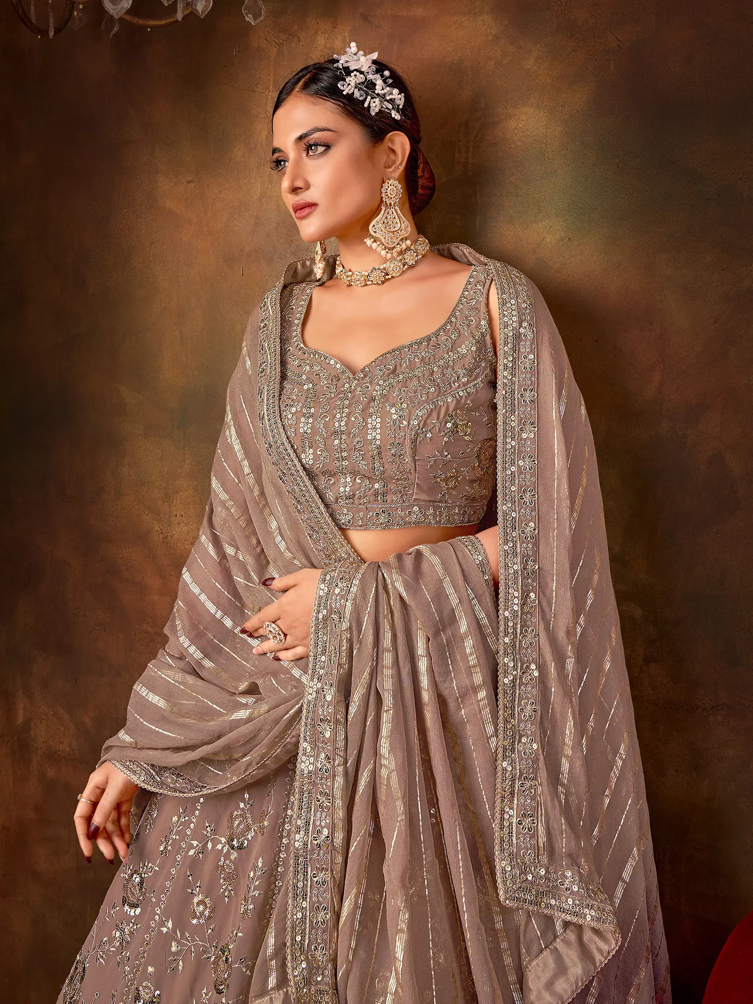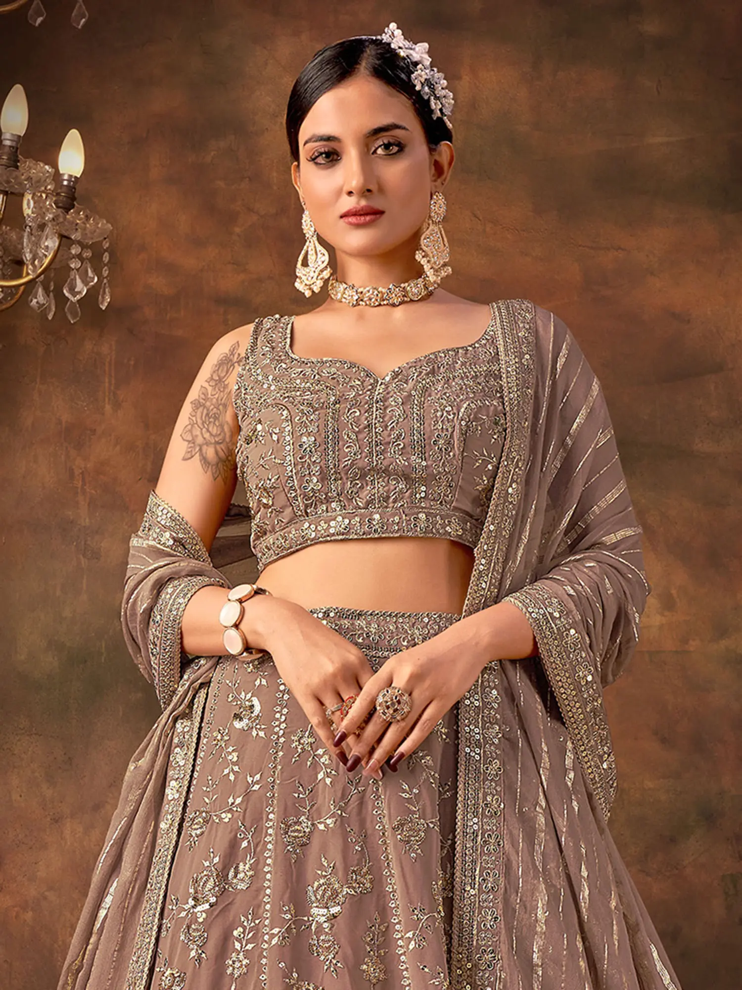 Step into a world of refined sophistication with this exquisite Lehenga Choli set, a masterpiece designed to capture attention and radiate grace. Crafted from delicate faux georgette, this ensemble offers a beautiful drape and a luxurious feel, making it the perfect choice for any celebratory occasion. The captivating pinkish-brown hue serves as a canvas for an intricate all-over floral motif, meticulously embroidered with shimmering sequences that catch the light with every movement.