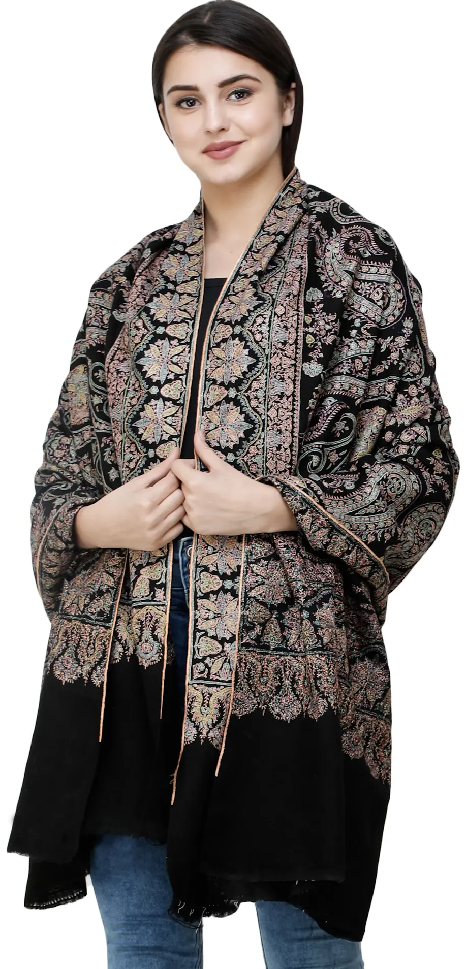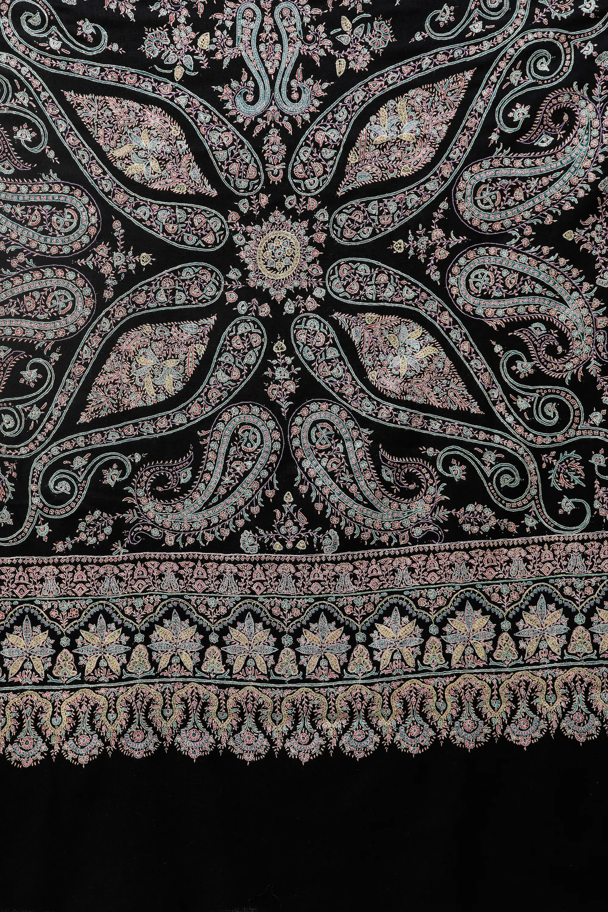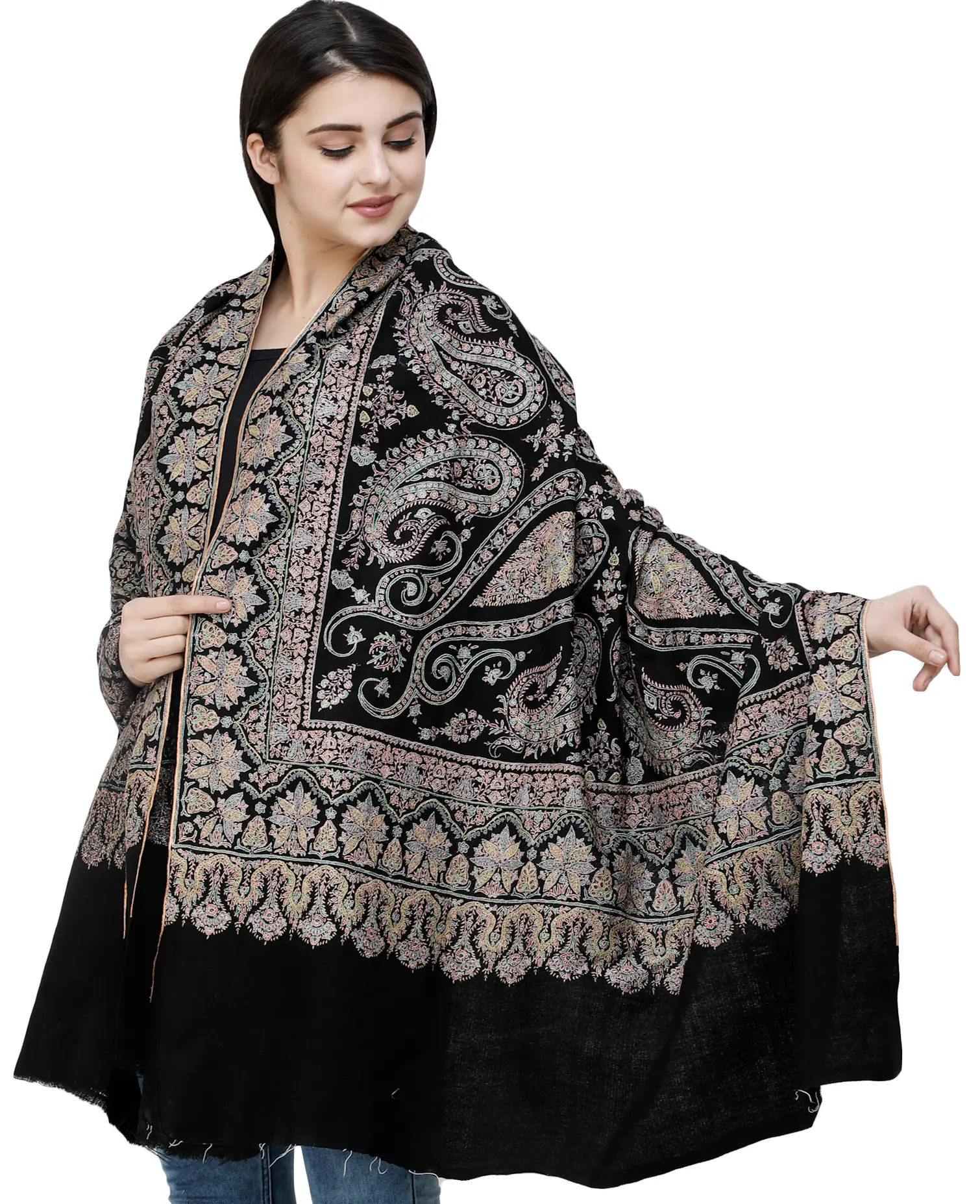 Zoom in on the embroidery to take in the delicate beauty of sozni, a technique of tribal origins that gives stunning results on pashmina. The motifs are traditional - curvaceous paisleys, leaves with complex embroidery within, and embroidered tendrils with a high-precision finish. The thick border comprises of rows of symmetrical foliage that serves to contain the magnificence of the handiwork in the field. Because pashmina is a statement in itself, this number is best teamed with an understated evening saree or suit.