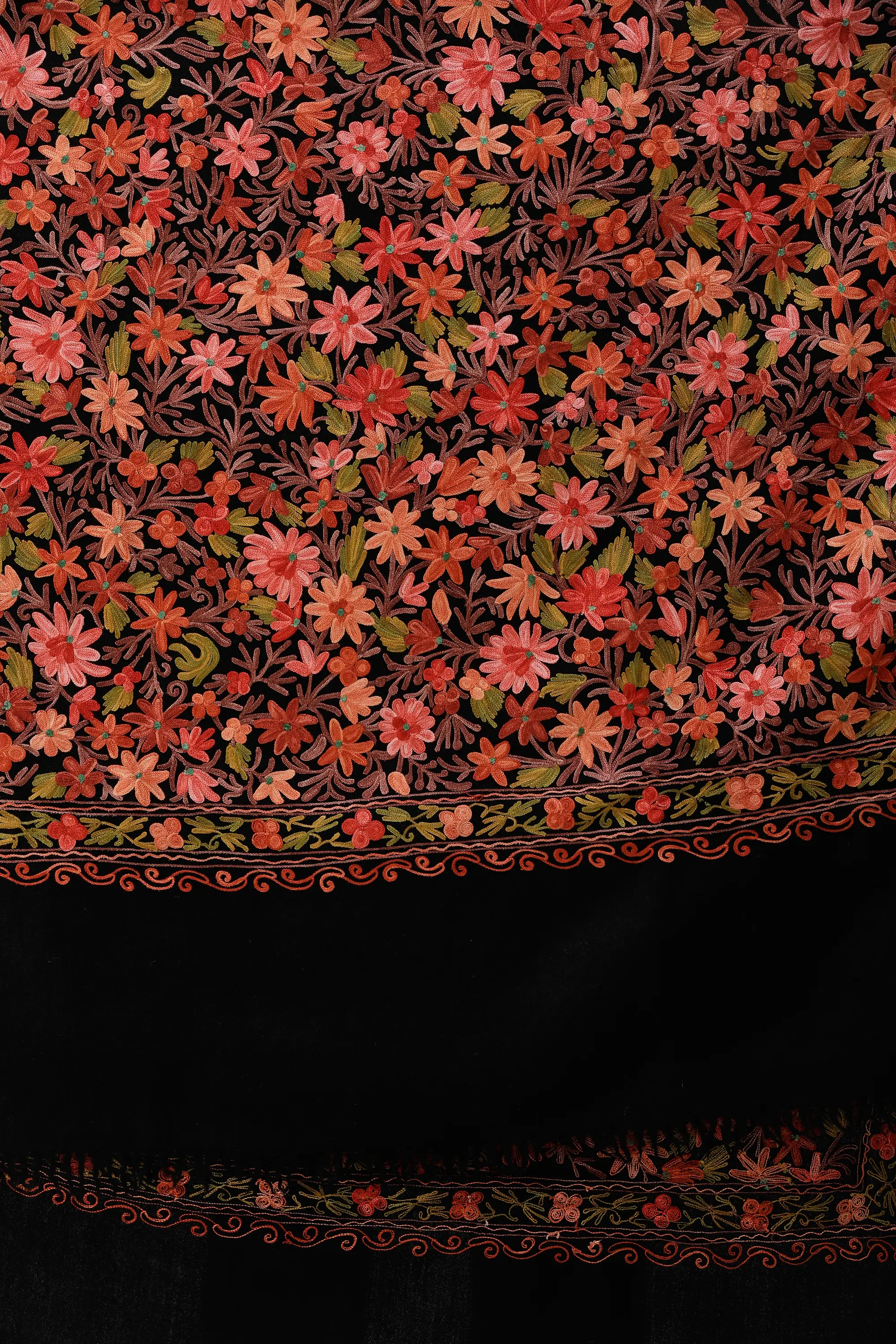 Jet-Black Plain Pashmina Shawl from Kashmir with Intricate Sozni Embroidered Flowers on Border