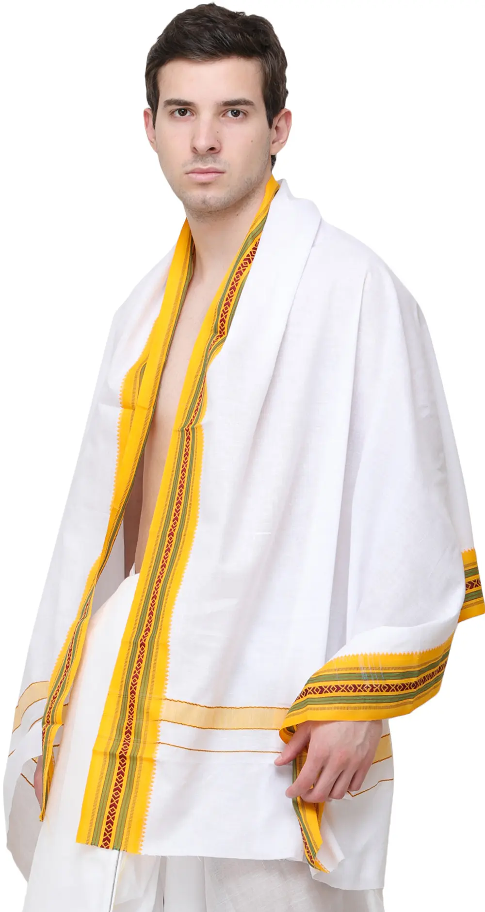 In Hindu culture, the combination of red and white is considered fortunate. For religious events, both men and women choose to wear red-bordered white cloth. This magnificent Plain Angavastram with a bold red border and yellow motifs is the ideal combination of beauty and heritage. Apart from having a bright appearance, the piece features a soft and luxurious fabric that drapes effortlessly over the shoulders. The intricate multi-colored thread woven border adds a vibrant touch to its timeless design. Whether worn for special occasions or daily wear, this Angavastram enhances the style with its understated charm.