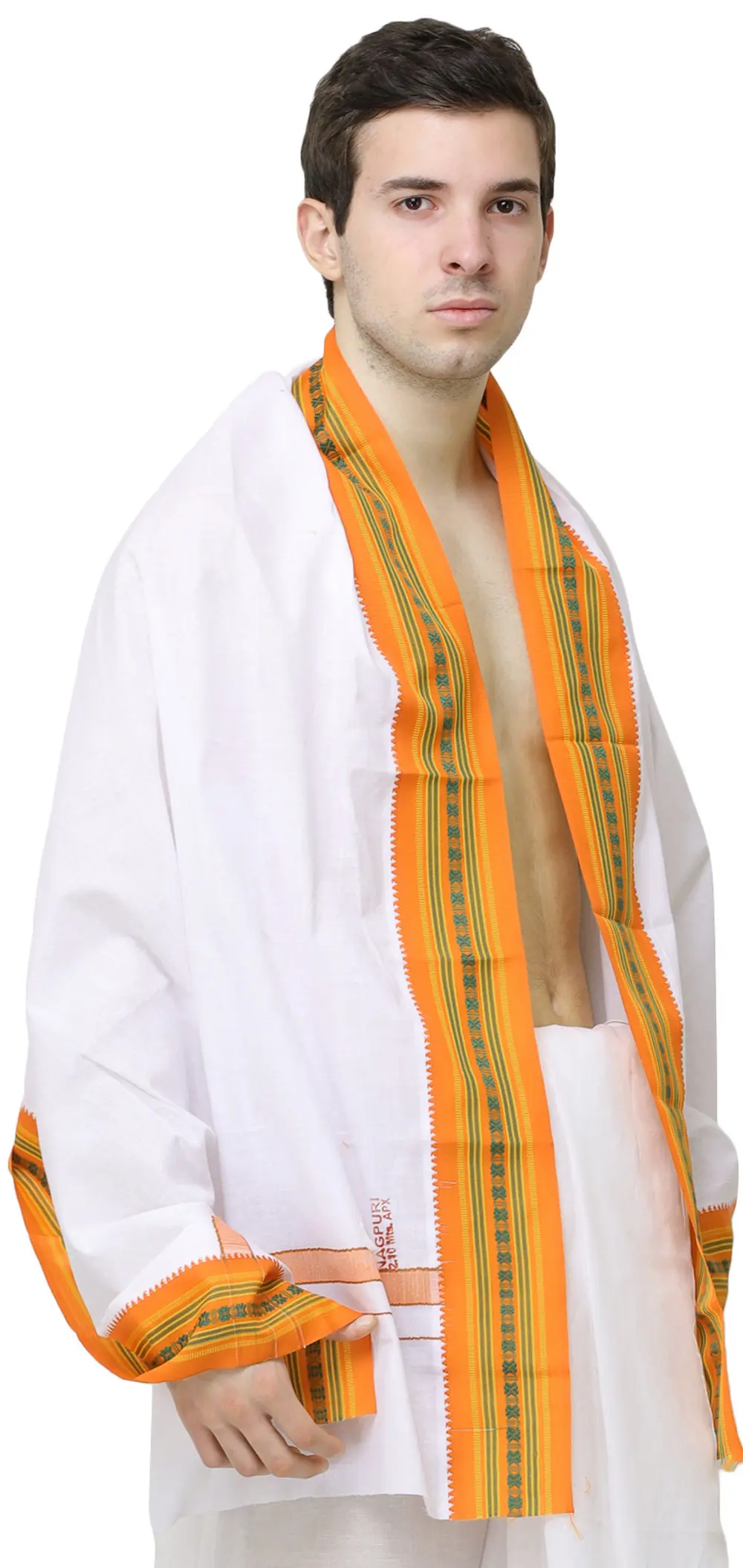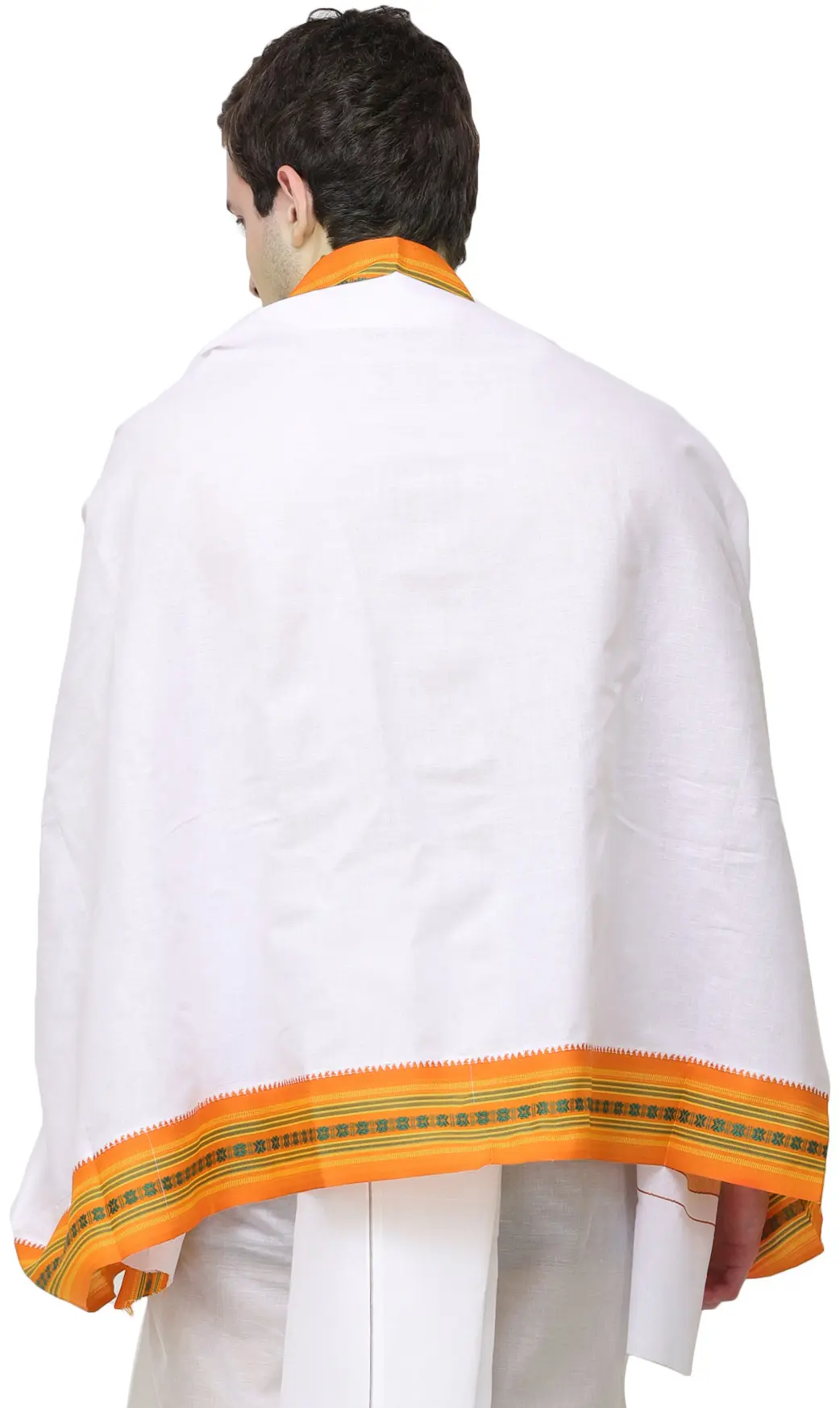 Discover the essence of traditional Indian attire with this exquisite Angavastram. Crafted from the finest pure cotton, this garment offers unparalleled comfort and breathability, making it an ideal choice for both festive occasions and everyday wear. The pristine white fabric serves as a perfect canvas, highlighting the rich, vibrant border that adorns it.