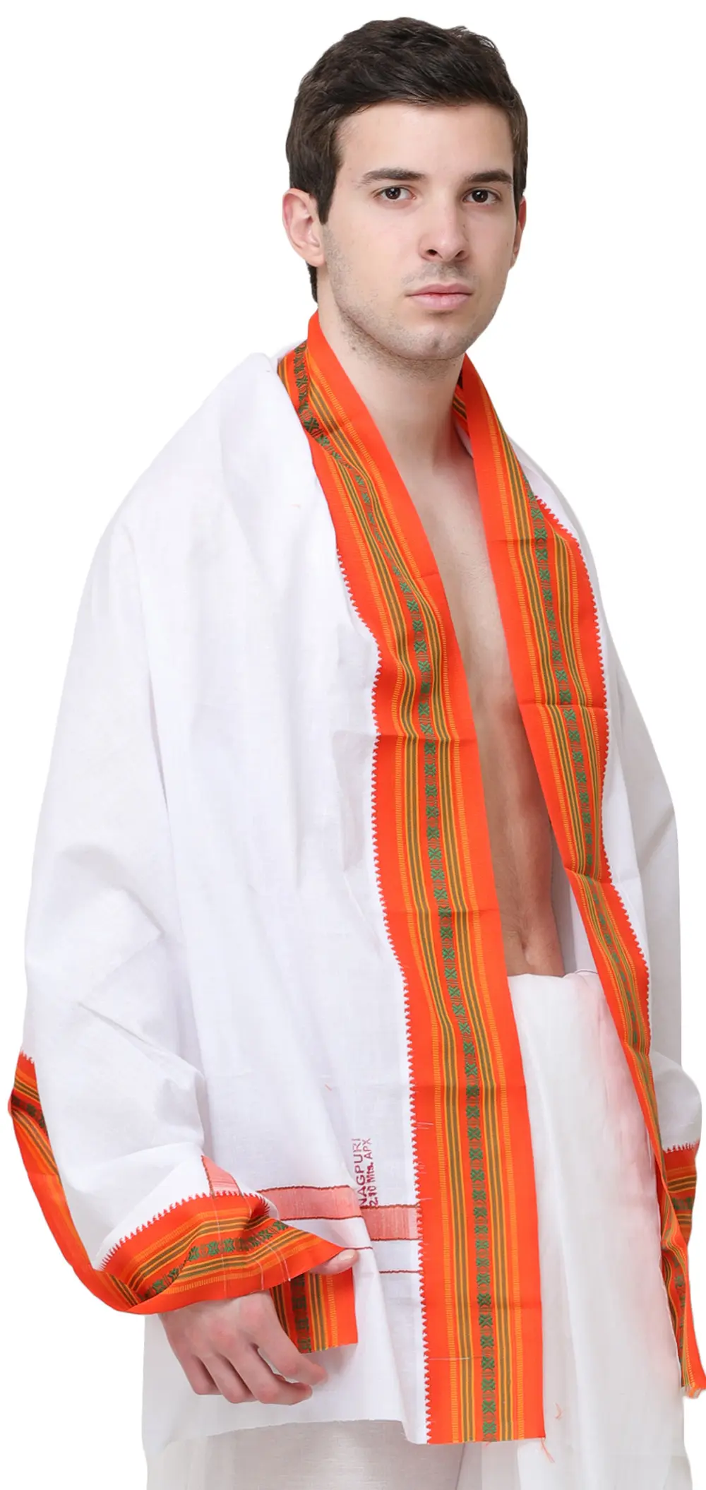 Discover the essence of traditional Indian attire with this exquisite Angavastram. Crafted from the finest pure cotton, this garment offers unparalleled comfort and breathability, making it an ideal choice for both festive occasions and everyday wear. The pristine white fabric serves as a perfect canvas, highlighting the rich, vibrant border that adorns it.